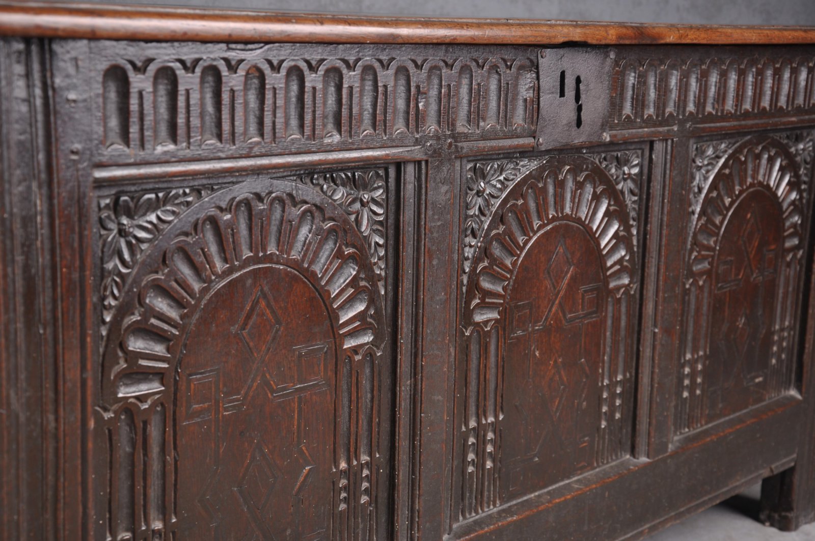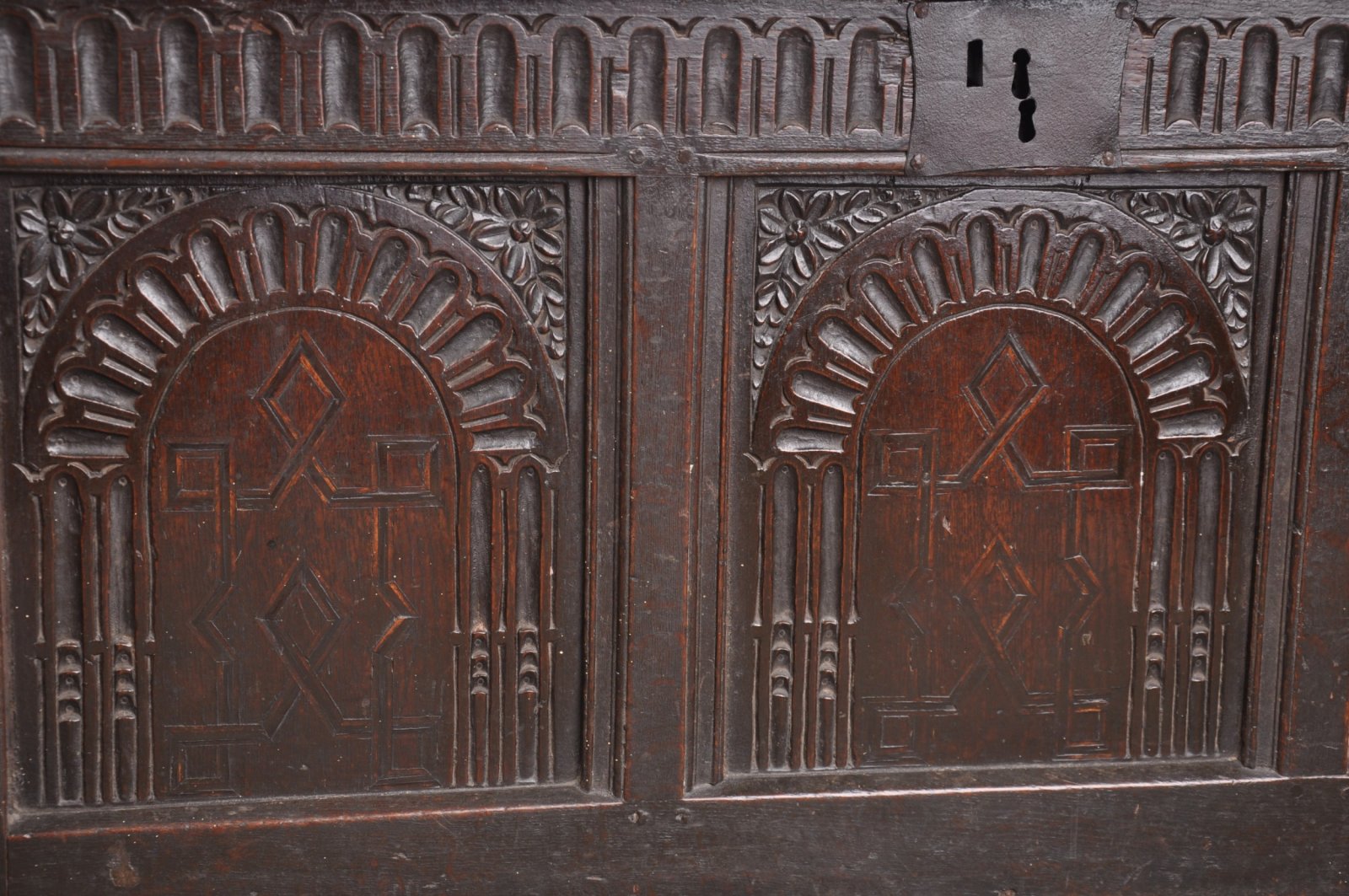 A rare and lovely late 16th Century Elizabeth I Oak Coffer of good colour, the arcaded panels with geometric inlay to the centres.