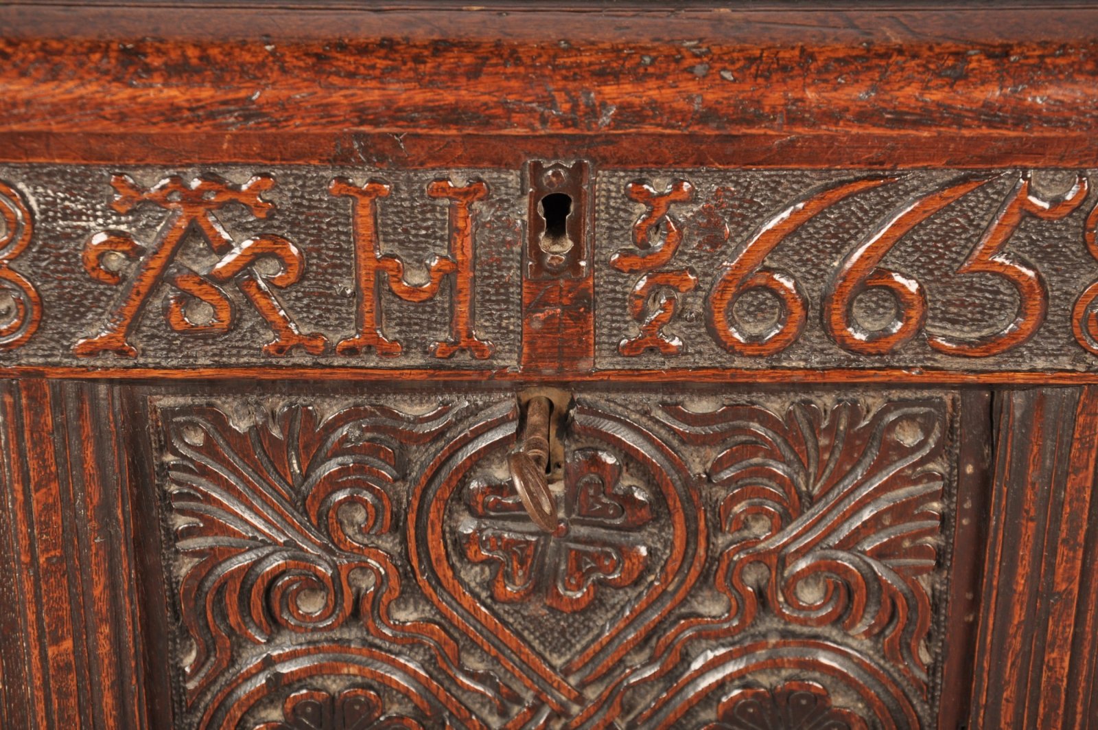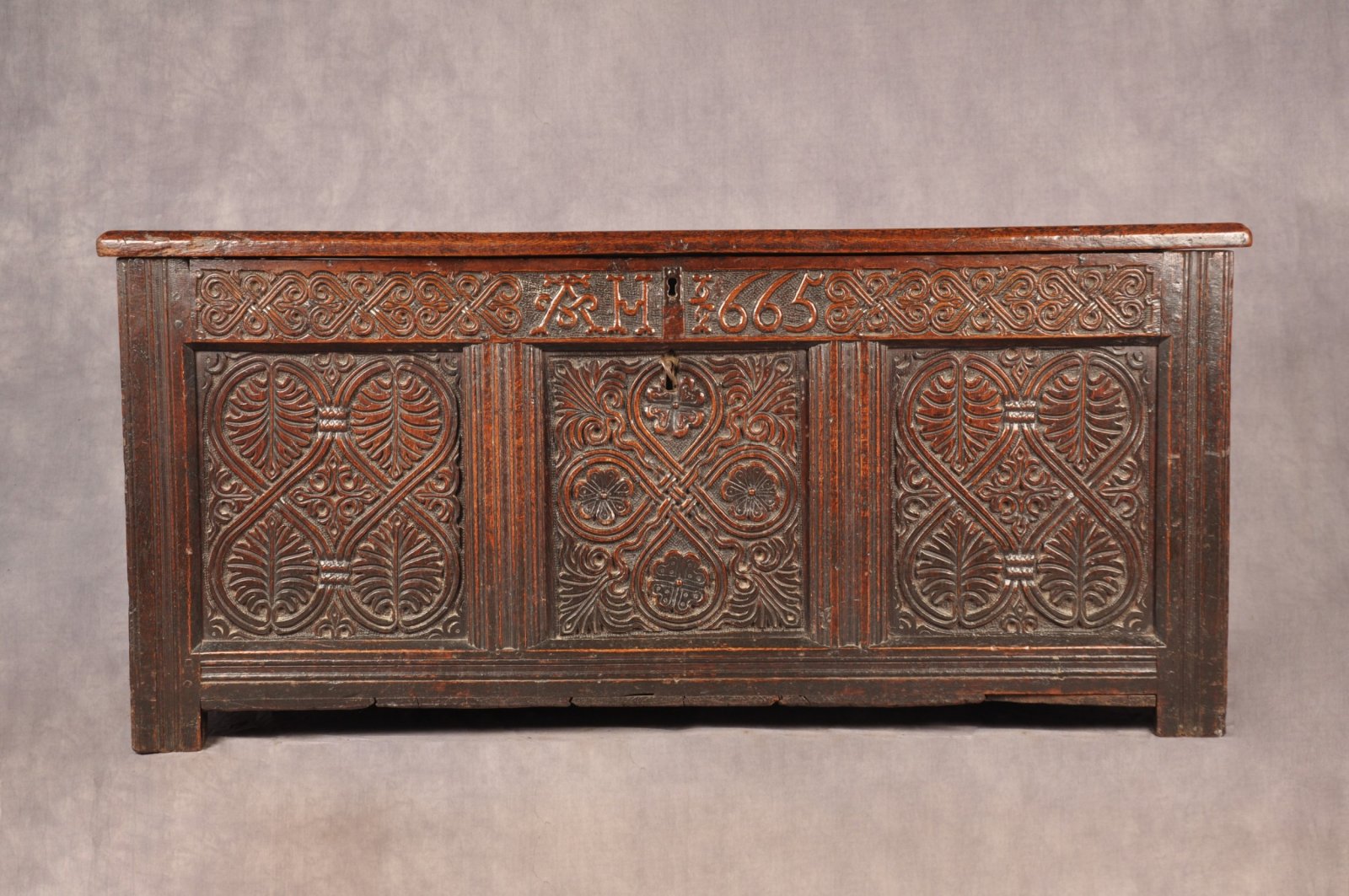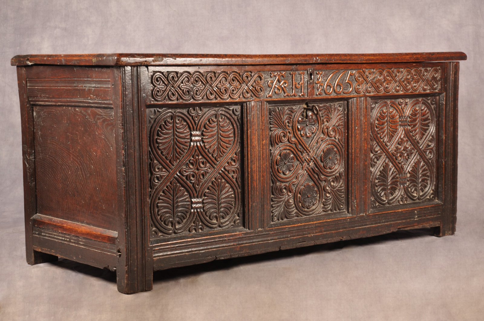 A rare Charles II 17th Century Oak Coffer made in the typical Lake District manner having finely carved front with interwoven Celtic patterns. Initialed A H and having a good early date of 1665, which was the year of the great plague.