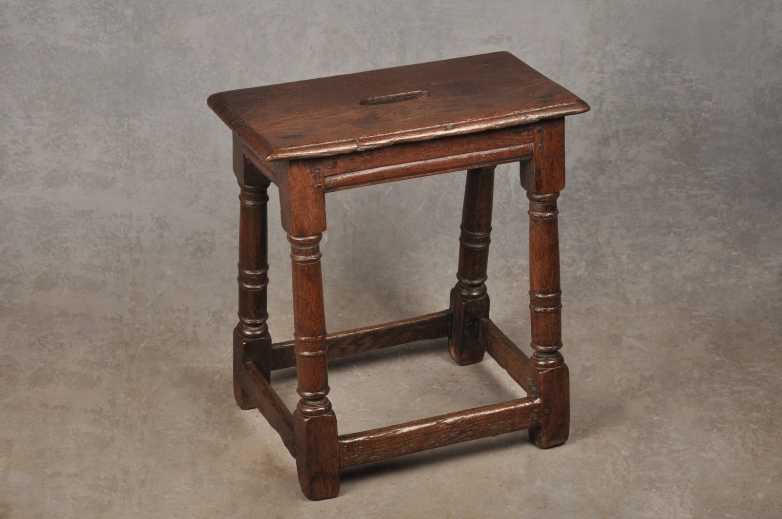A 17th Century Oak Joint Stool of good colour and patina, in original condition apart from the handle hole that has been cut into the original top many years ago.