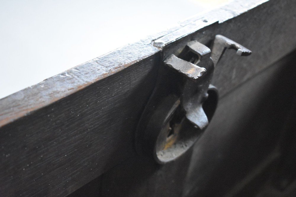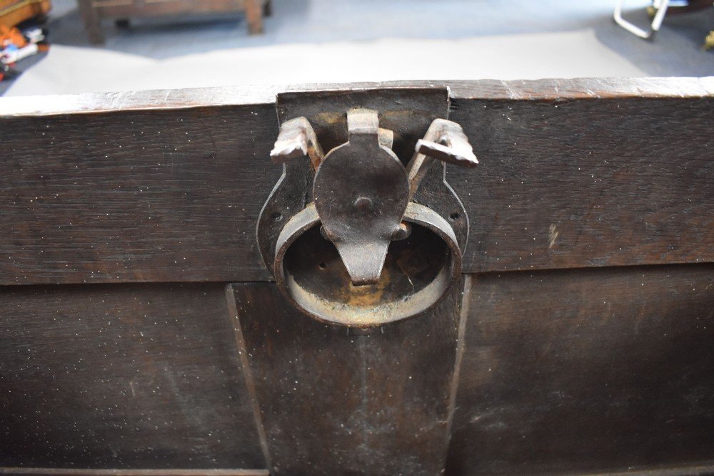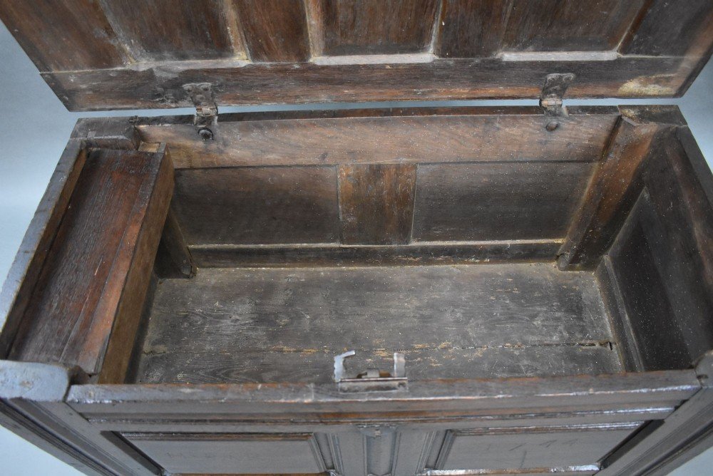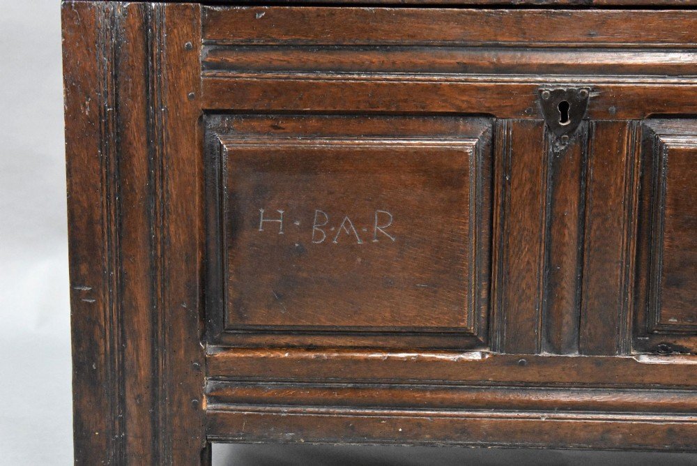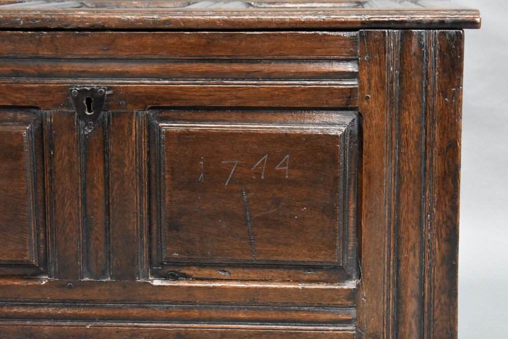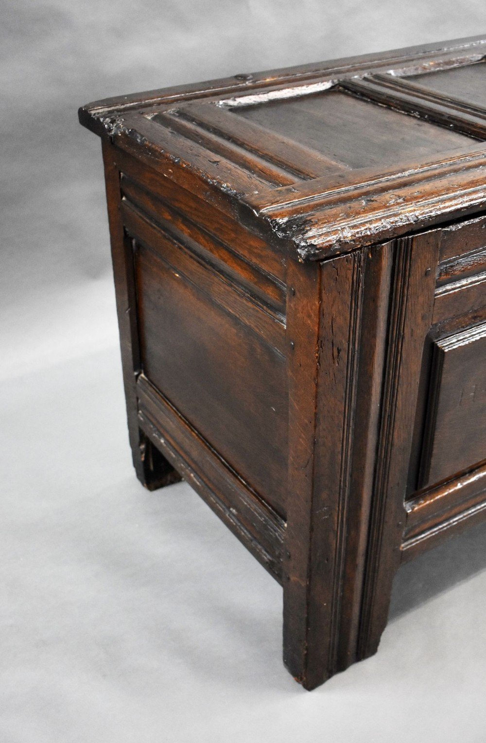 For sale is a good quality mid 17th century oak marriage chest, having a three panel top with raised and fielded panels to the front, with a carved date of 1744 and the initials H.B.A.R, probably to commemorate a marriage.