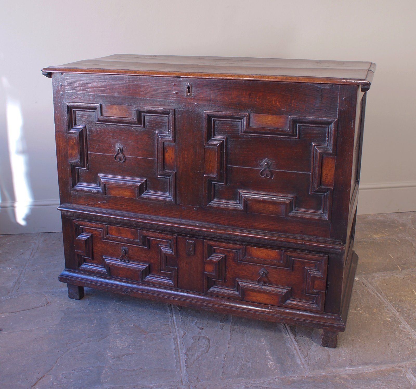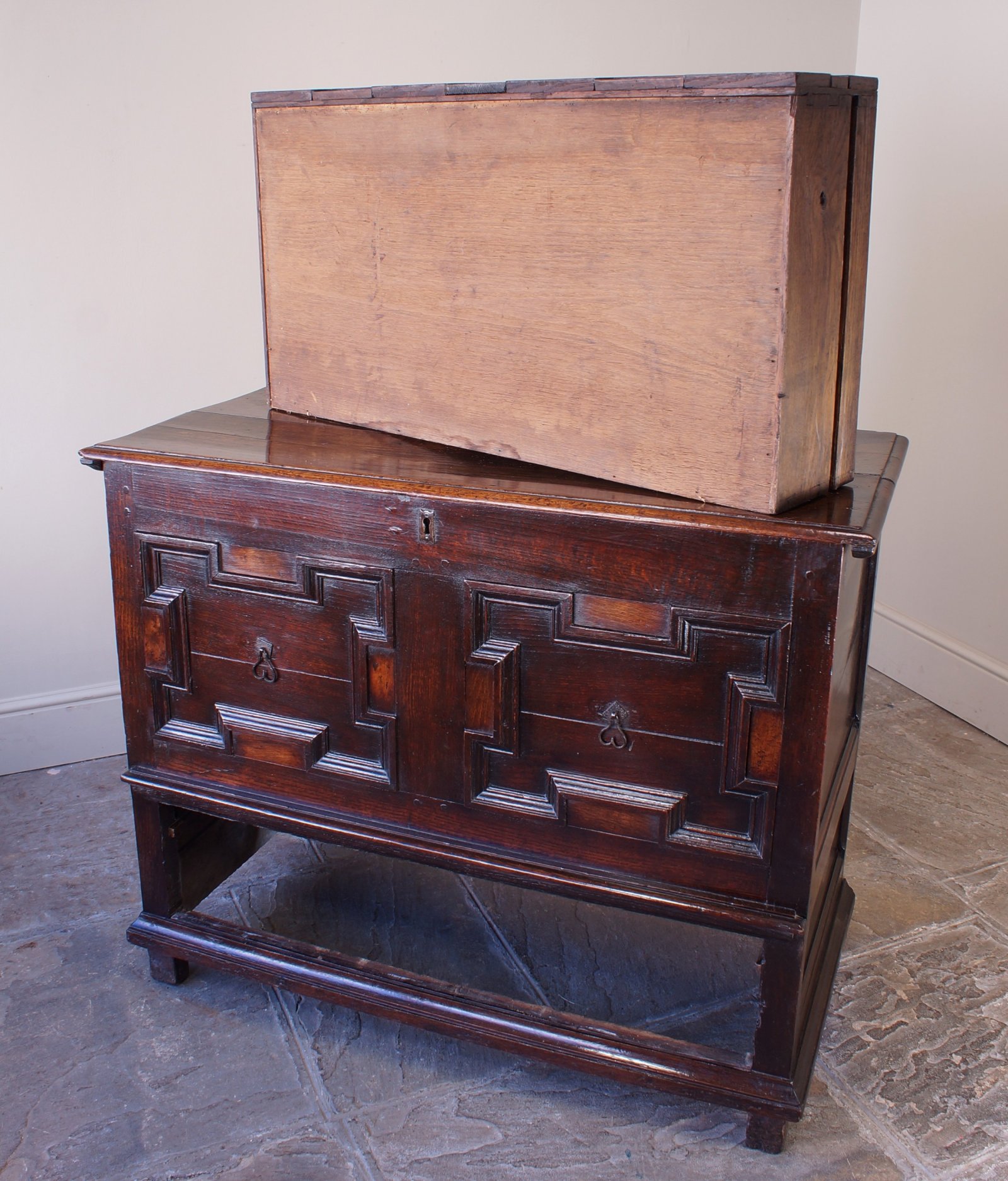 A good Charles II geometrically moulded mule chest.
