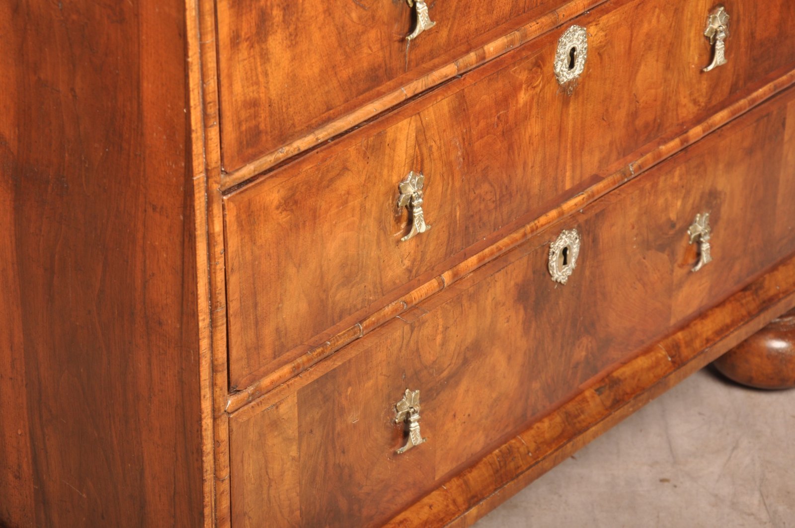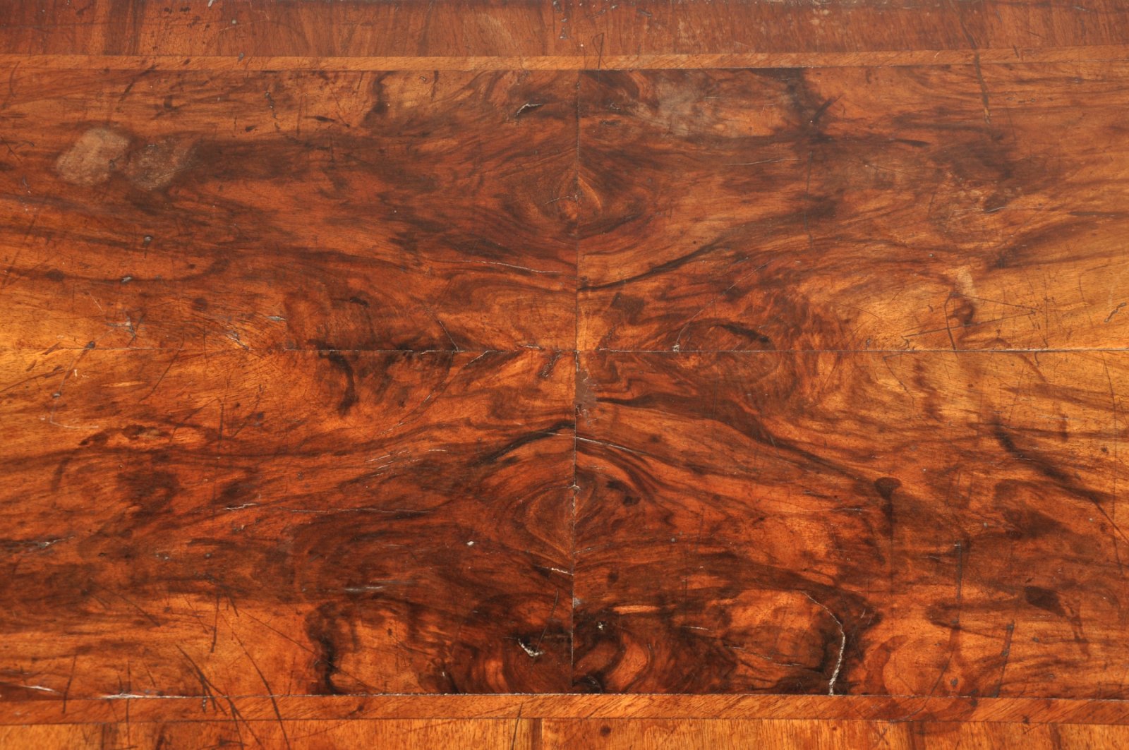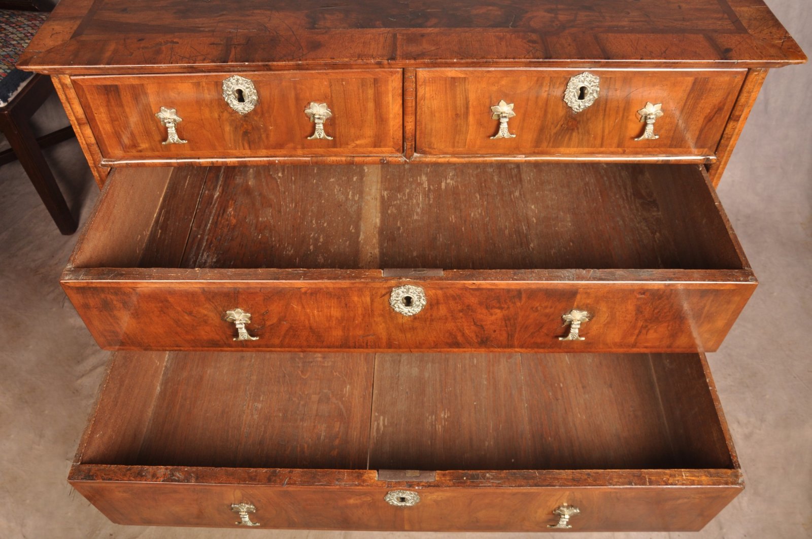 Having two short and three long graduated drawers with figured matched walnut veneers and feather banding. The highley figured top with a four pieces of matched veneer with feather banding and cross banding. Having cross grain mouldings to the top and base and fitted with cross grain half round mould to the drawer partitions, standing on later bun feet. The original oak drawer linings are in good clean condition throughout and the drawers run smoothly.