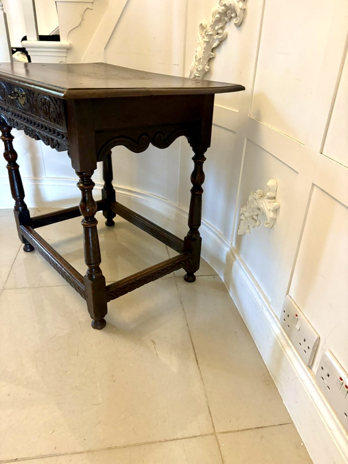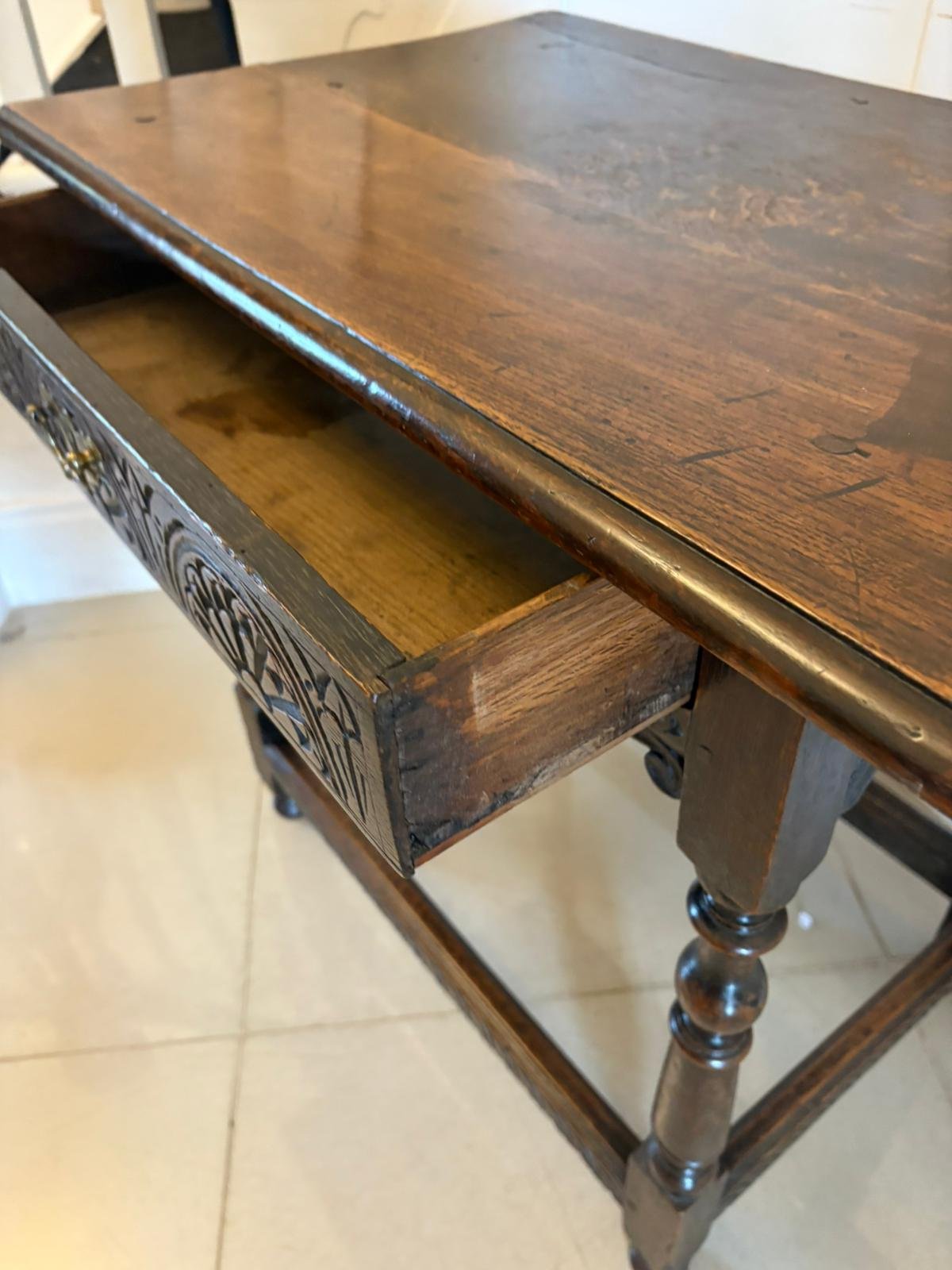 18th century antique quality carved oak side table having a quality oak top with a moulded edge above a single carved oak drawer with original brass handle supported by turned tapering columns standing on turned feet united by a carved oak stretcher.