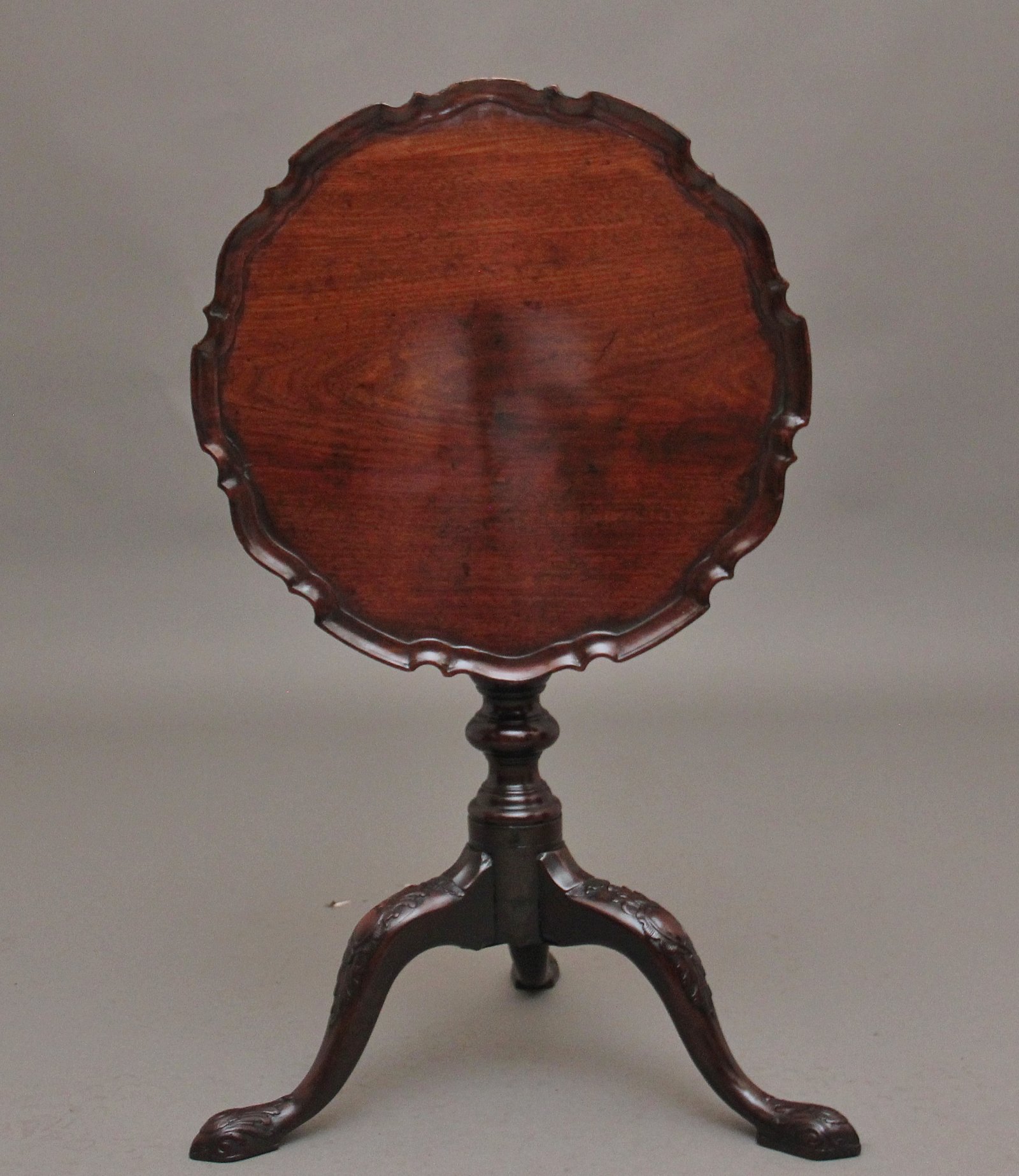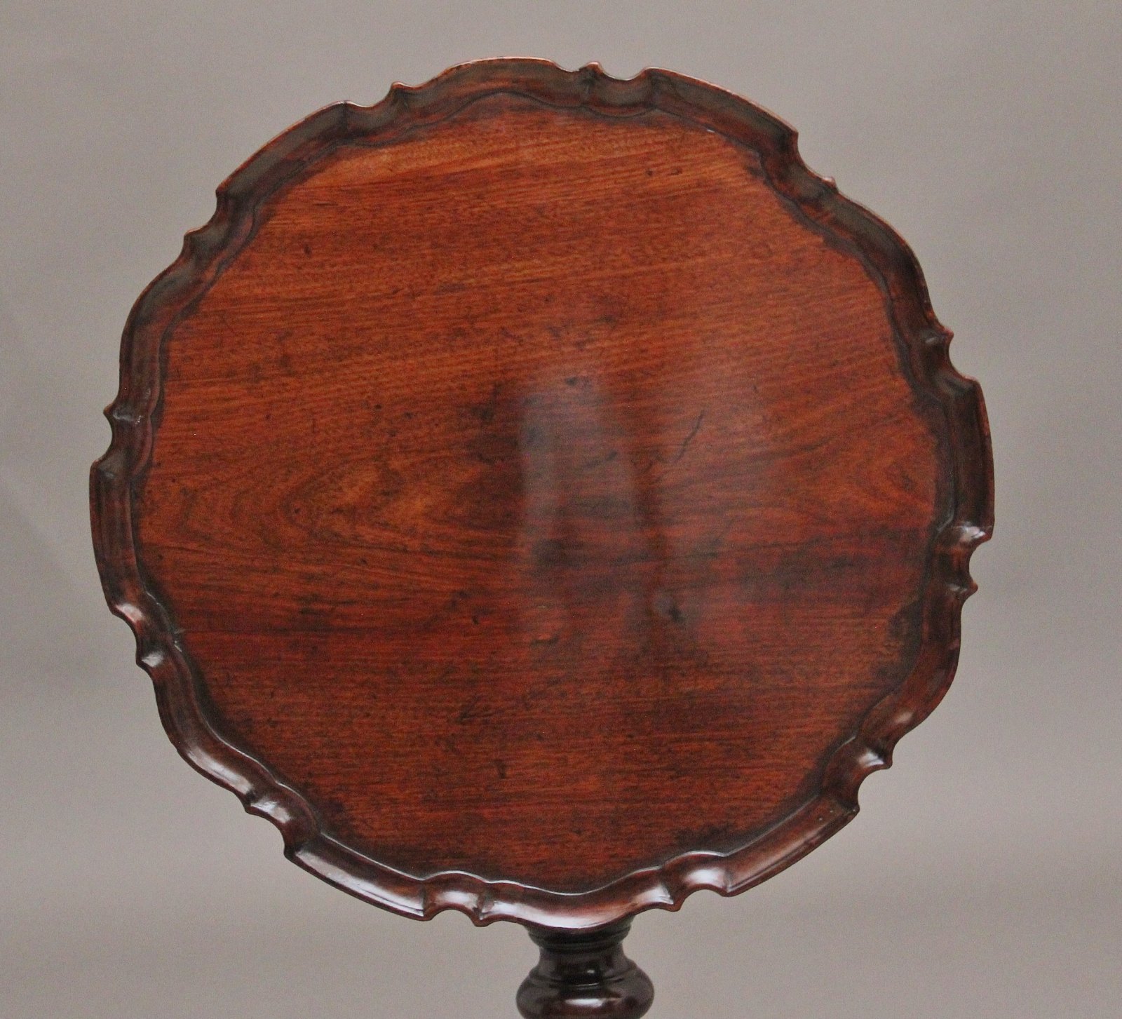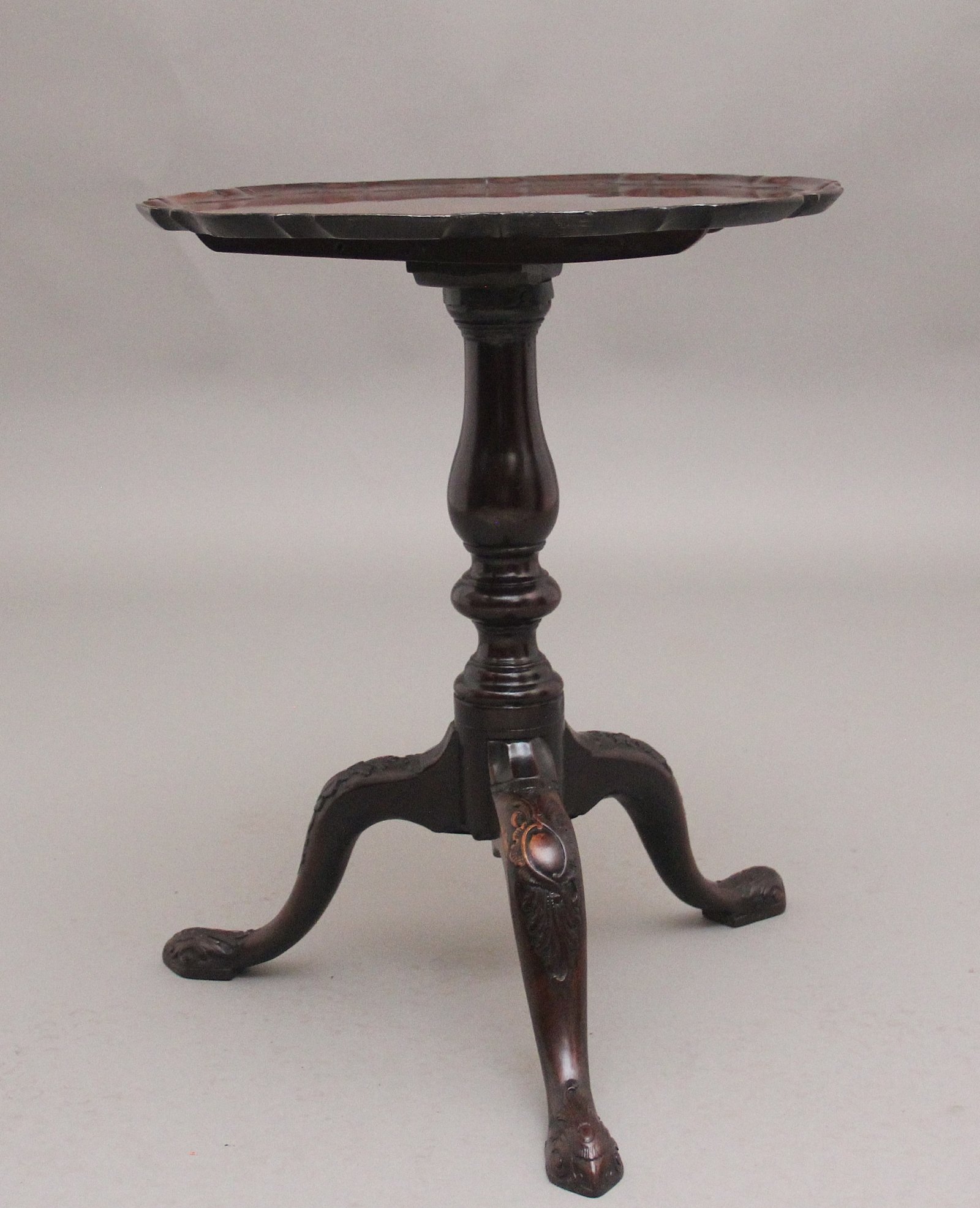 18th Century mahogany tripod table having a wonderfully figured top with a piecrust edge, supported on an elegant turned column terminating with three slender shaped and carved legs. Having a lovely warm rich mahogany colour and in excellent condition. Circa 1780.
