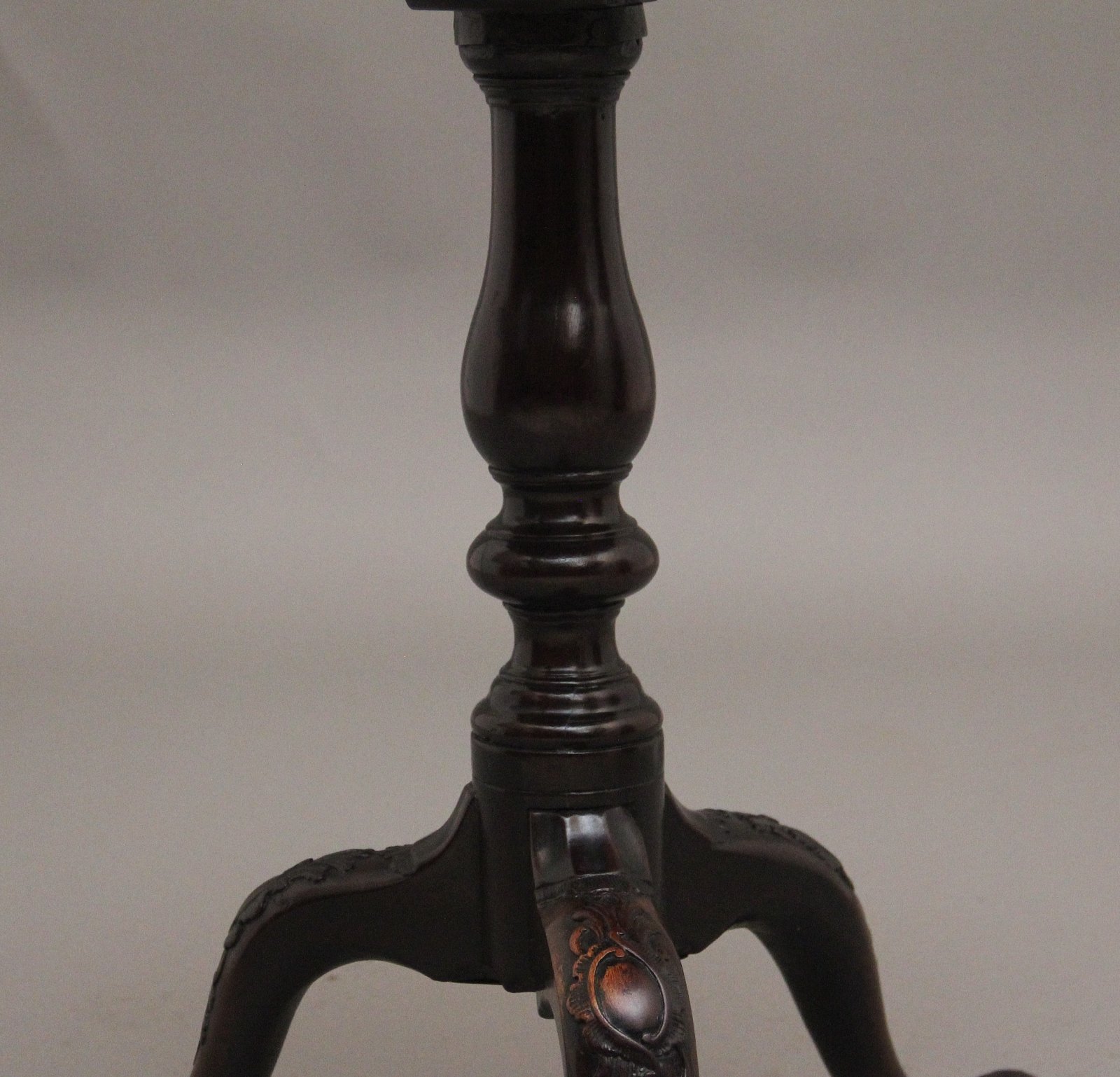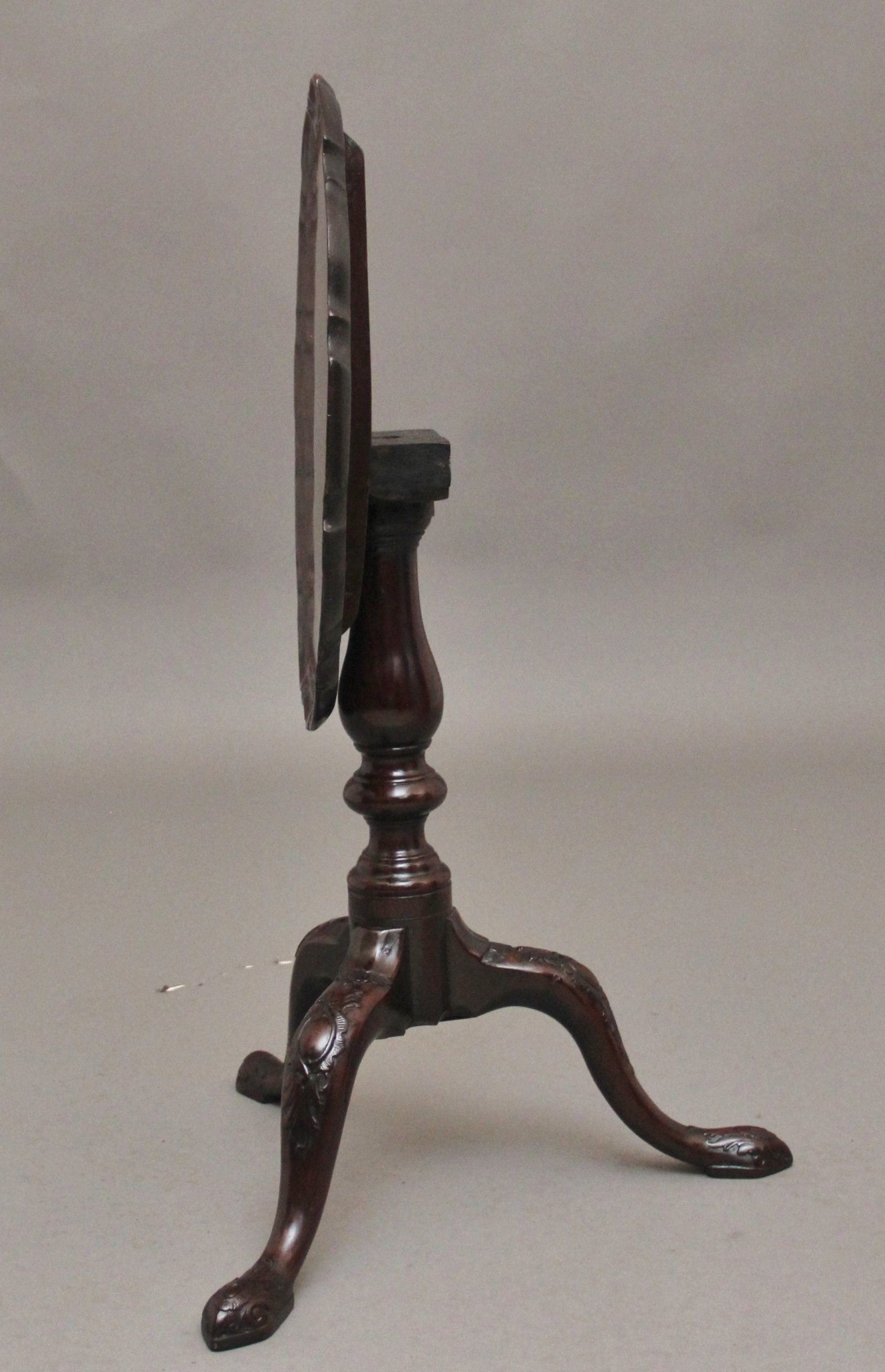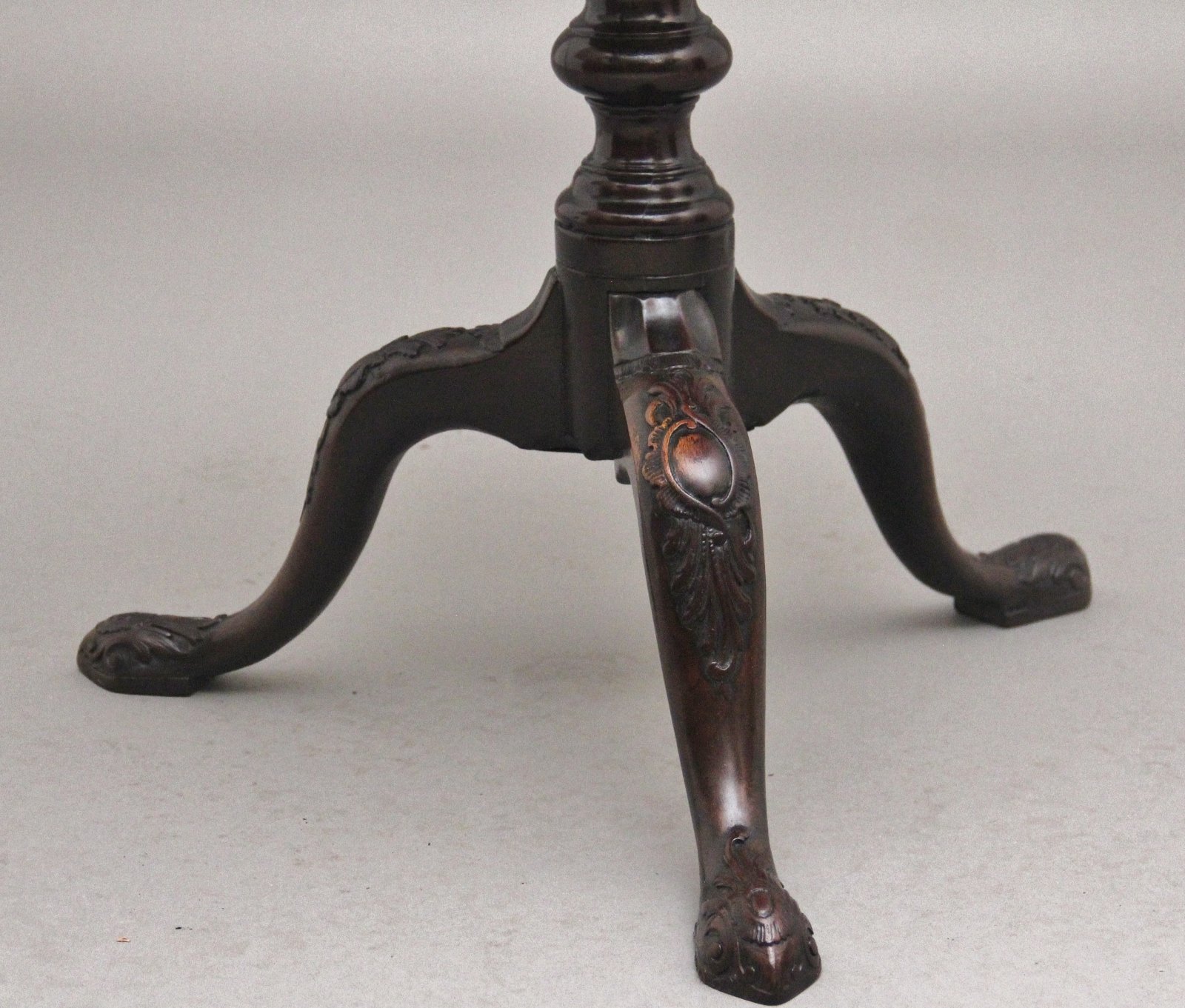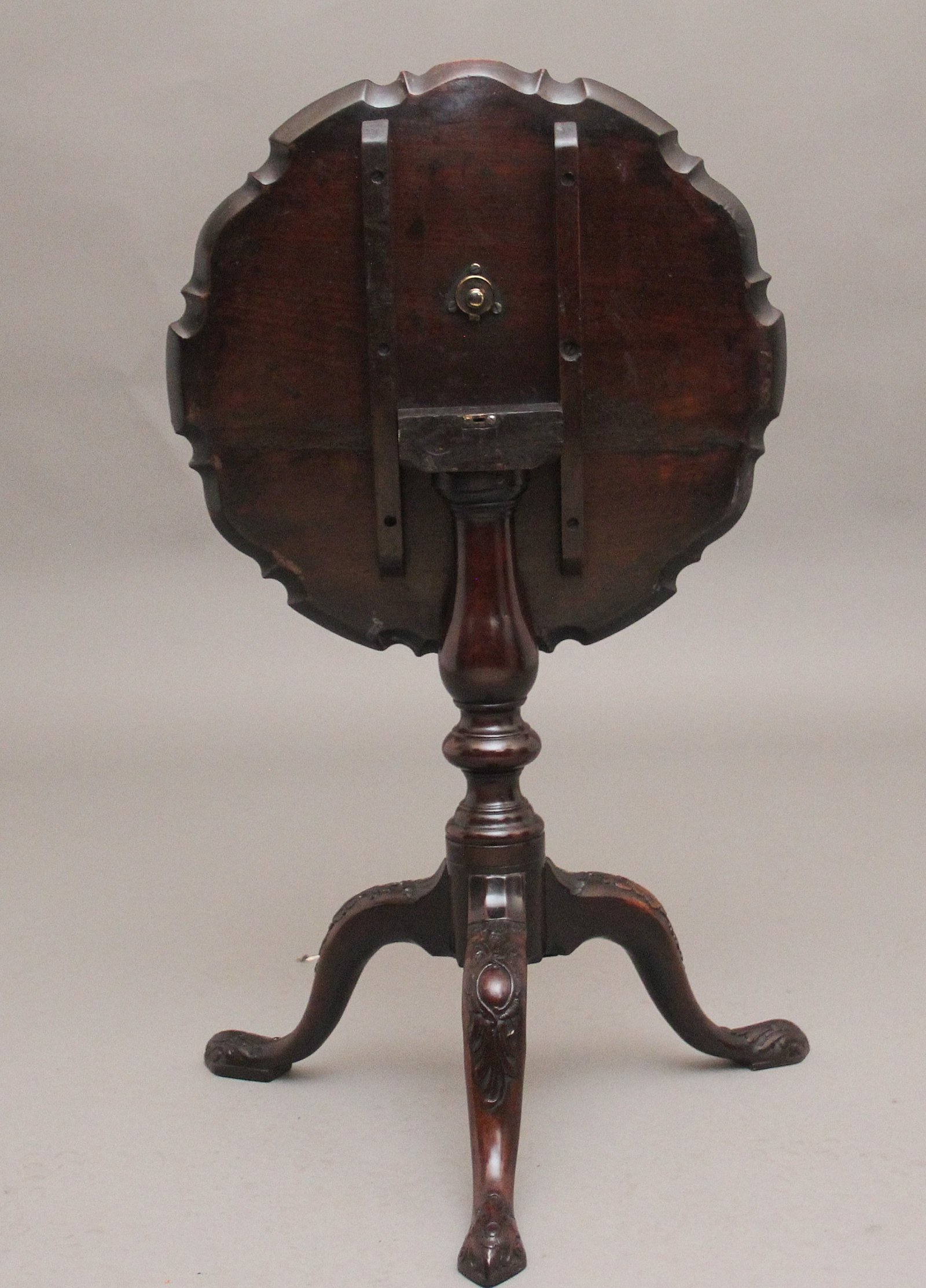 18th Century mahogany tripod table having a wonderfully figured top with a piecrust edge, supported on an elegant turned column terminating with three slender shaped and carved legs. Having a lovely warm rich mahogany colour and in excellent condition. Circa 1780.