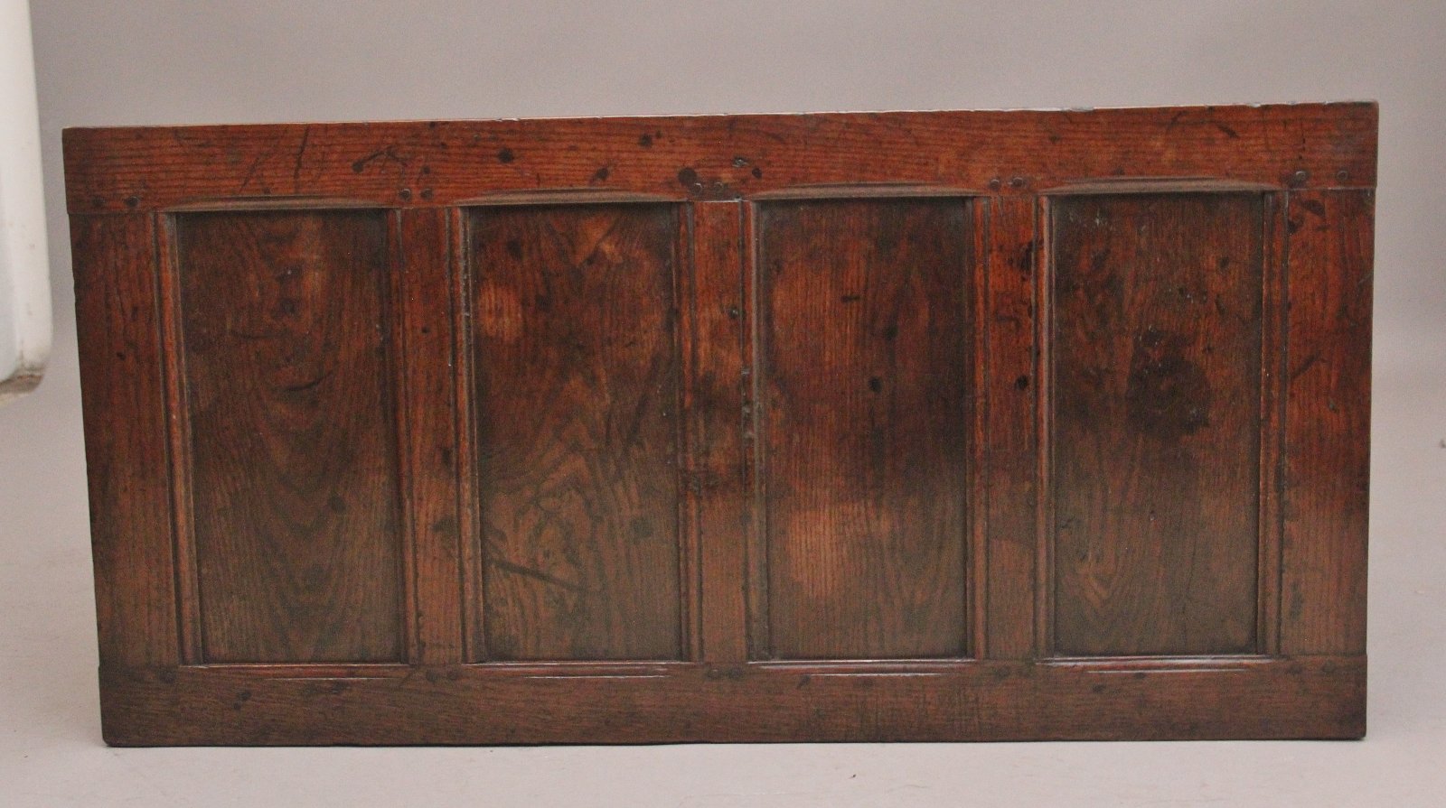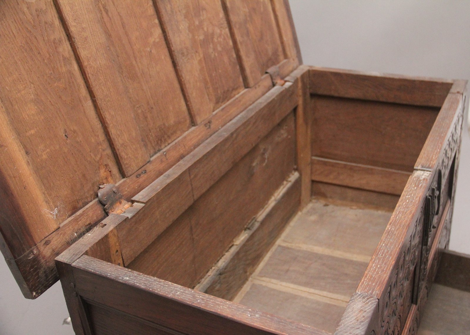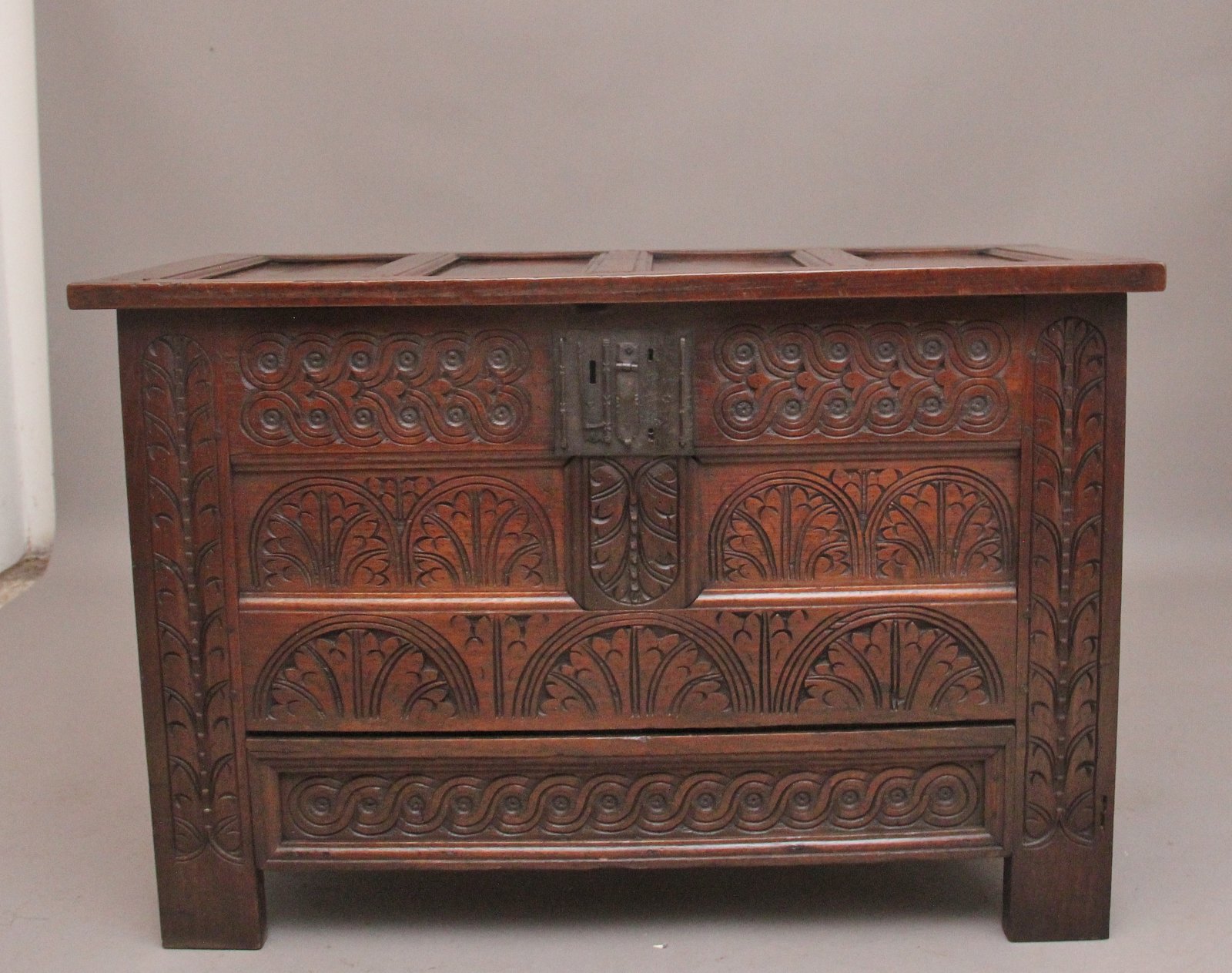 A fabulous quality early 18th Century carved oak mule chest, having a four panel hinged top opens to reveal a large compartment space, the front of the chest having wonderful intricate and highly decorative carving with a single frieze drawer at the bottom, panelled sides and supported on block feet. Circa 1740.