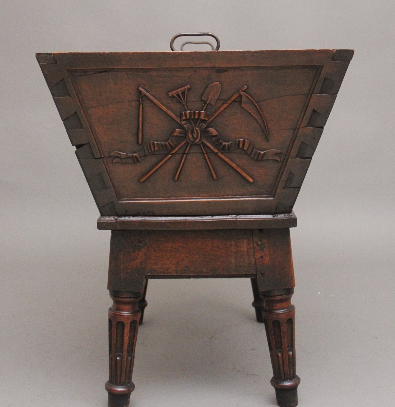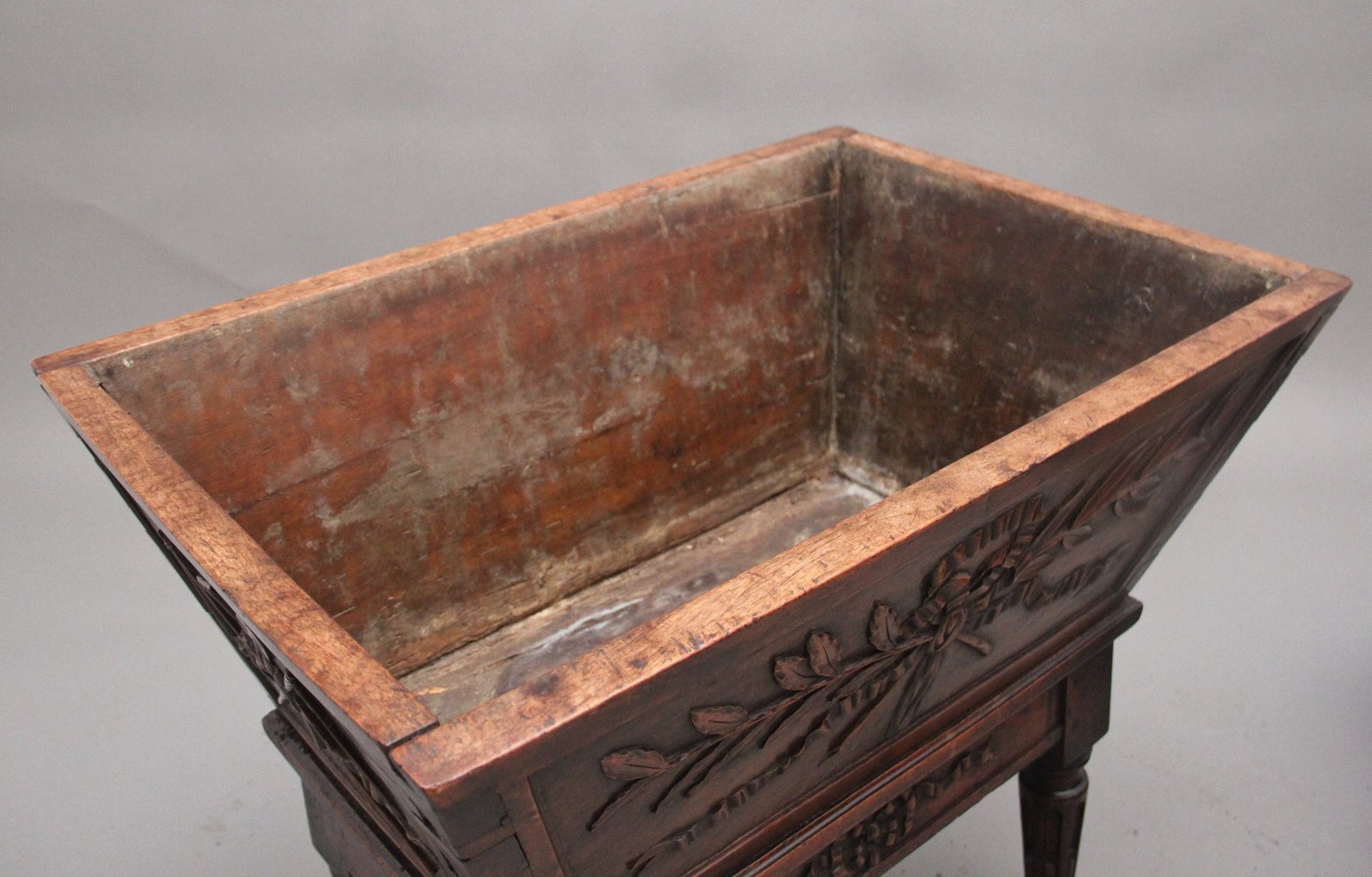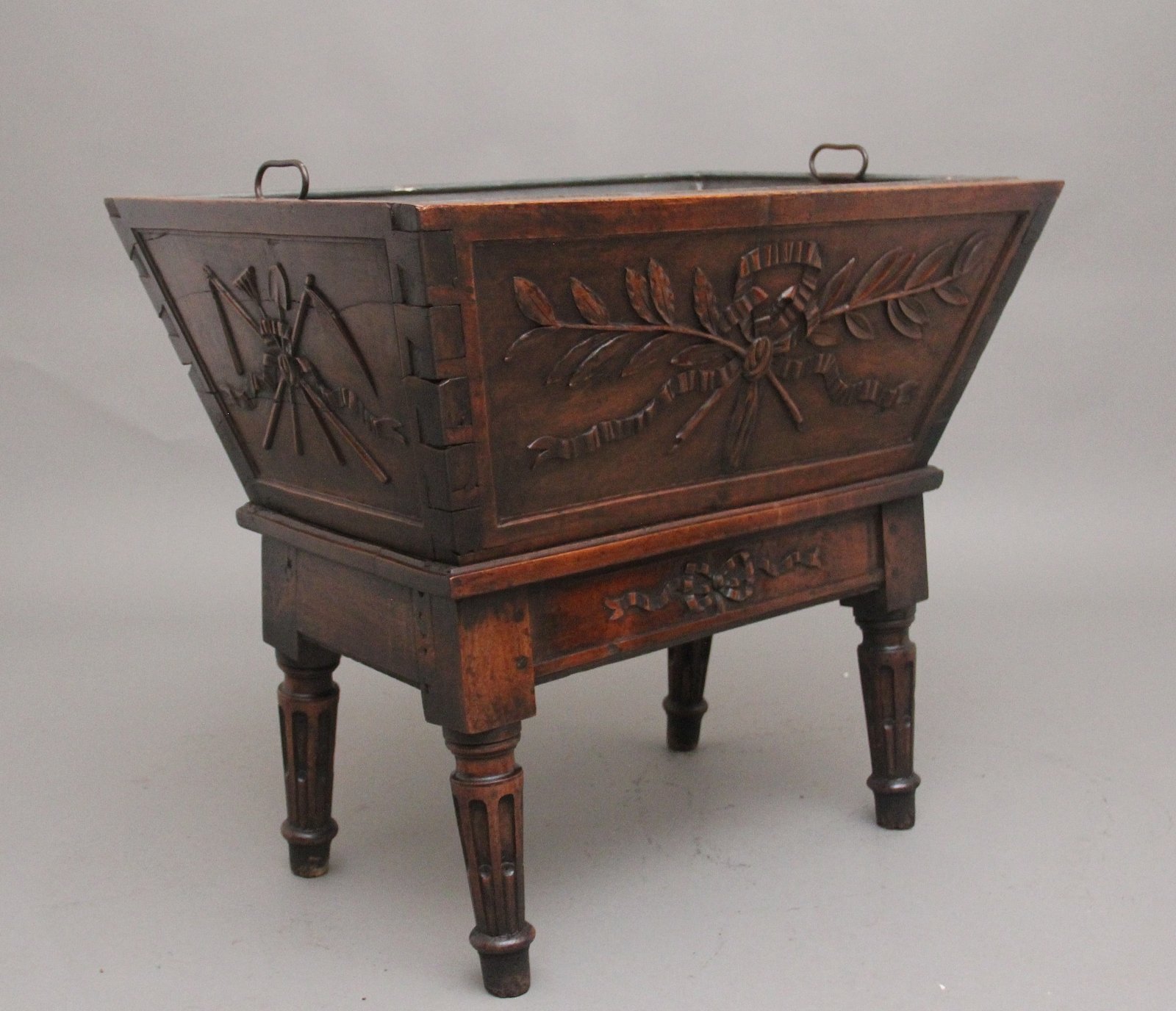 18th Century French walnut wine cooler / planter, the shaped structure having intricate carving around all sides consisting of various foliage, ribbons and gardening tools, having the original removable liner with lift up carrying handles, supported on a carved base with turned and fluted legs. Circa 1770.