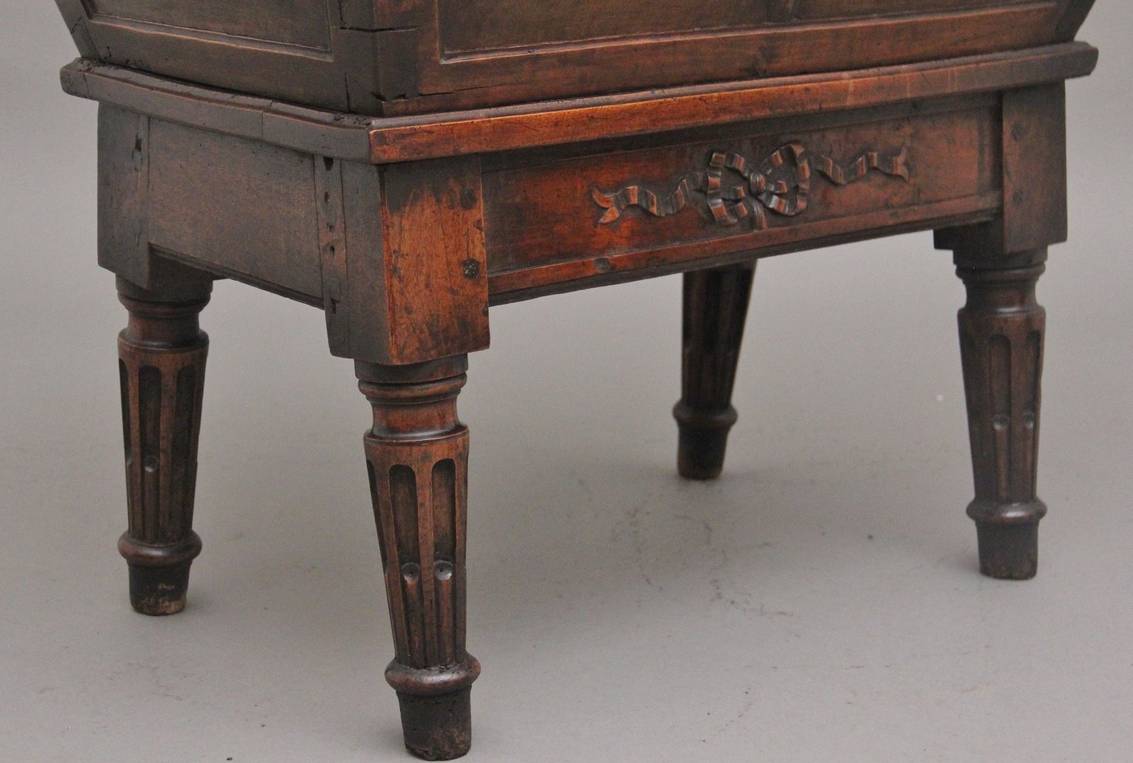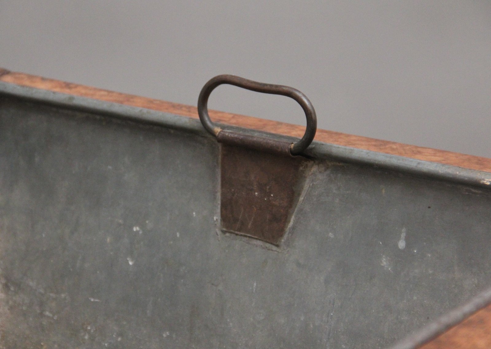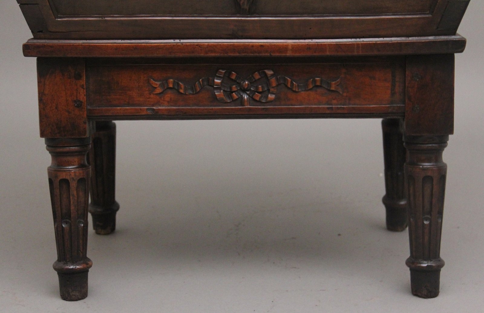 18th Century French walnut wine cooler / planter, the shaped structure having intricate carving around all sides consisting of various foliage, ribbons and gardening tools, having the original removable liner with lift up carrying handles, supported on a carved base with turned and fluted legs. Circa 1770.