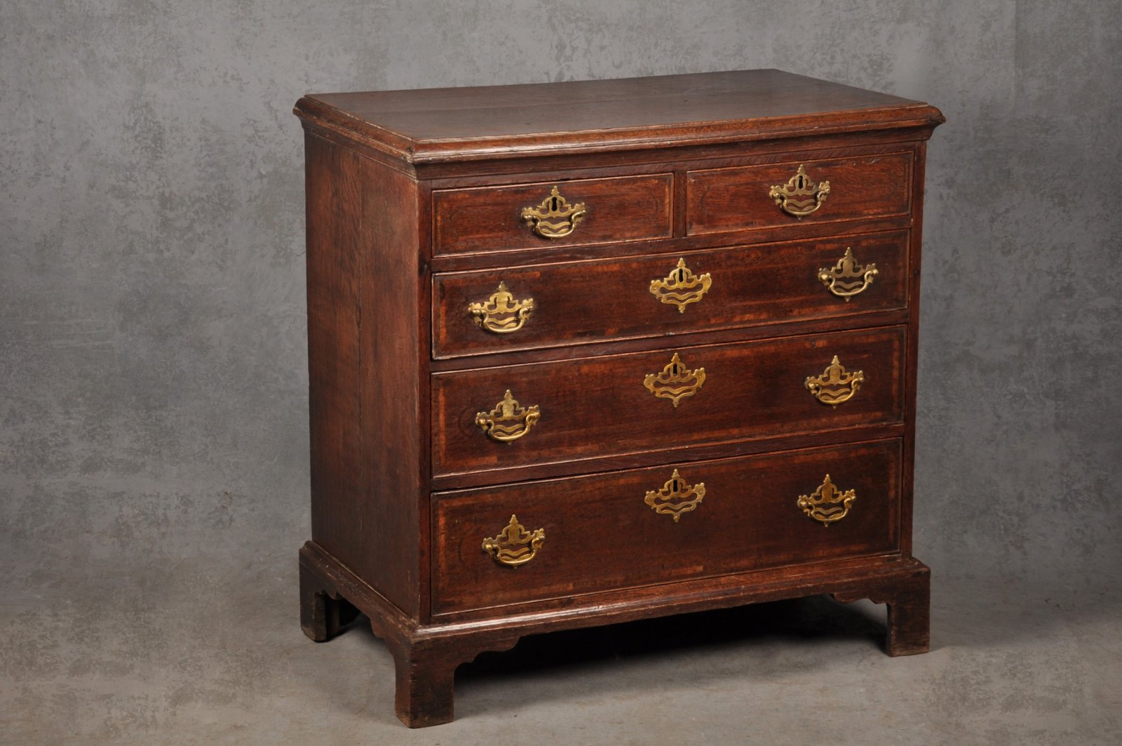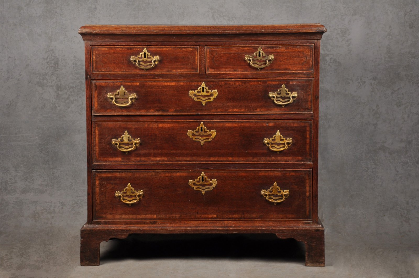 A fine mid 18th Century Oak and inlaid chest of drawers of excellent colour and patina. In very good original condition, with the original handles and all but one of the original bracket feet. It has clean original pine drawer linings. The drawer fronts are inlaid with a fine Mahogany half feather banding and Walnut cross banding, the top is inlaid with a walnut banding.