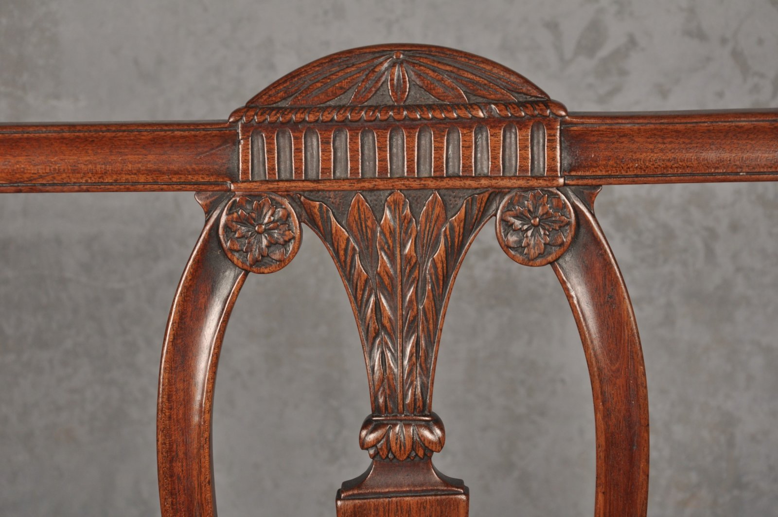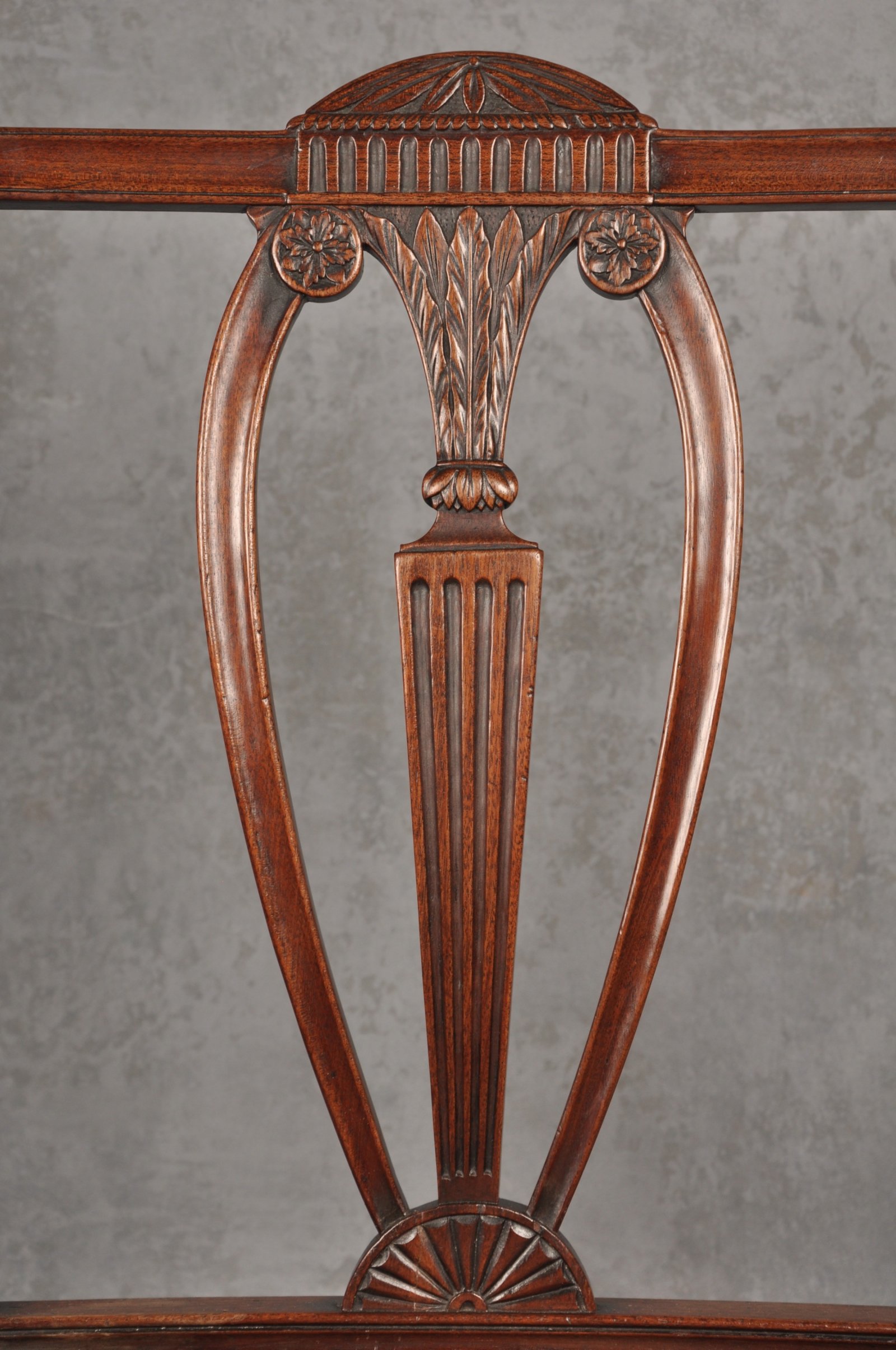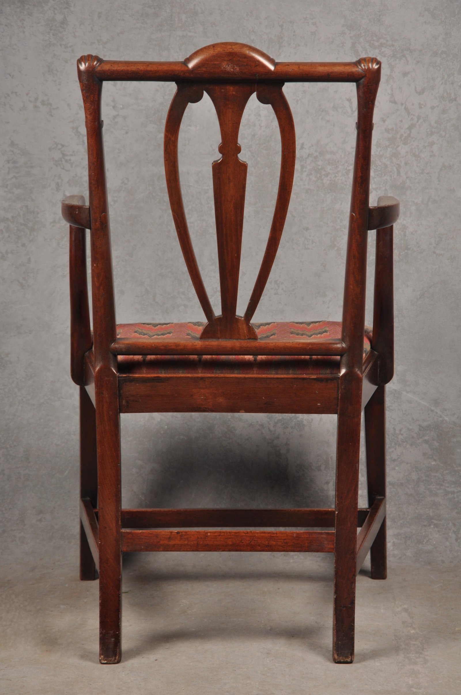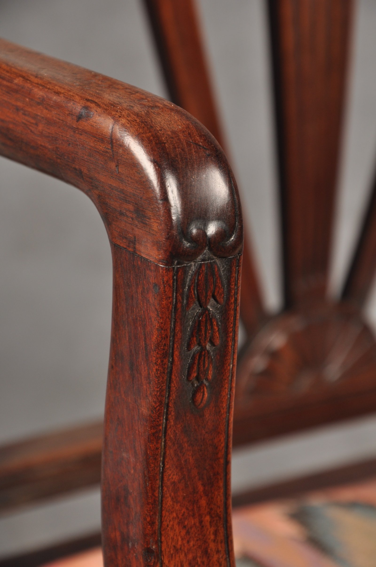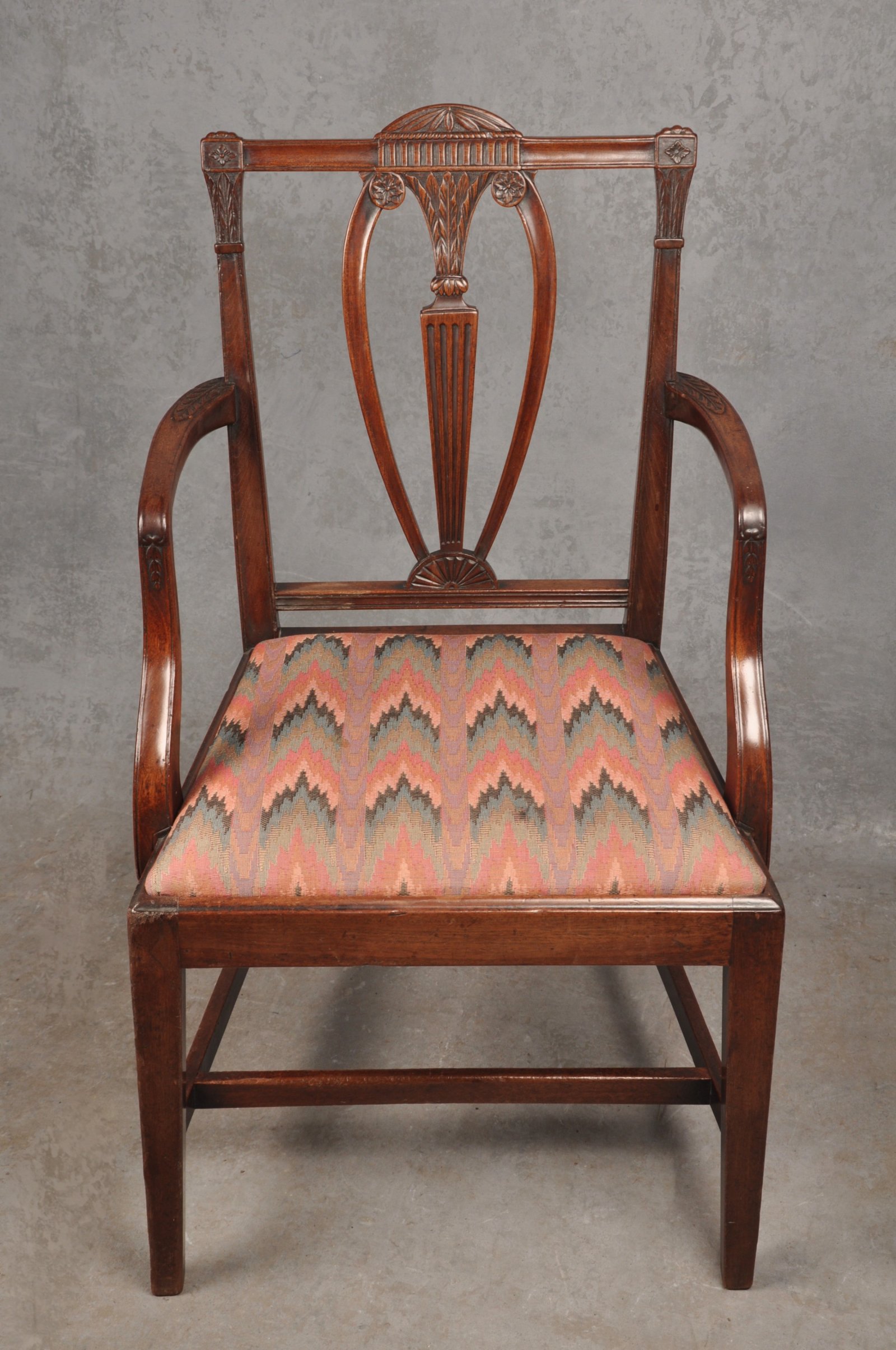 A Fine 18th Century Mahogany Sheraton Armchair of wonderful colour, in very original condition. Delicately carved with flowers, foliage and scrolls, having classical shaped splat. The chair is in good solid condition and stands well having lost no hight over the years.
