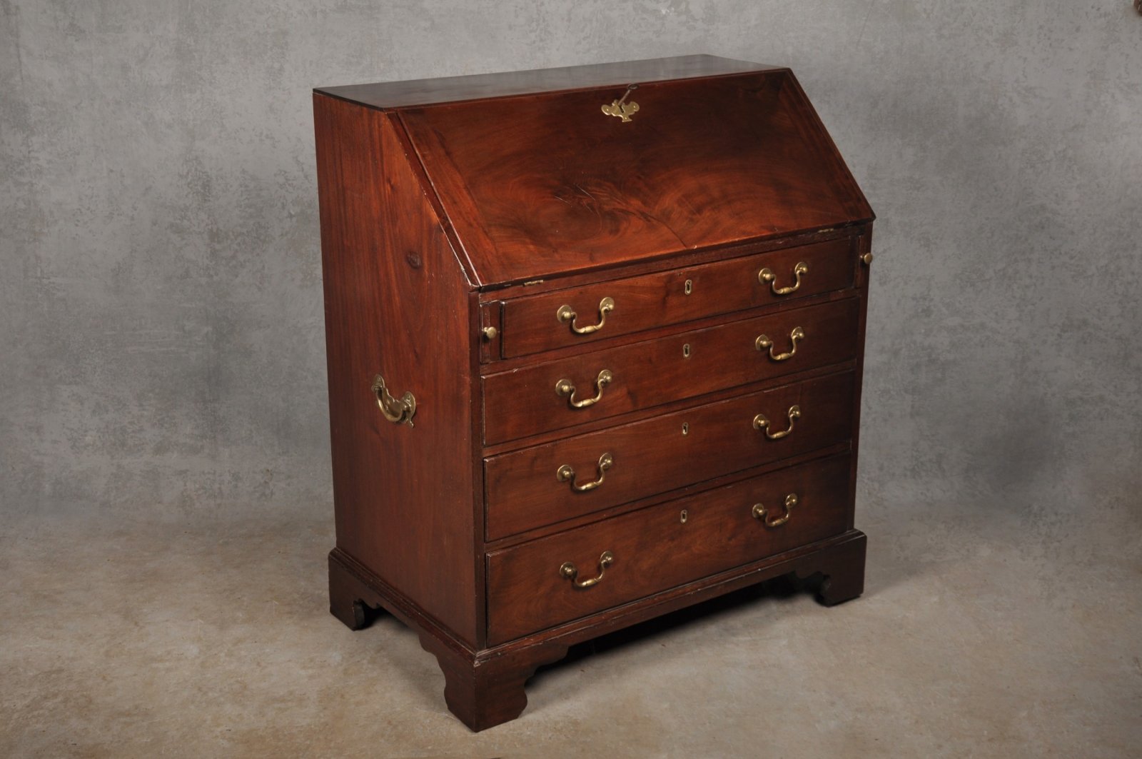 A fine quality 18th Century solid Mahogany Bureau of good colour and in good original condition, retaining the original handles, locks, hinges, escutcheons and standing on the original shaped bracket feet.