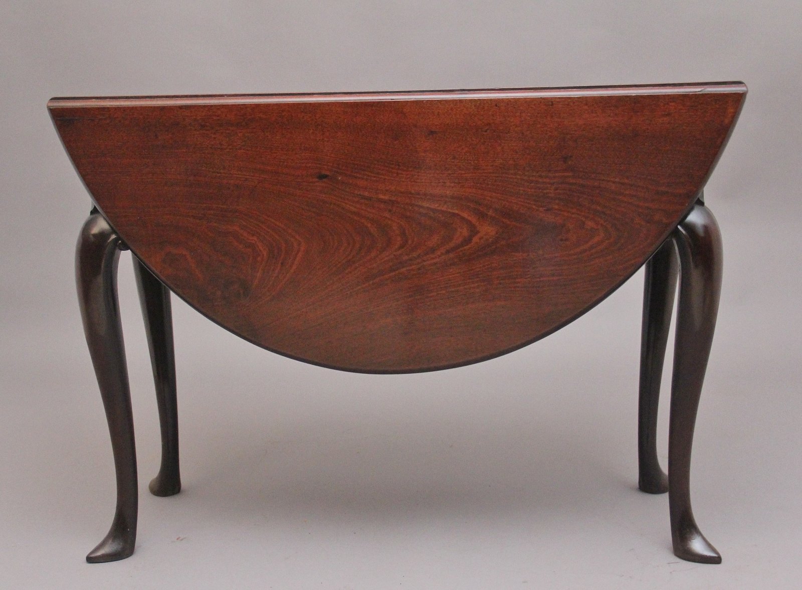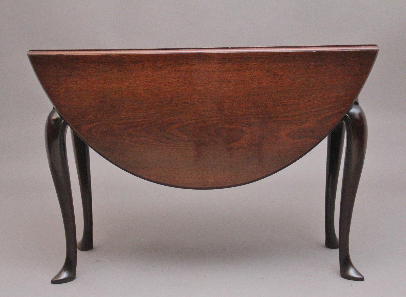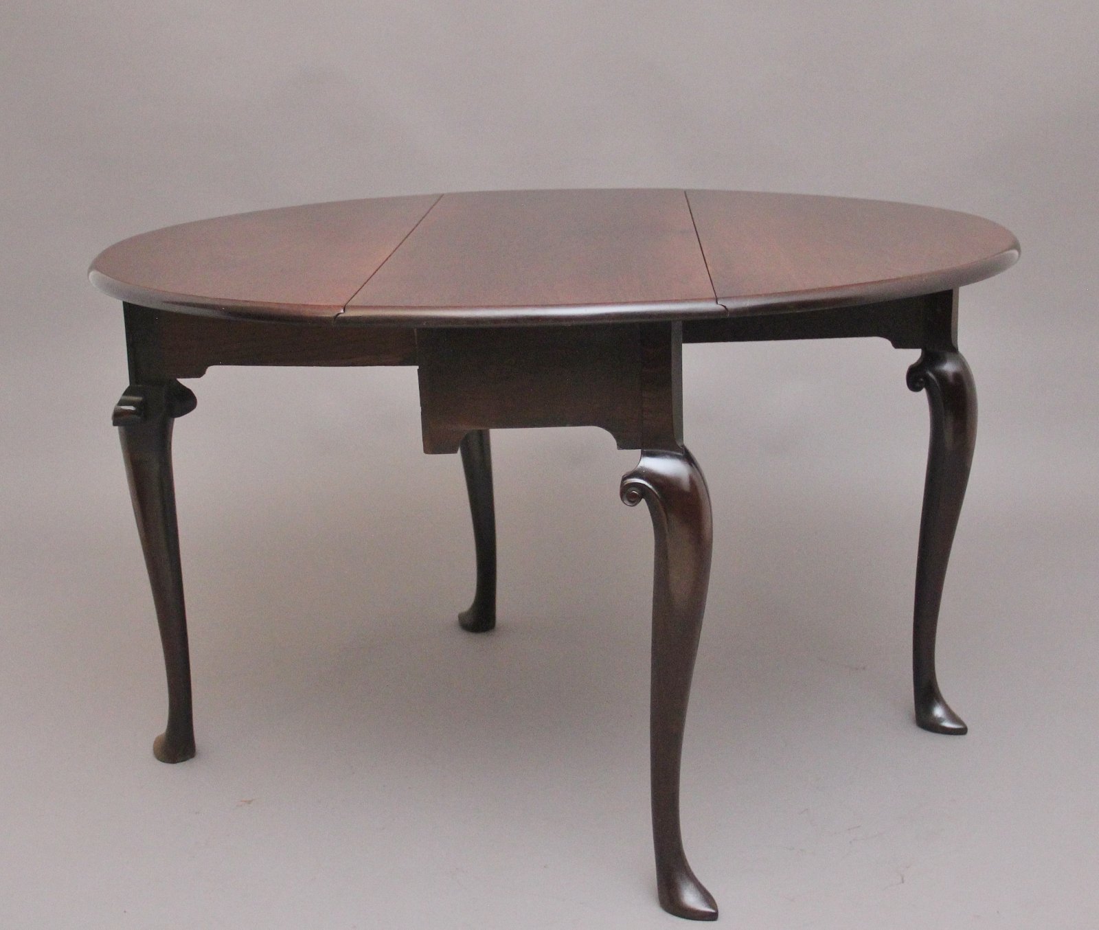 18th Century Georgian mahogany drop leaf table, having a lovely figured solid top, once the leaves are fully extended the top is oval in shape, standing on elegant cabriole legs with carved scroll decoration, having a lovely warm rich mahogany colour and in excellent condition. Circa 1780.