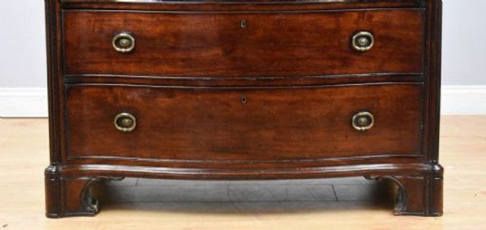 A superb George III mahogany serpentine chest of drawers, showcasing elegant proportions and classic 18th-century craftsmanship. The beautifully shaped serpentine front is fitted with four graduated drawers, each retaining their original brass ring handles and escutcheons.