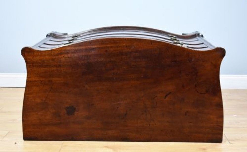 Crafted in richly figured mahogany with a deep, lustrous polish, the chest stands on bold ogee bracket feet with shaped apron and fluted canted corners. A timeless piece that adds grace and sophistication to any traditional interior.