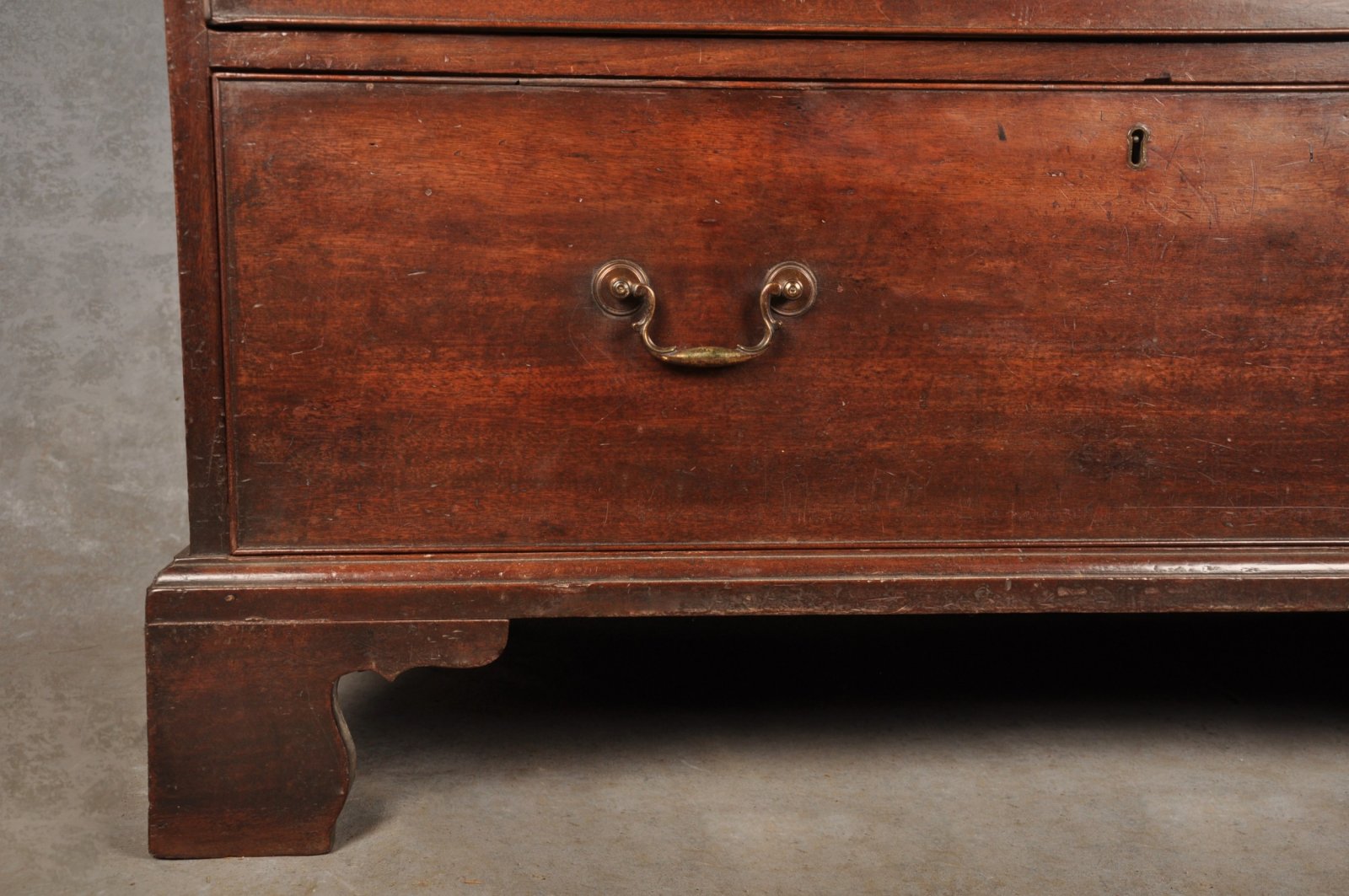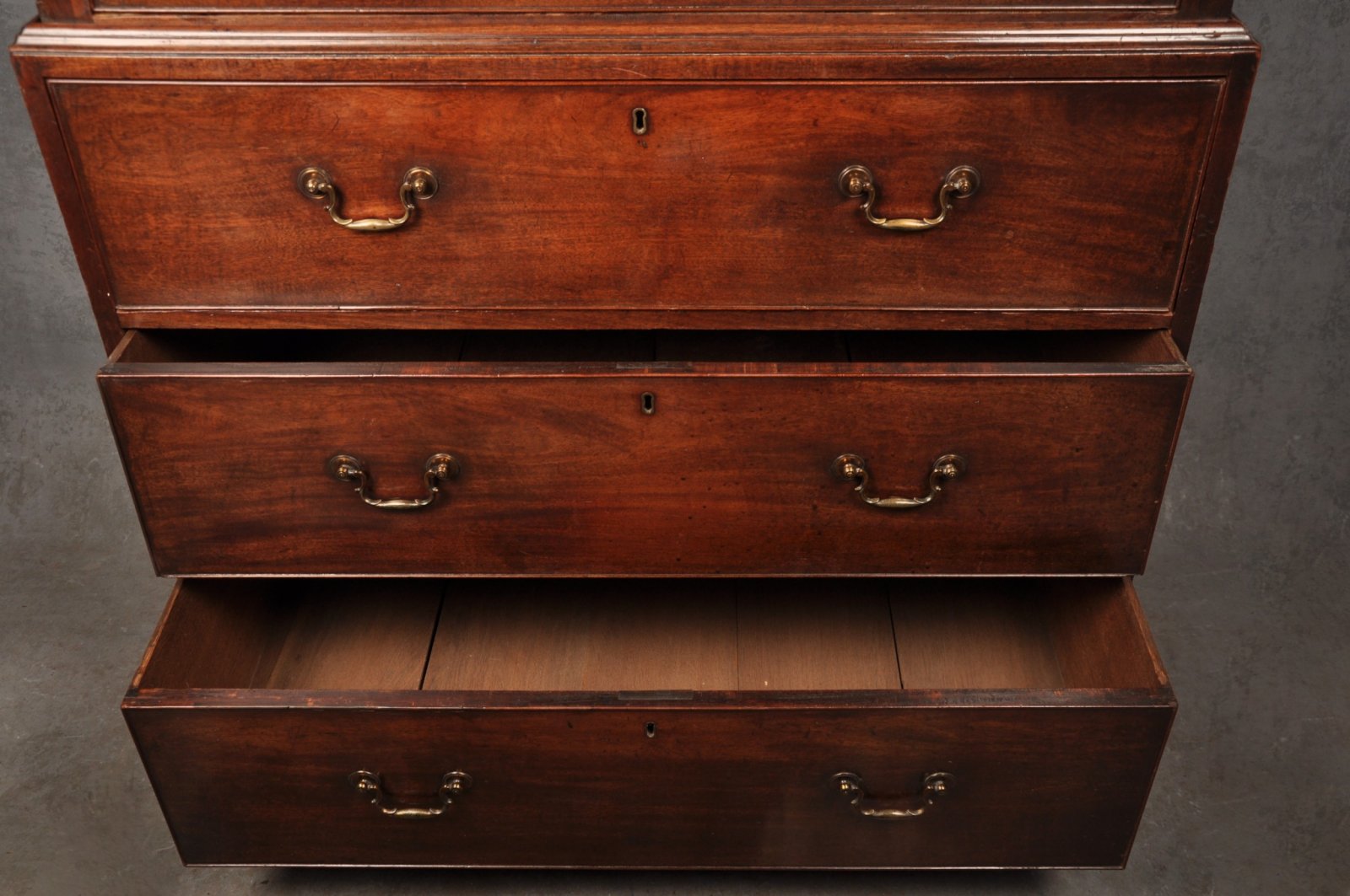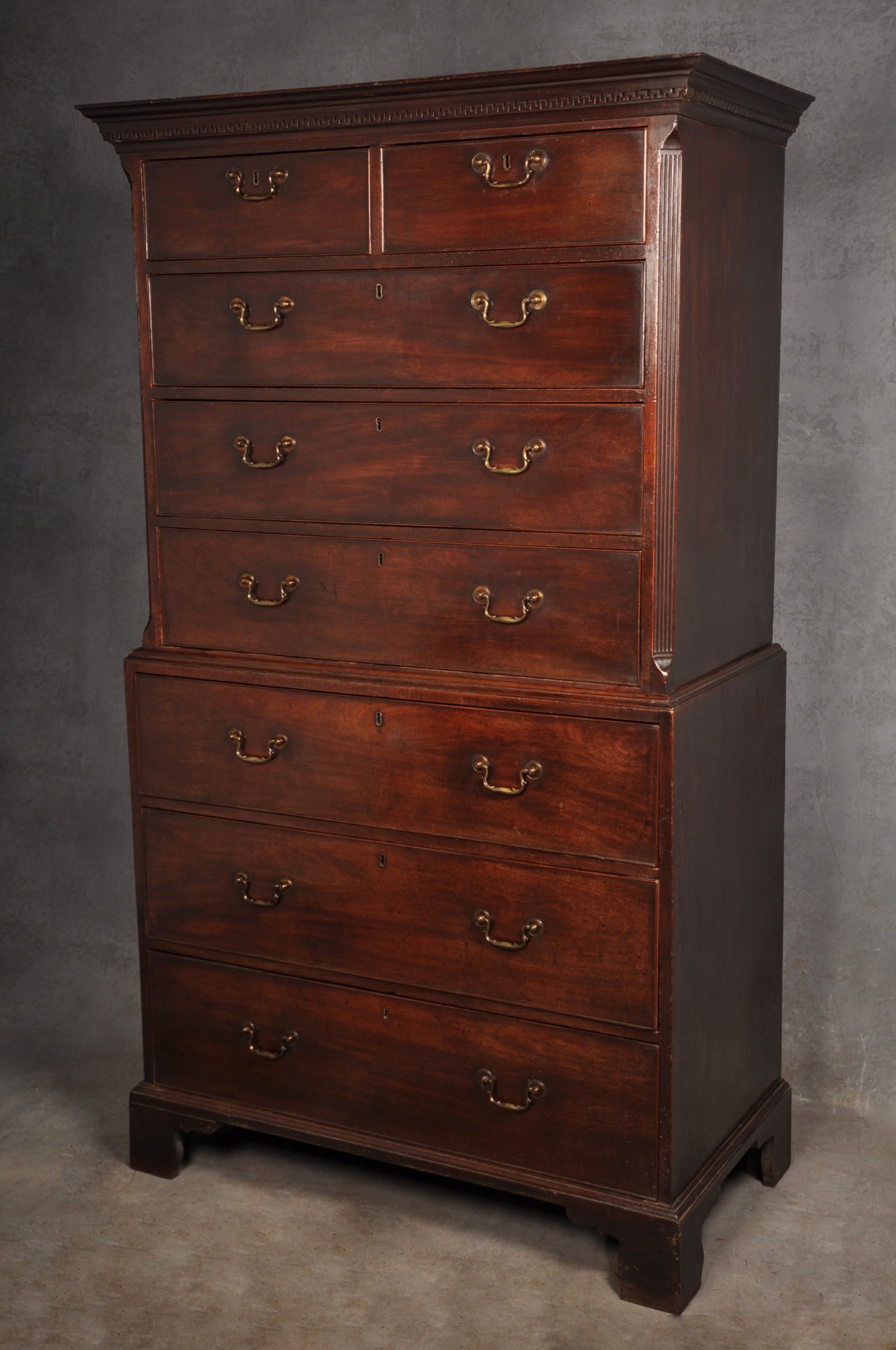 A fine 18th Century Mahogany Chest on Chest of superb colour and patina, with greek key work to the cornice and fluted canted corners. In very good original condition having original handles and feet. The original drawer linings are in good clean condition and made in oak.