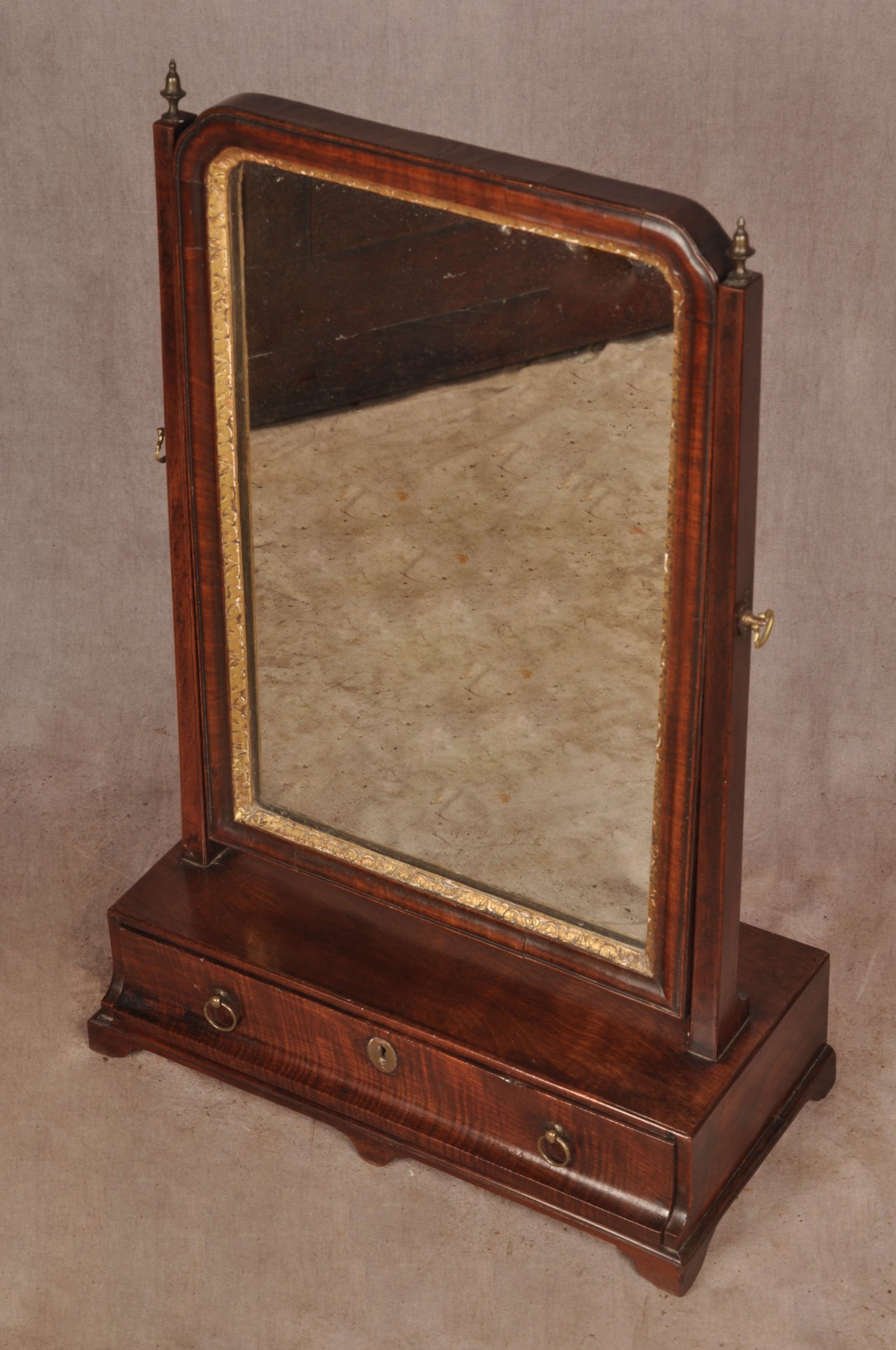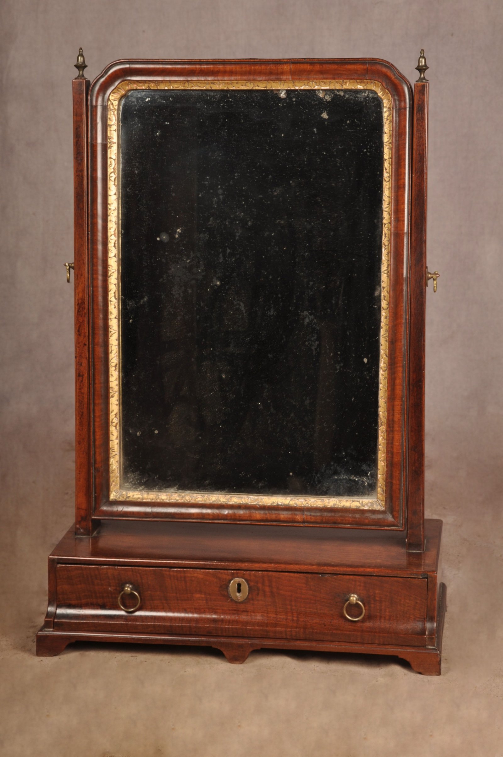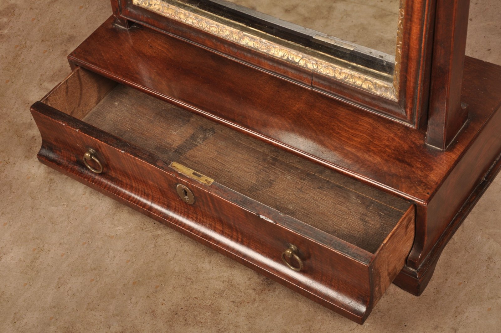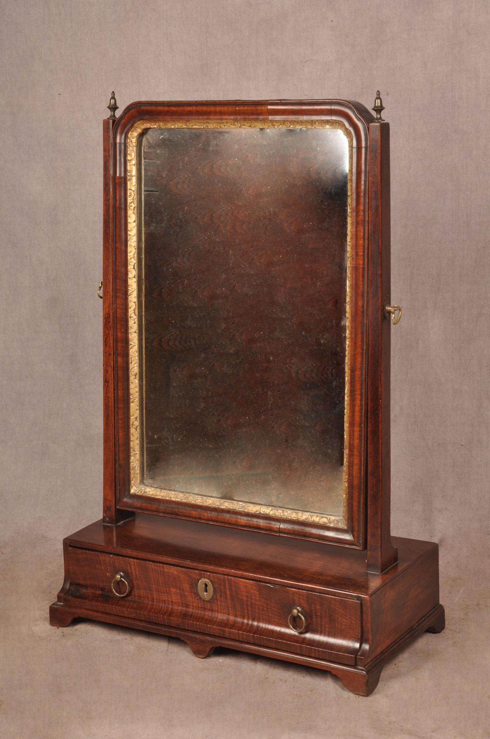 See shipping detailsA very nice 18th Century Mahogany Toilet Mirror of superb colour and condition, made using well chosen cuts of veneer, the drawer front in fine fiddleback. Having gilt slip to the border of the mirror plate and nicely made cross grain mouldings. The plate is old but not original. A very attractive and honest example with all other parts being original apart from the escutcheon.