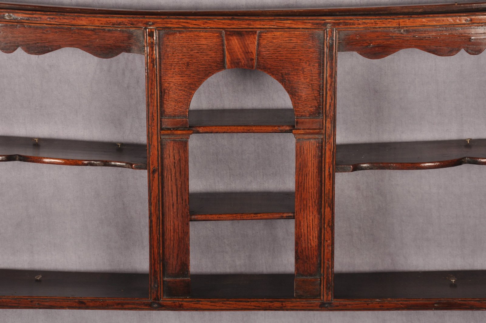 A true 18th Century Oak Delft Rack of superb colour, in original condition and of rare form. It is of good proportions and fine design, with shaped arch to the centre. Having applied Mahogany keystone, base and capitals. The elm shelves with applied Oak moulding to the fronts are shaped to the short central sections.