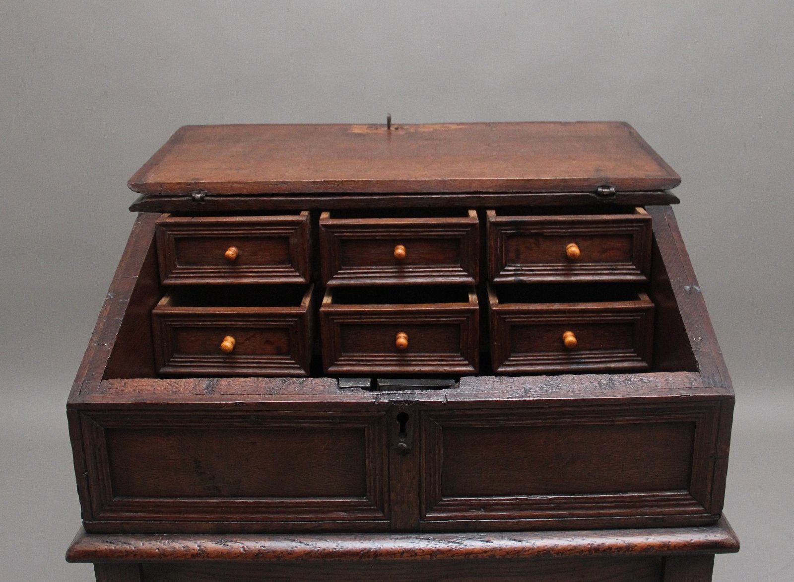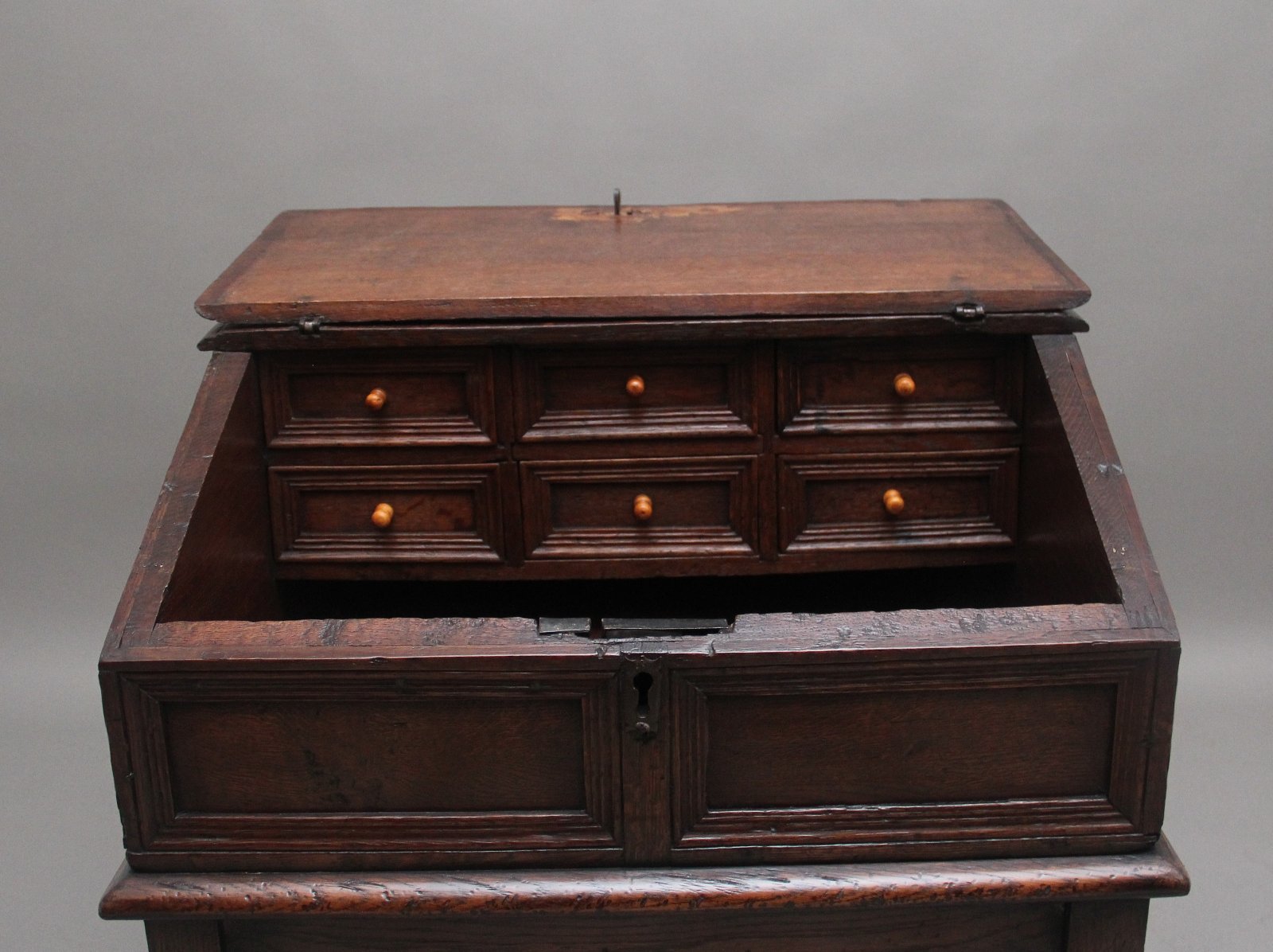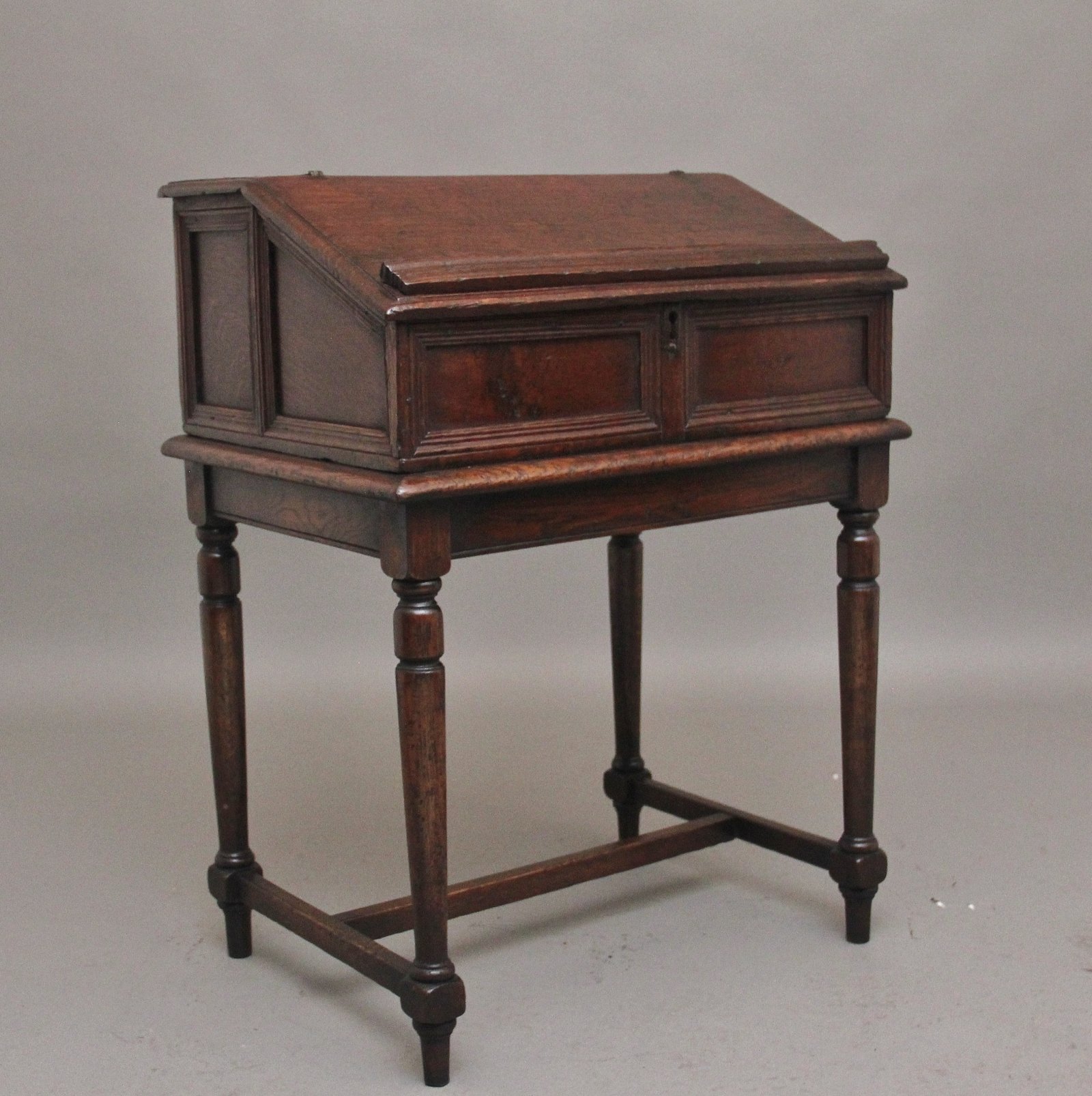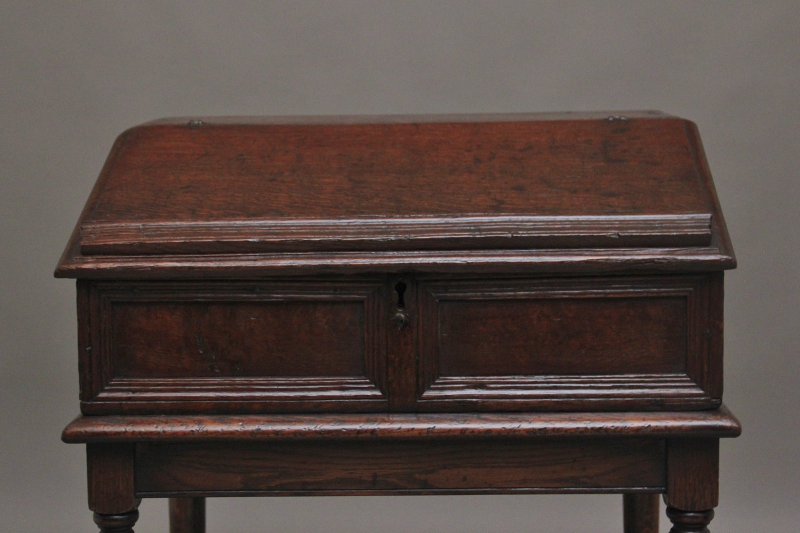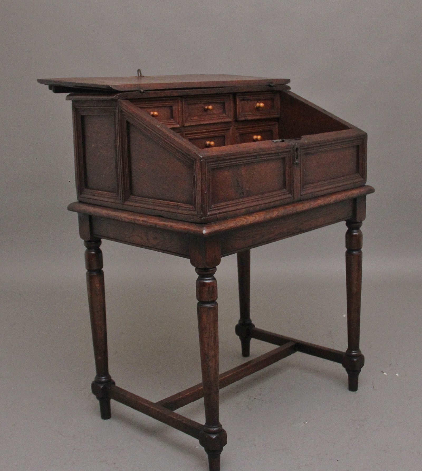 18th Century oak desk on later stand, the sloped desk having a hinged lift up lid opening to reveal a large compartment space with six moulded front drawers, the outside of the desk top having moulded panels along the front and sides, sitting on a later stand with turned legs united by a central stretcher. Circa 1780.