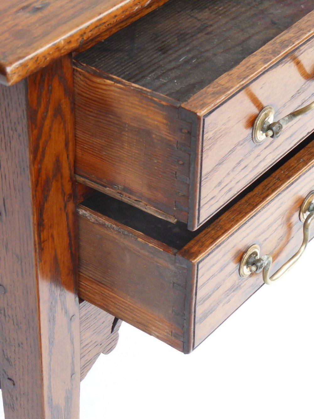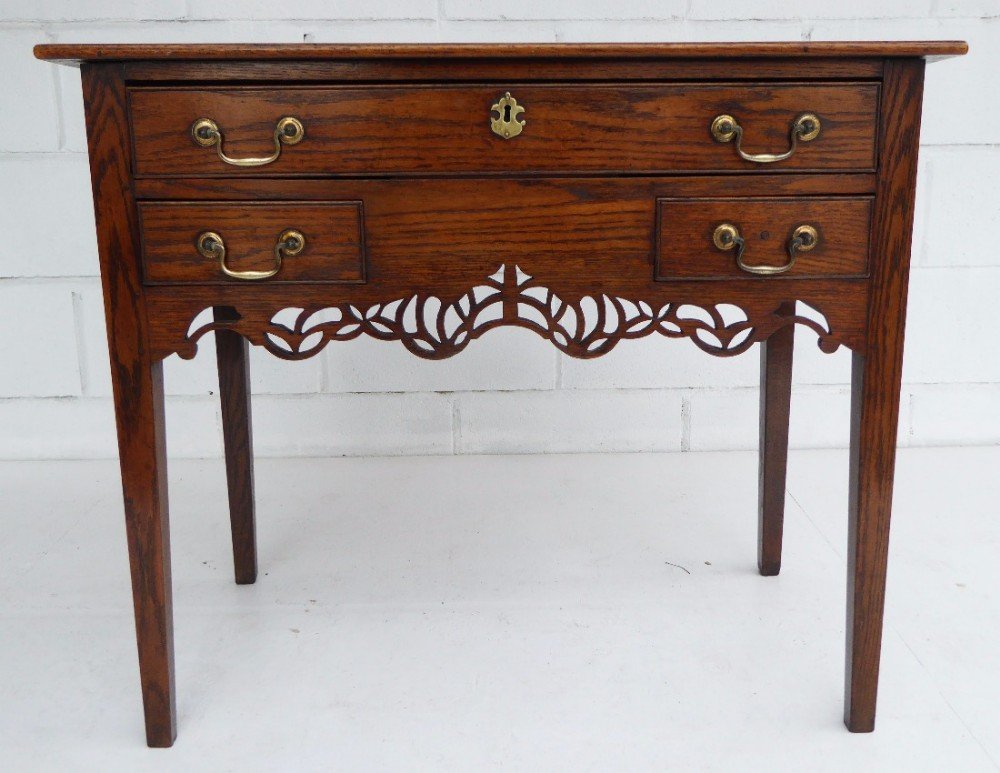 For sale is a good quality 18th Century Oak Lowboy. This piece has an arrangement of four drawers, one long drawer at the top with one short drawer below on either side. Below this is an ornate fretwork frieze. The lowboy stands on four square tapered legs and is in excellent condition having been restored using traditional methods.