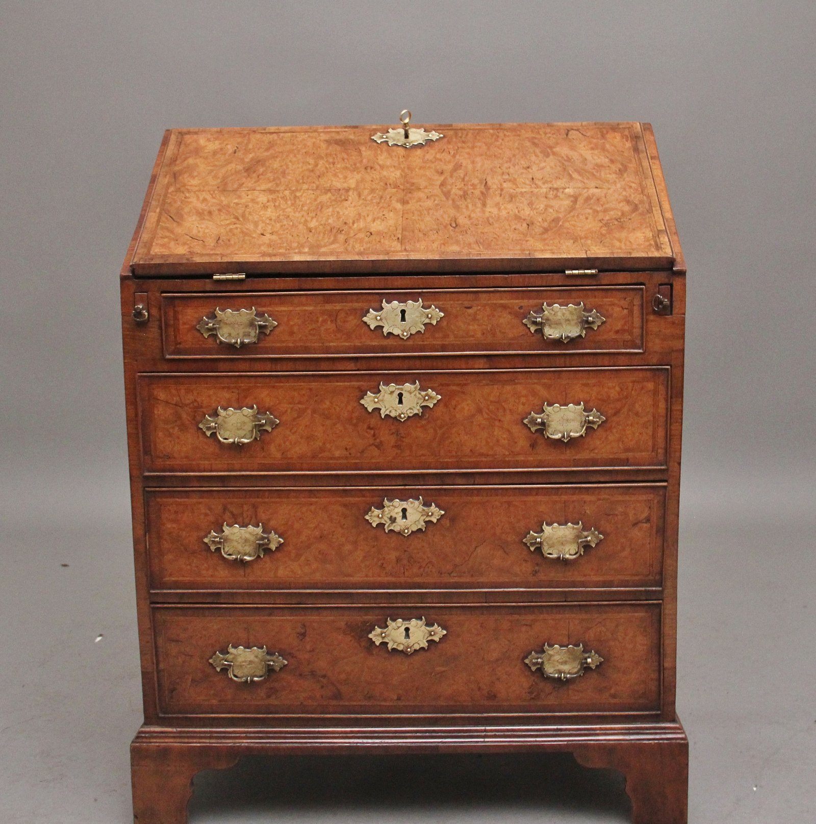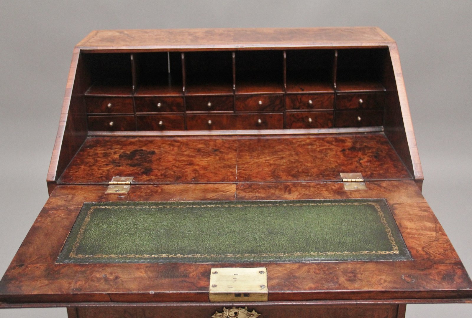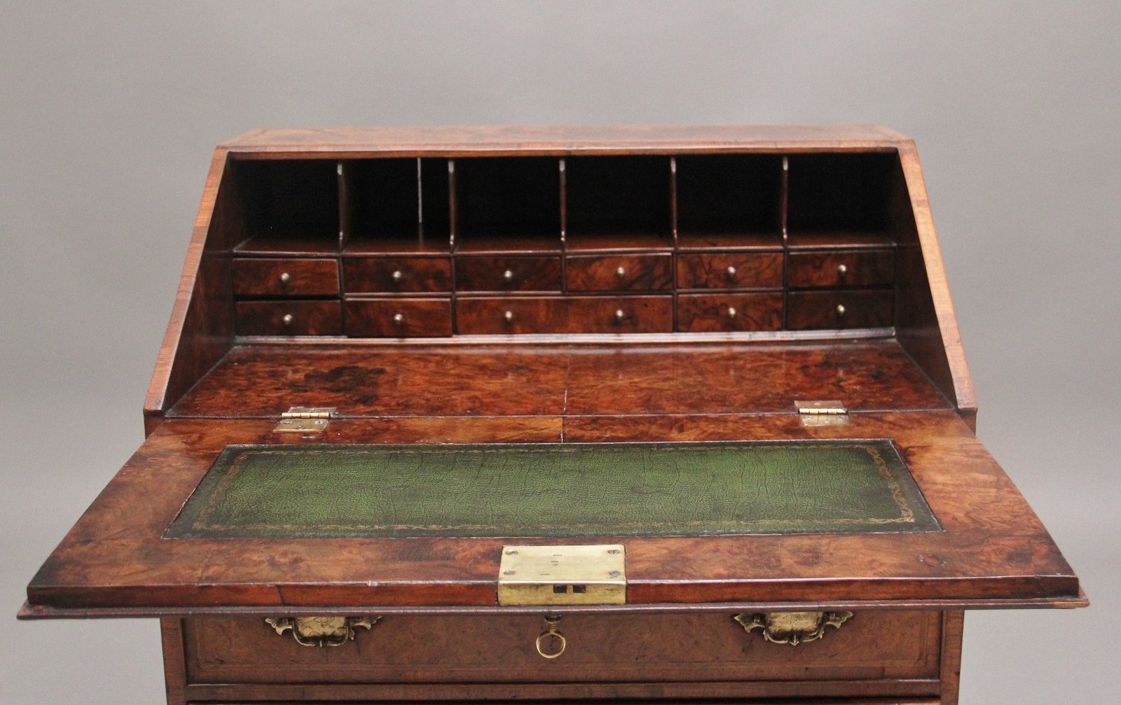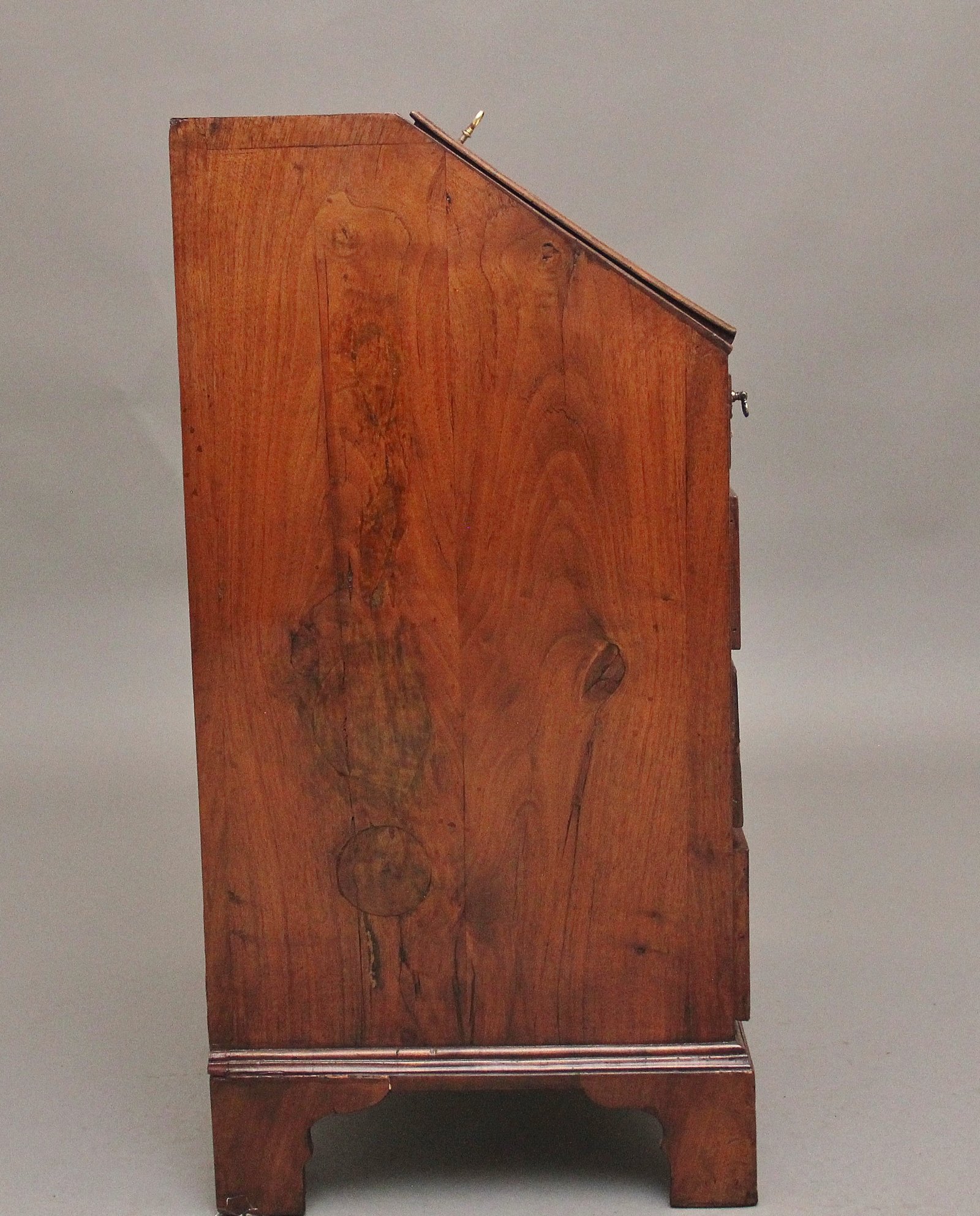 A lovely quality 18th Century walnut bureau, having a lovely figured fall which opens to reveal a wonderful fitted interior consisting of various drawers and compartments, a green leather writing surface with blind and gilt tooling, four long graduated drawers below with brass plate handles and escutcheons, standing on shaped bracket feet. Circa 1780.