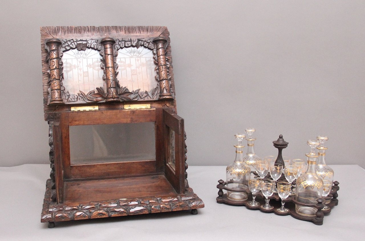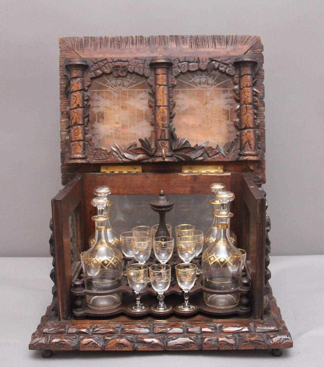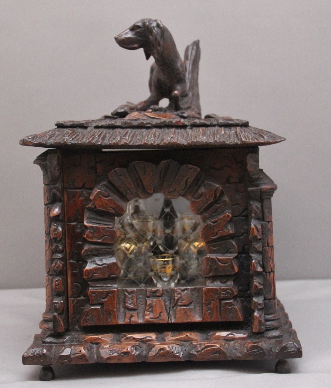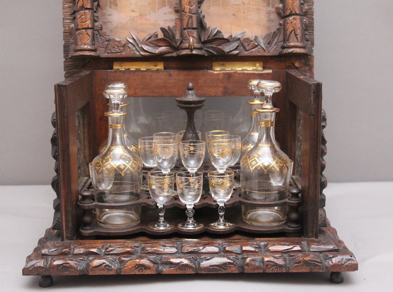 A superb quality 19th Century black forest walnut "Cave a' Liqueur" drinks cabinet, the shaped platform top having a dog sitting amongst various foliage, the cabinet profusely carved all over and incorporating engraved glass arched panels to the sides and front with engraved glass to the rear, decorative turned columns at the front with a lockable key in the central column, raised on a carved platform base with turned feet, the hinged lid lifts upward and then falls back allowing the front to be open for ease of access, comprising of four decanters and 15 liqueur glasses (originally 16) each glass etched in gold. Wonderful quality and in excellent condition. Circa 1880.