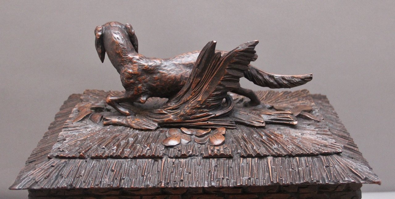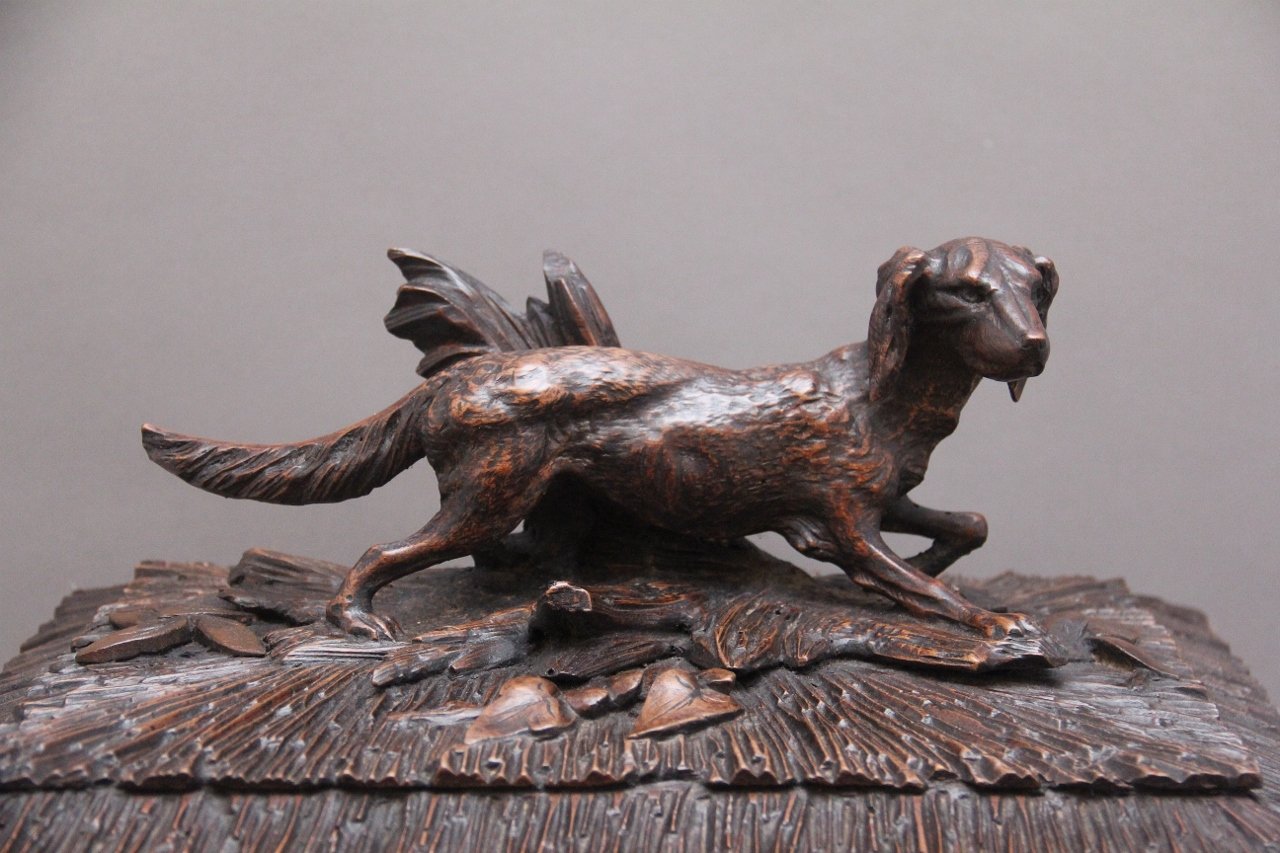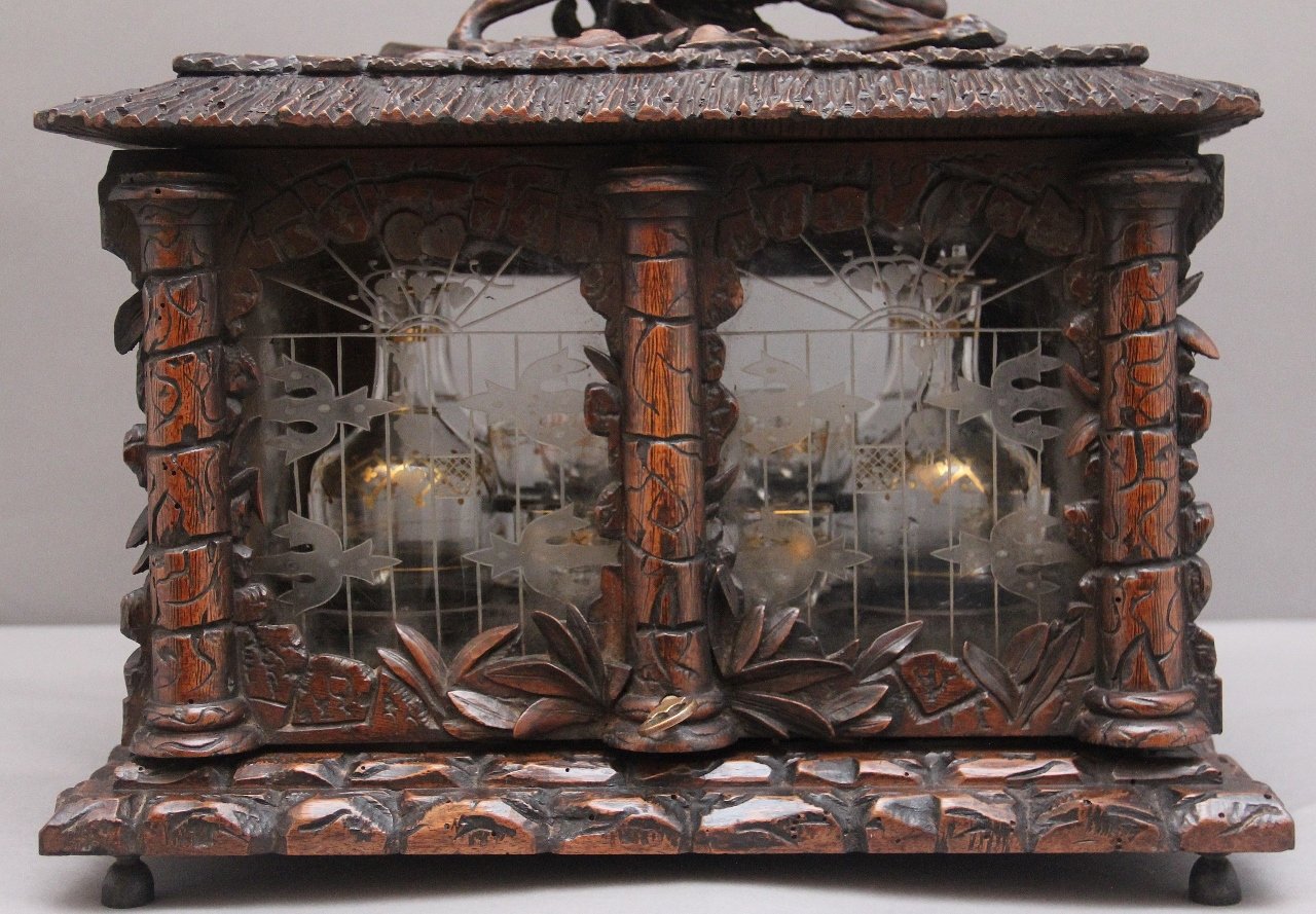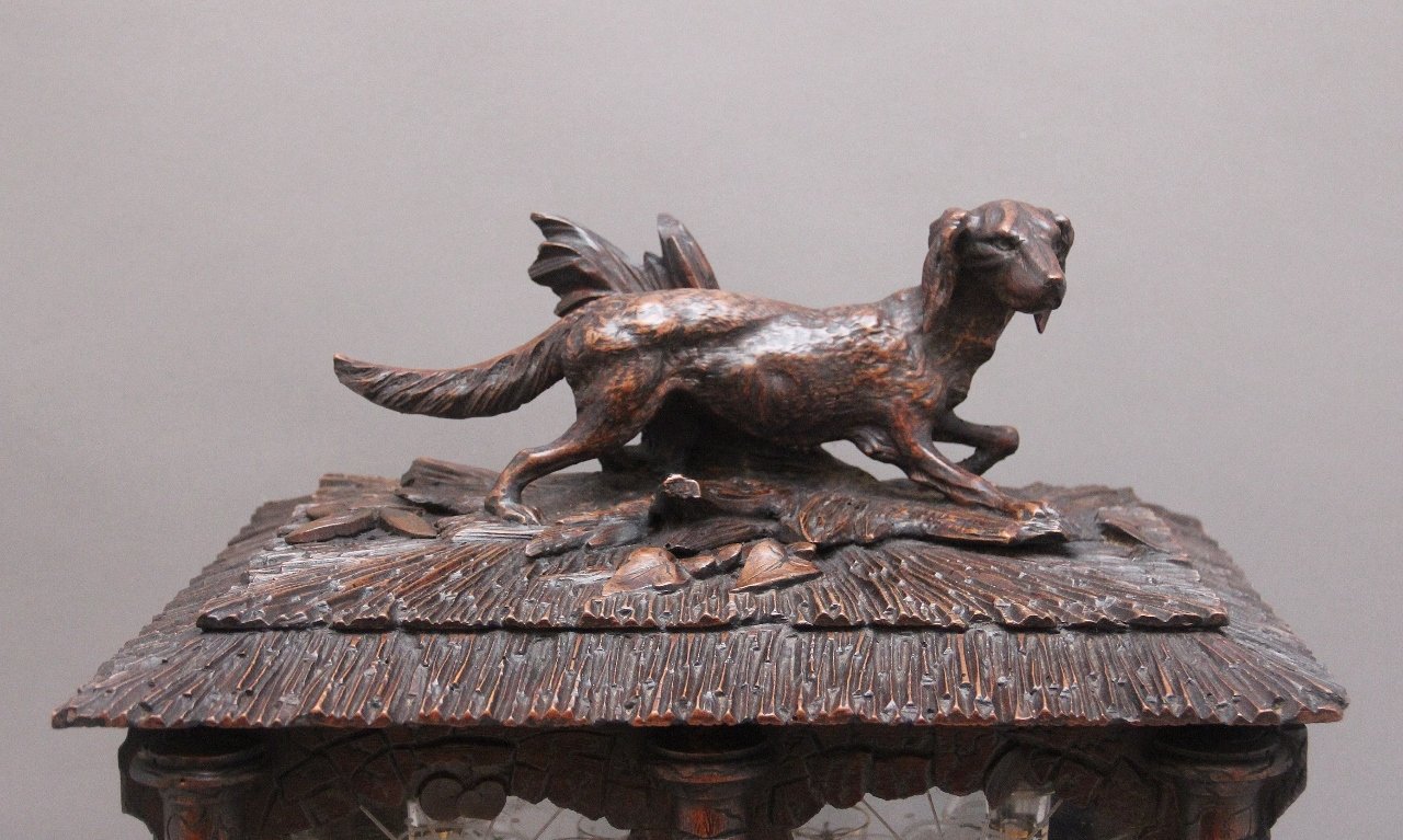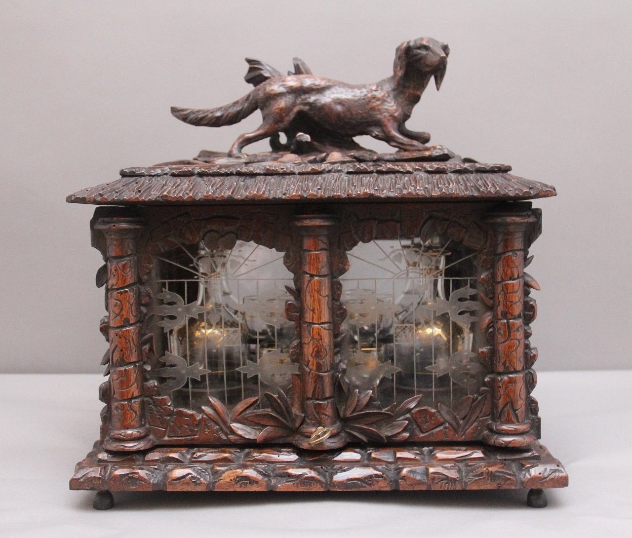 A superb quality 19th Century black forest walnut "Cave a' Liqueur" drinks cabinet, the shaped platform top having a dog sitting amongst various foliage, the cabinet profusely carved all over and incorporating engraved glass arched panels to the sides and front with engraved glass to the rear, decorative turned columns at the front with a lockable key in the central column, raised on a carved platform base with turned feet, the hinged lid lifts upward and then falls back allowing the front to be open for ease of access, comprising of four decanters and 15 liqueur glasses (originally 16) each glass etched in gold. Wonderful quality and in excellent condition. Circa 1880.