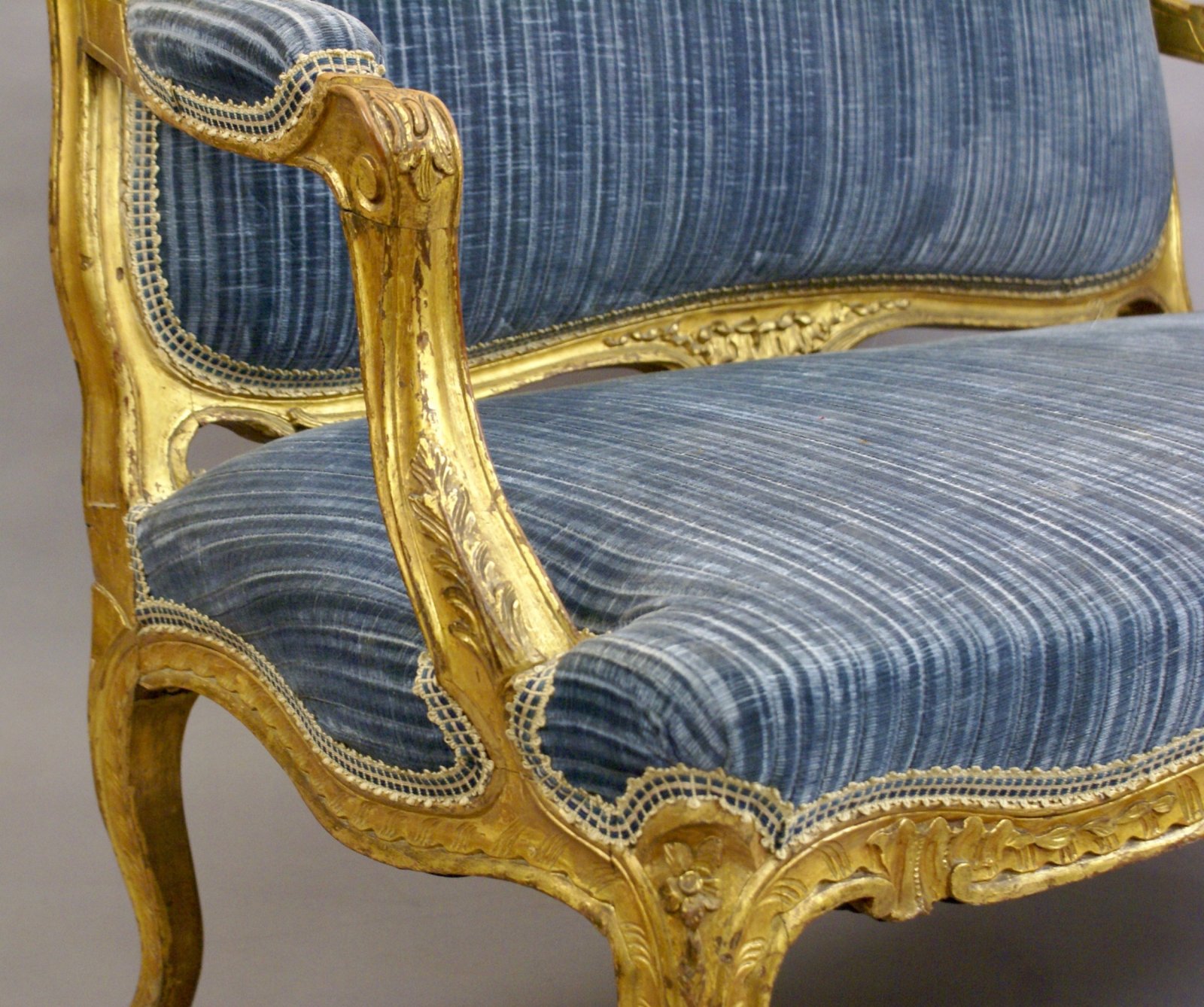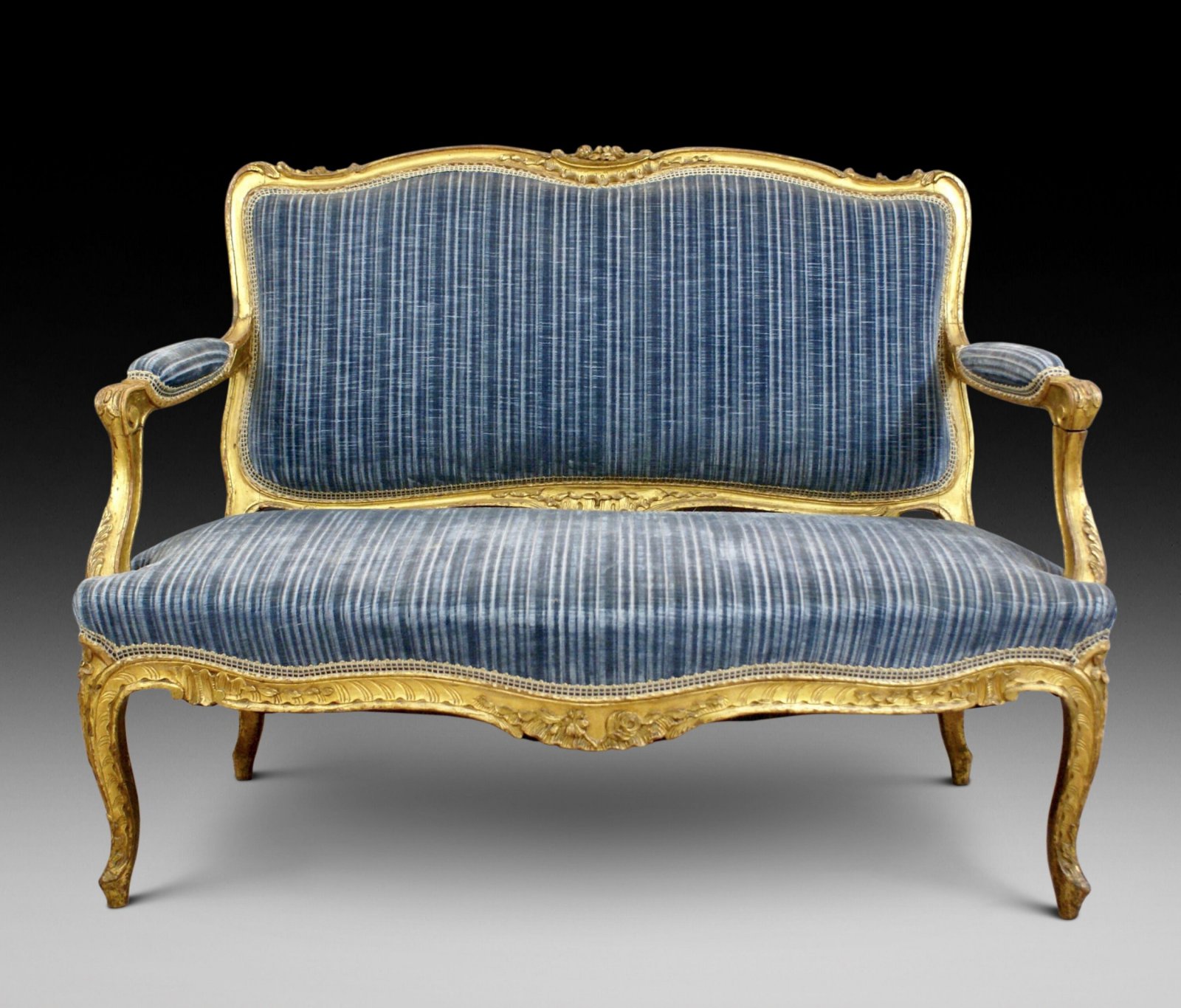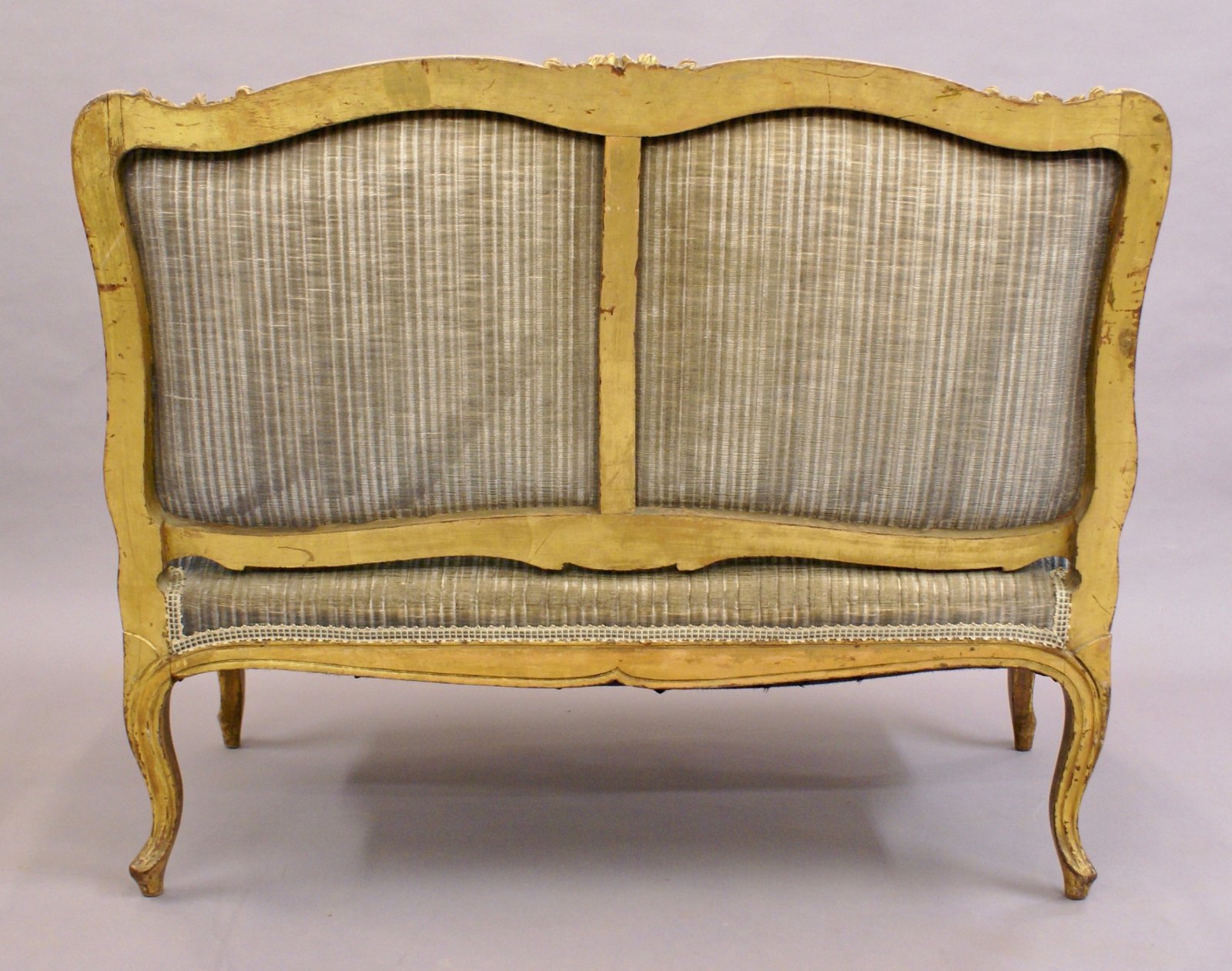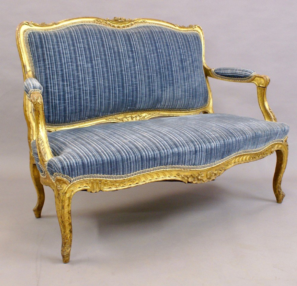 Raised on carved cabroile legs with shaped and carved rails and arms. The sofa is in very original condition and retains its original gilding, the upholstery is several decades old and is in good condition with a firm seat, back and arms. 940mm high, 1260mm wide, 750mm deep and 430mm seat height. Circa 1860.