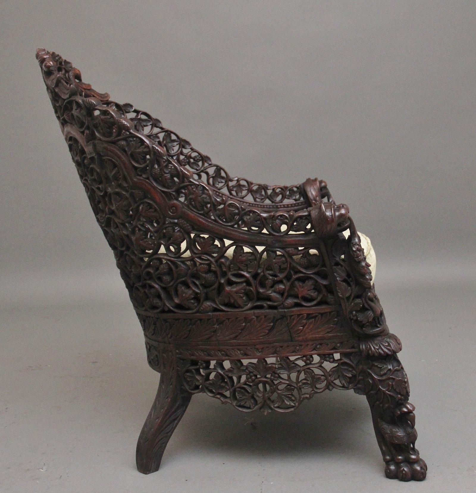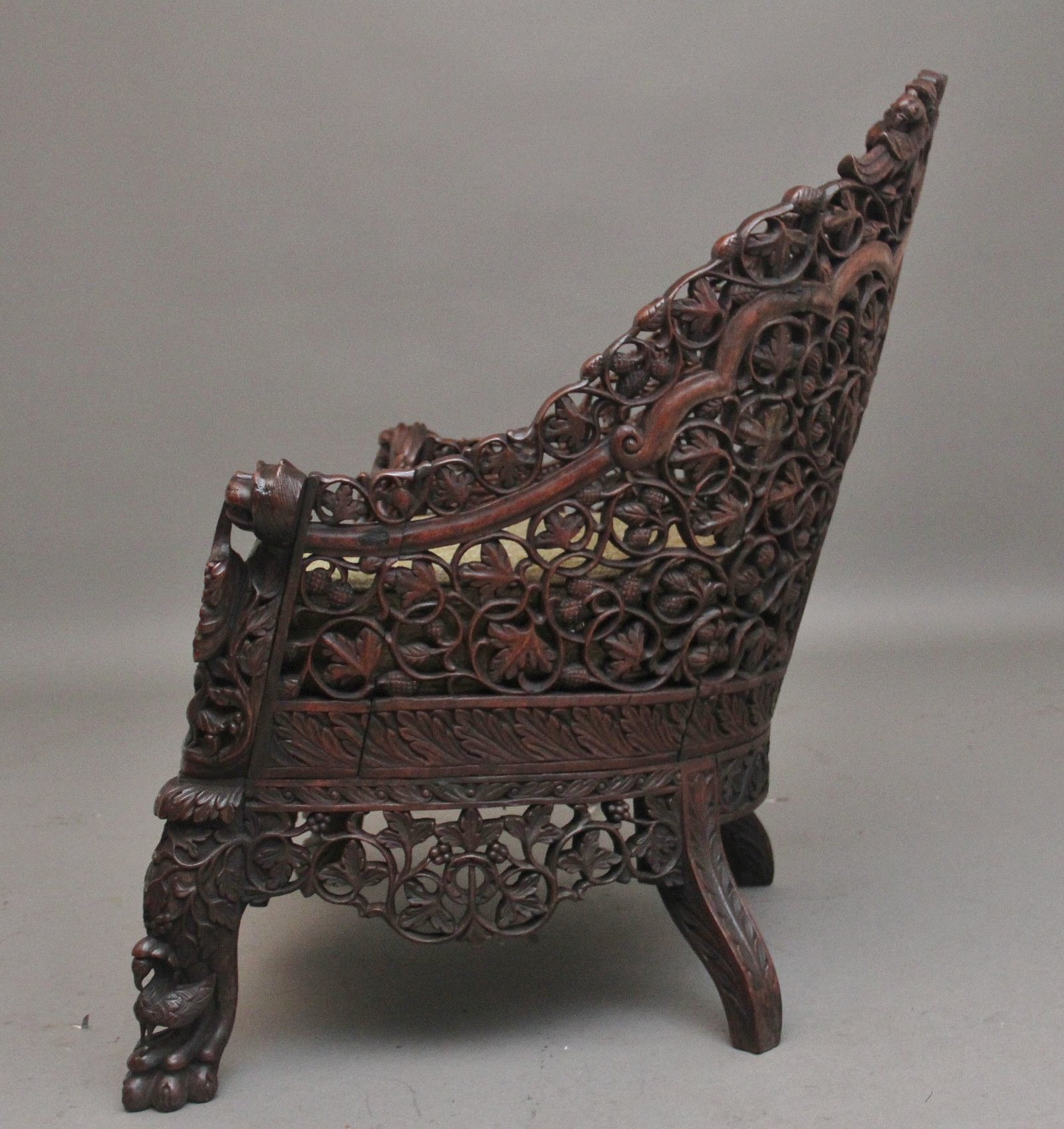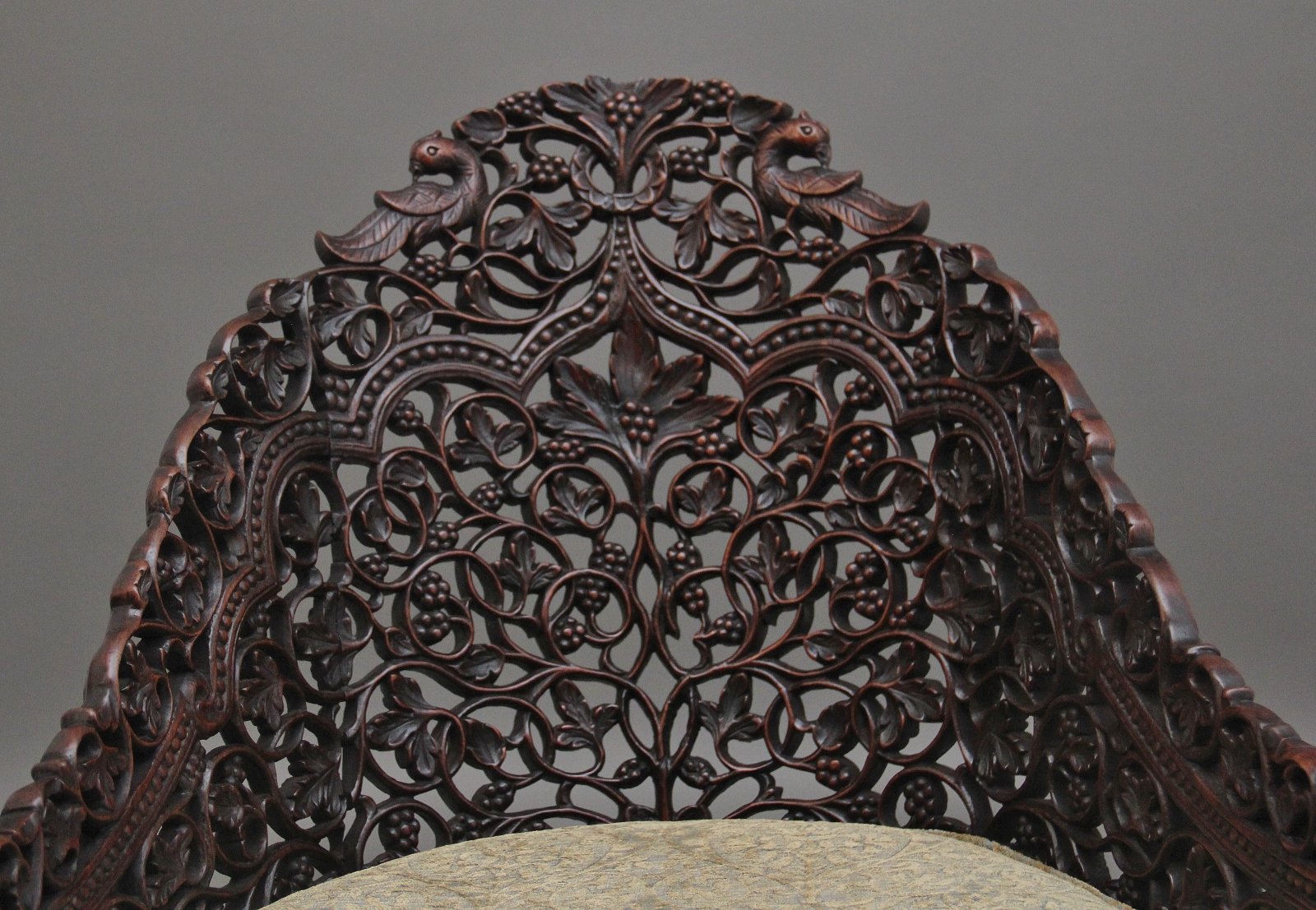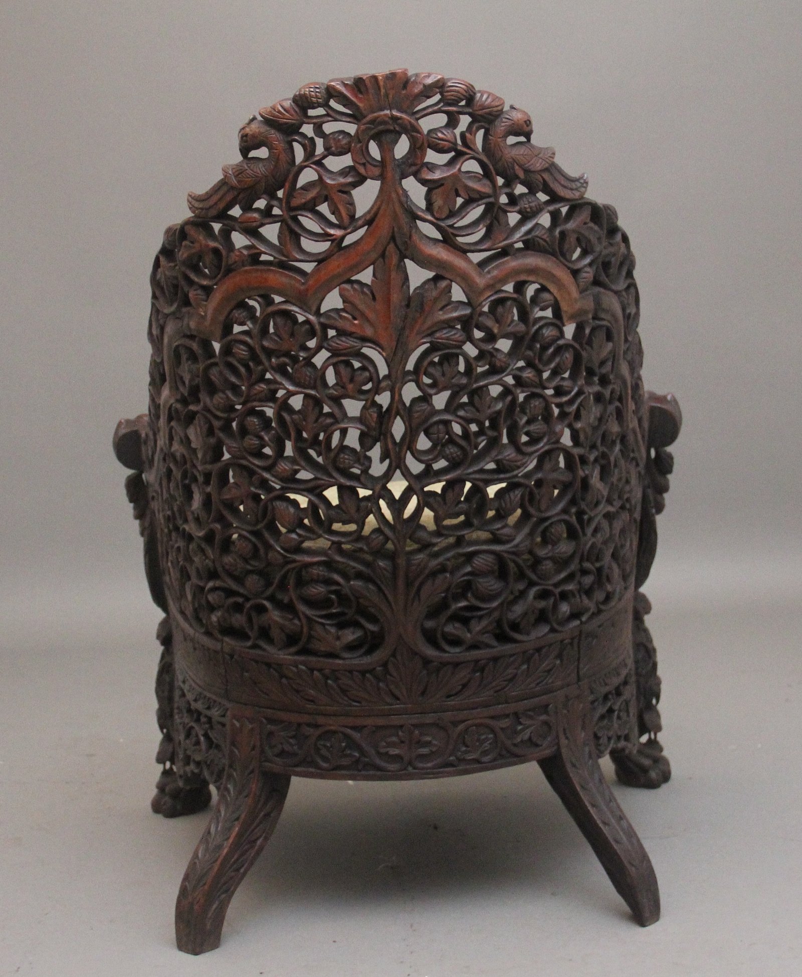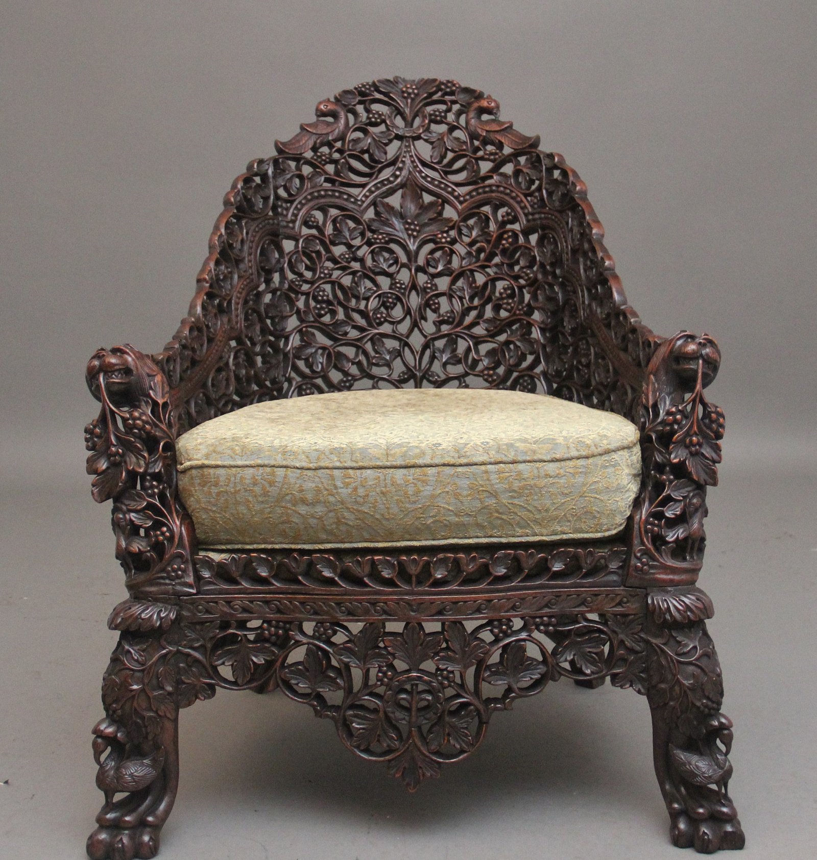 A superb quality 19th Century Anglo-Indian carved hardwood chair, profusely carved all over with carved fret decoration incorporating various birds and foliage, mythical figure heads on the arms, the bottom section having a nice carved shaped apron along the sides and front, standing on four carved legs, with a drop in cushioned seat. Circa 1880.