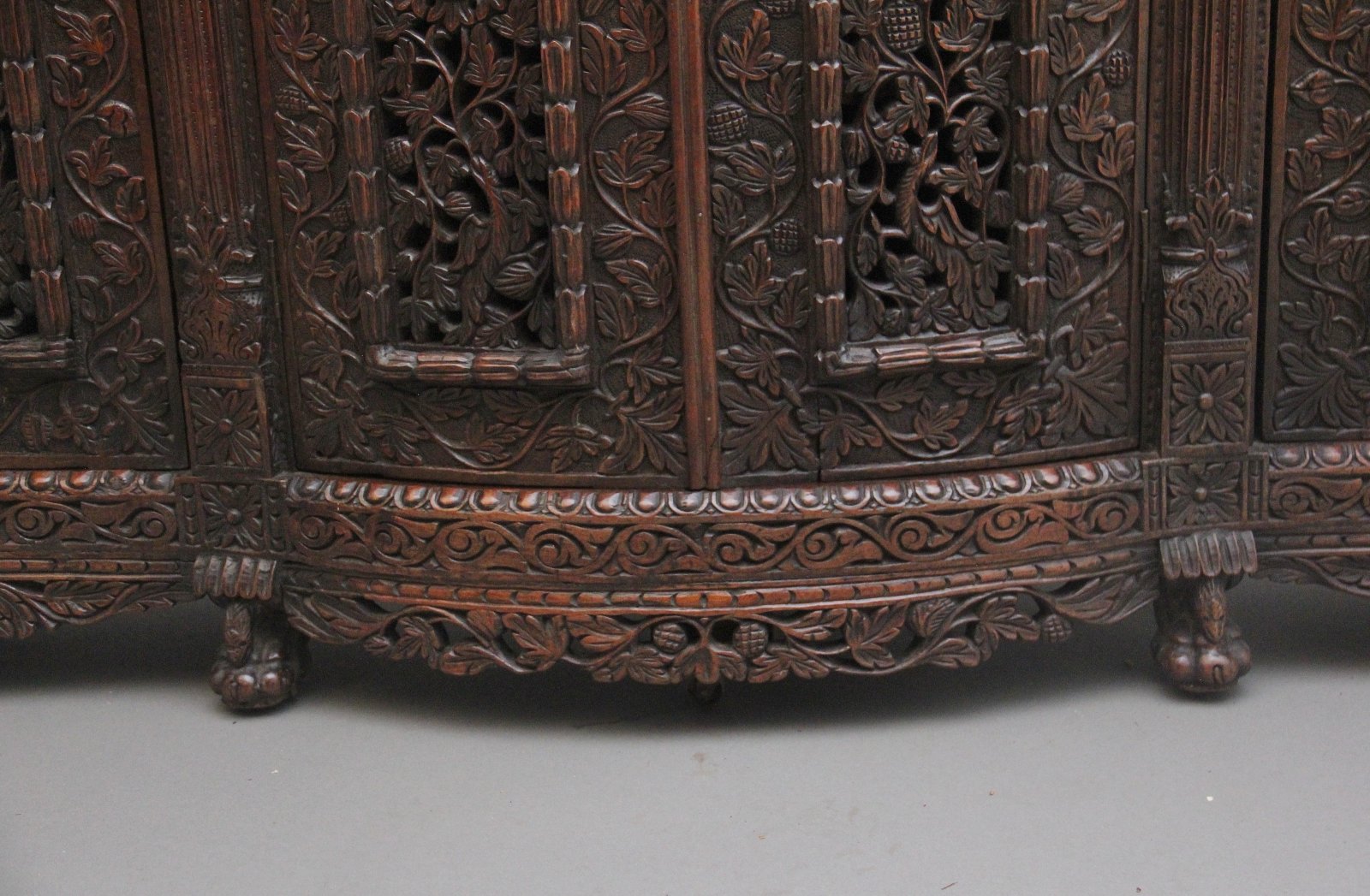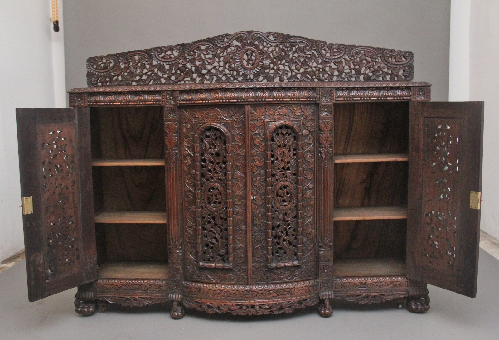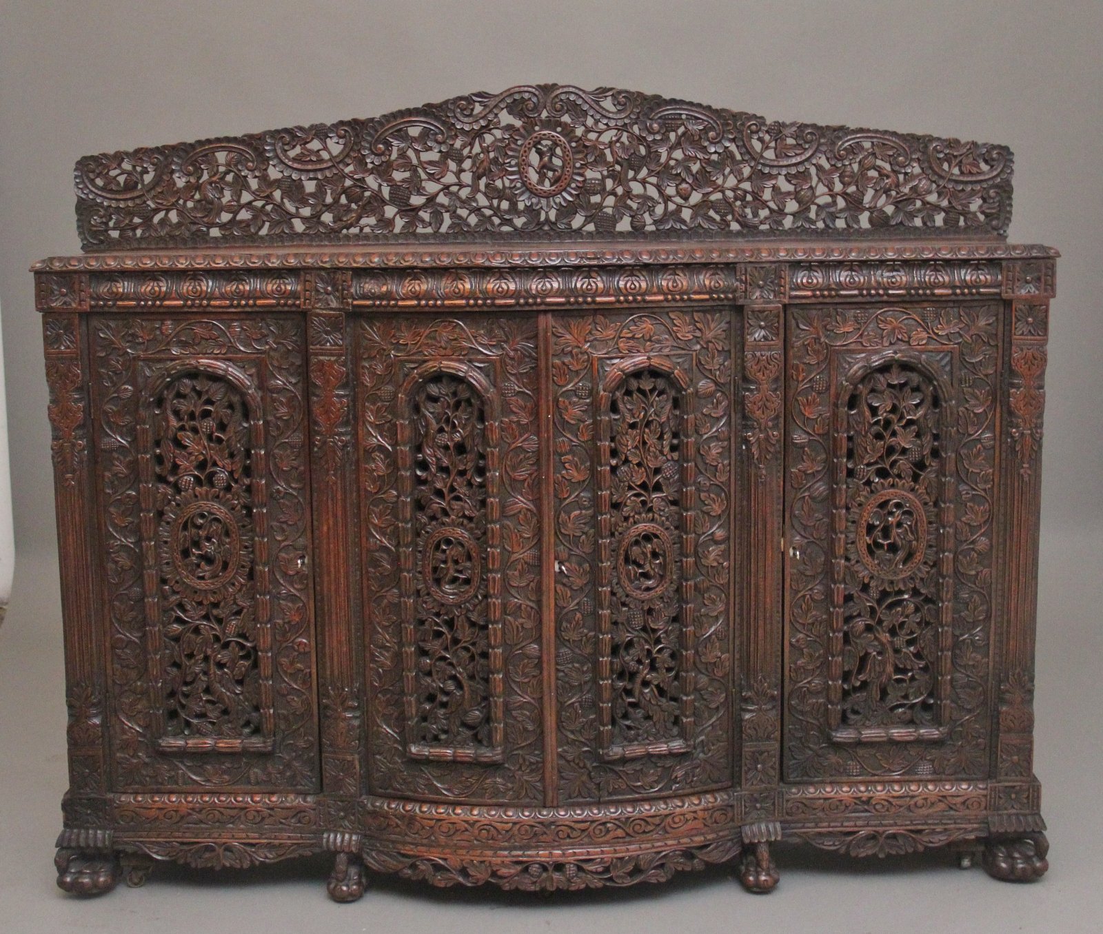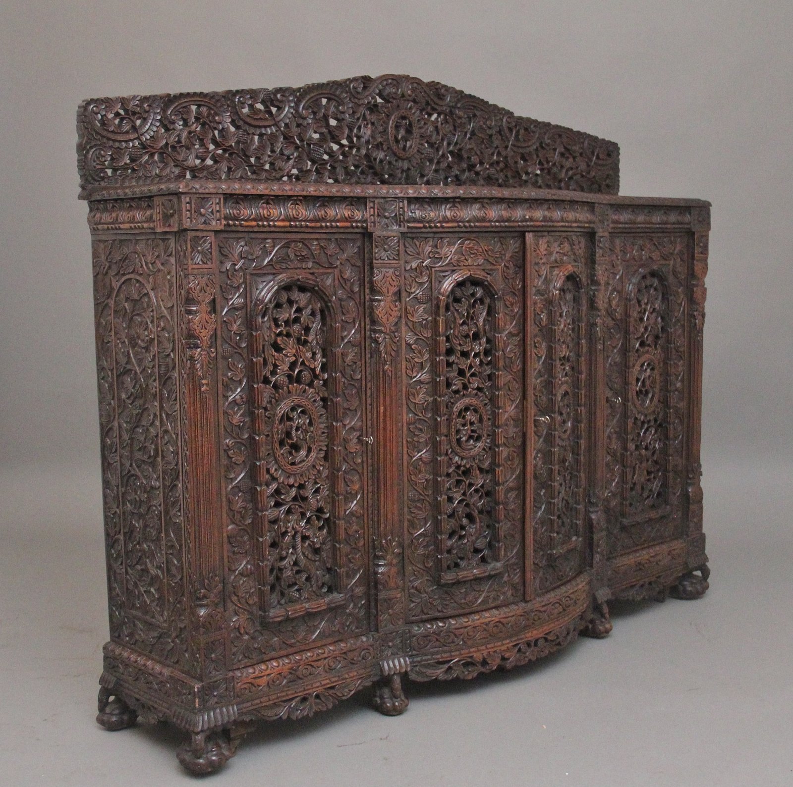 A superb quality 19th Century carved hardwood Anglo- Indian cabinet, the lovely figured shaped top having a highly decorative pierced and carved gallery, beautifully carved moulded edge above a shaped frieze with acanthus leaf carving, with four doors below opening to reveal two fixed shelves inside each section, the central doors being bow fronted, each door having arched panels with trailing carved acorns, the front and sides of the cabinet profusely carved with pierced carving of various foliage and birds, lovely shaped apron and supported on seven carved claw feet. Wonderful crisp carving and in excellent condition, Circa 1860.