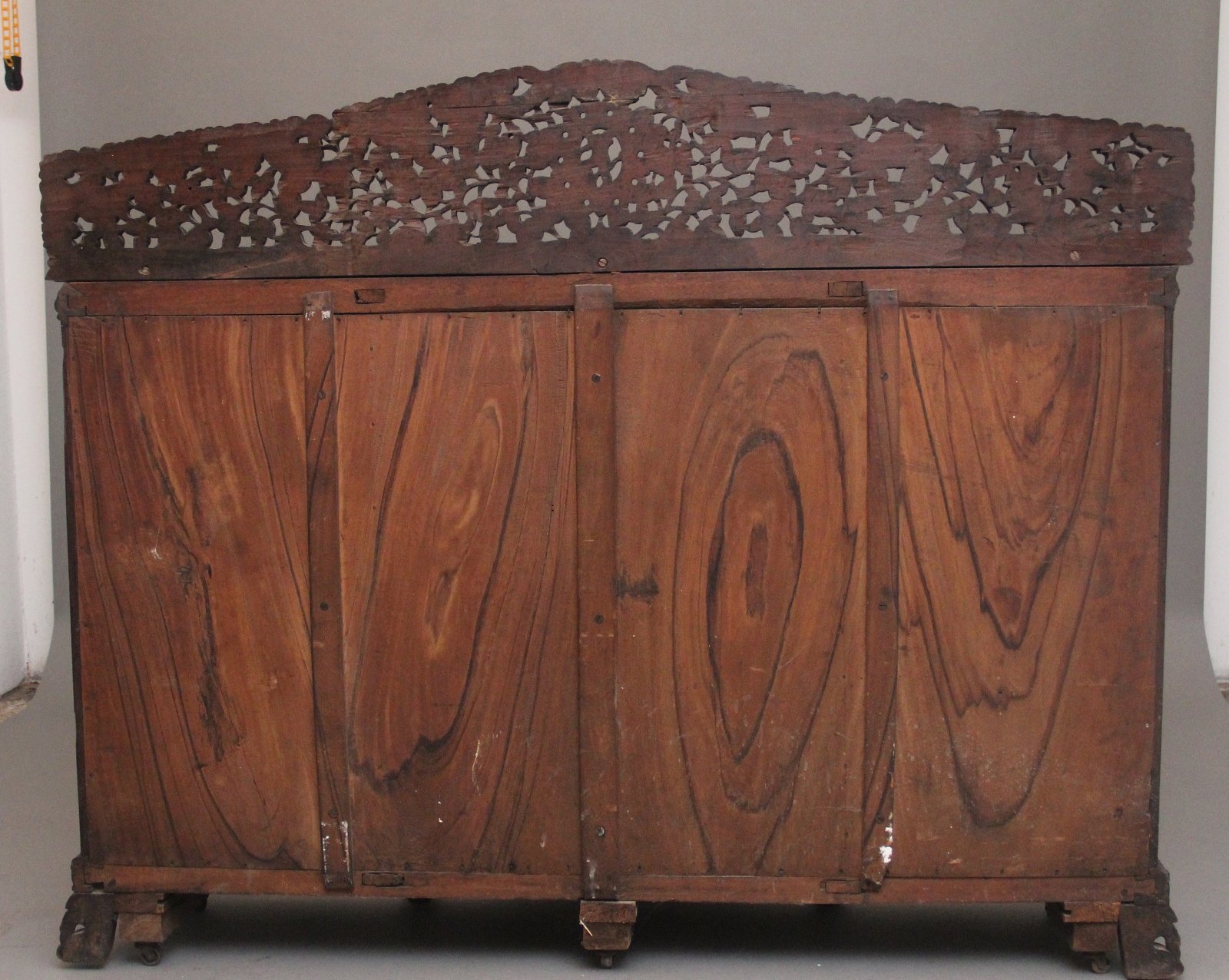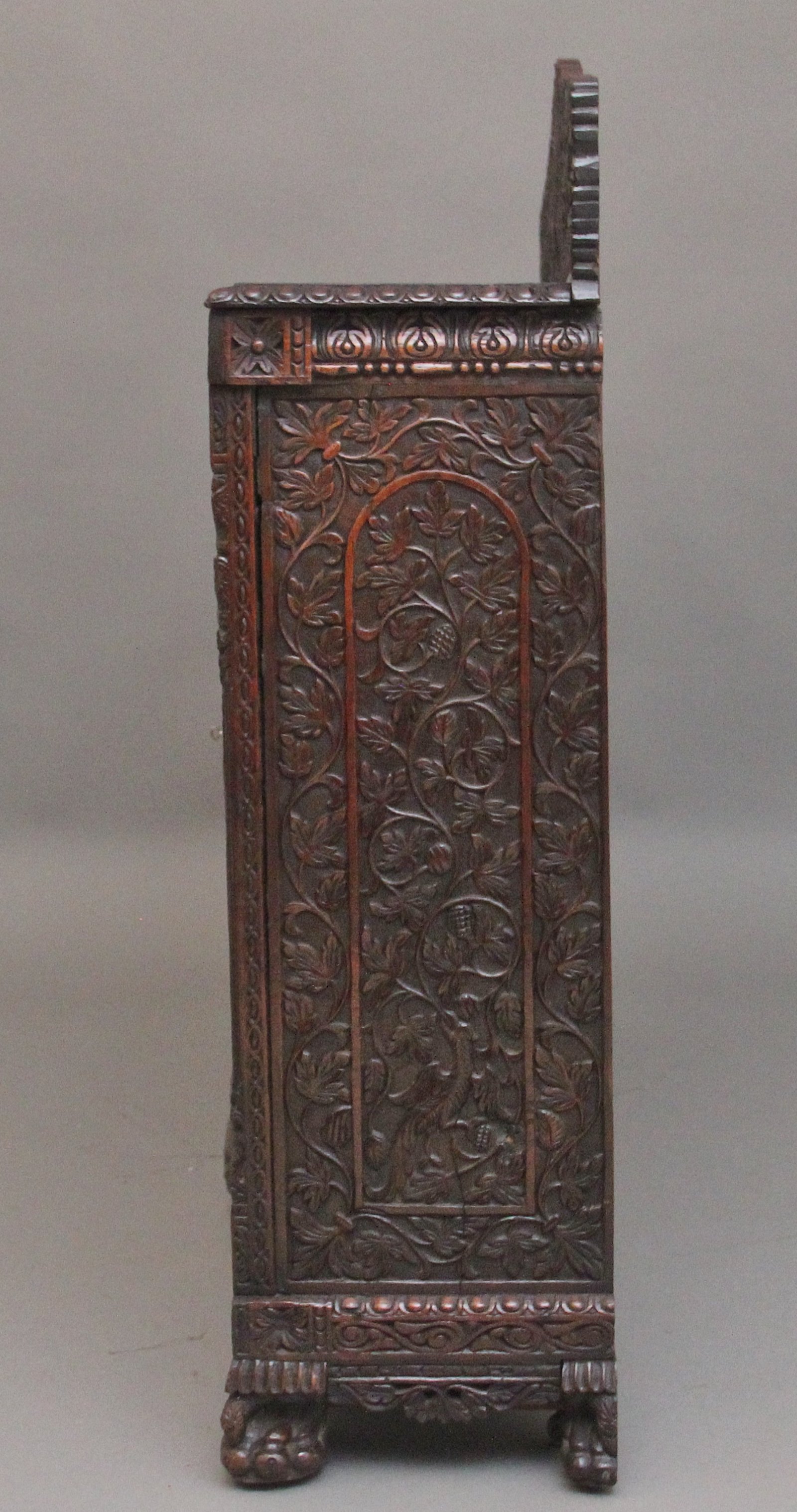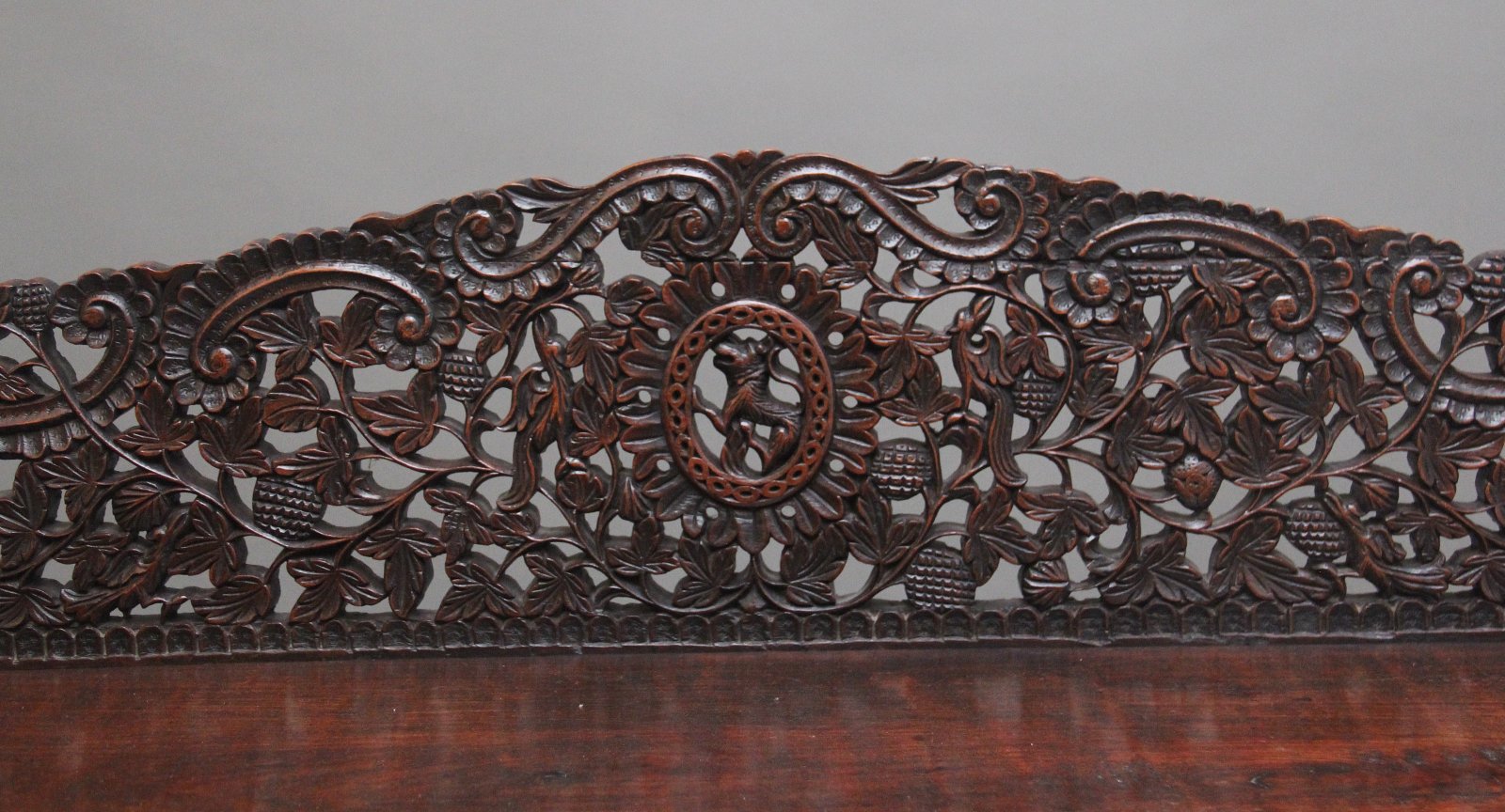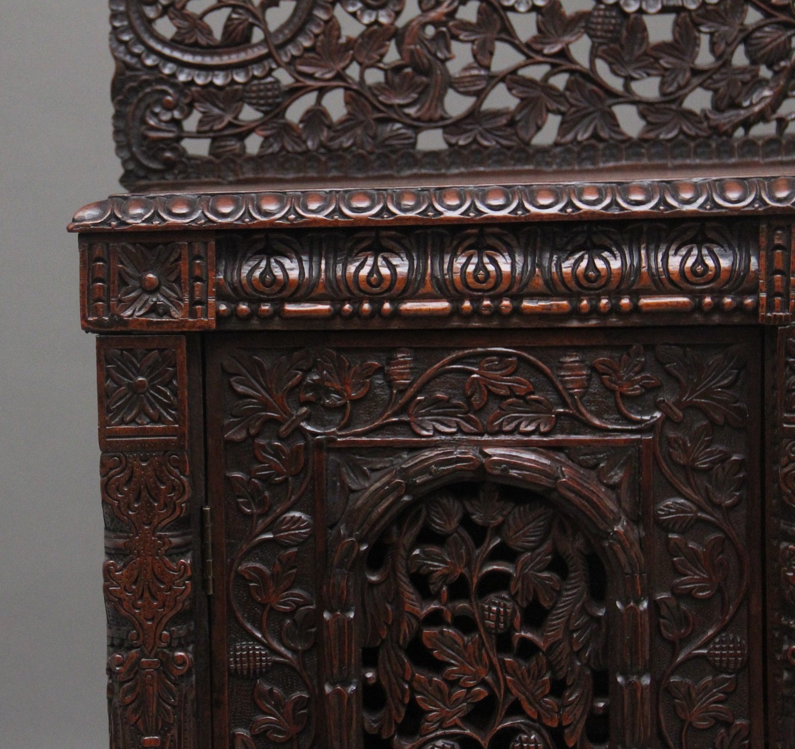 A superb quality 19th Century carved hardwood Anglo- Indian cabinet, the lovely figured shaped top having a highly decorative pierced and carved gallery, beautifully carved moulded edge above a shaped frieze with acanthus leaf carving, with four doors below opening to reveal two fixed shelves inside each section, the central doors being bow fronted, each door having arched panels with trailing carved acorns, the front and sides of the cabinet profusely carved with pierced carving of various foliage and birds, lovely shaped apron and supported on seven carved claw feet. Wonderful crisp carving and in excellent condition, Circa 1860.