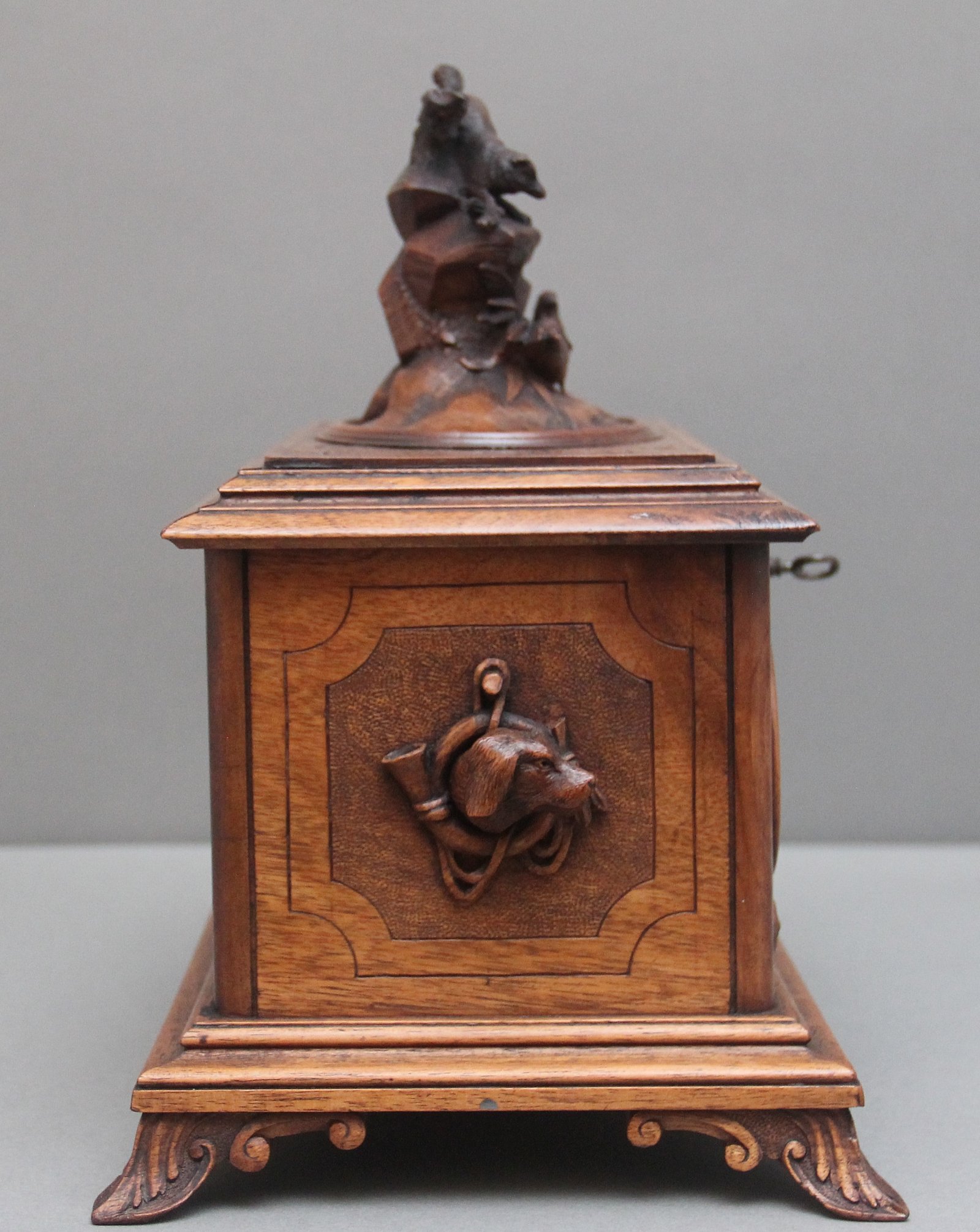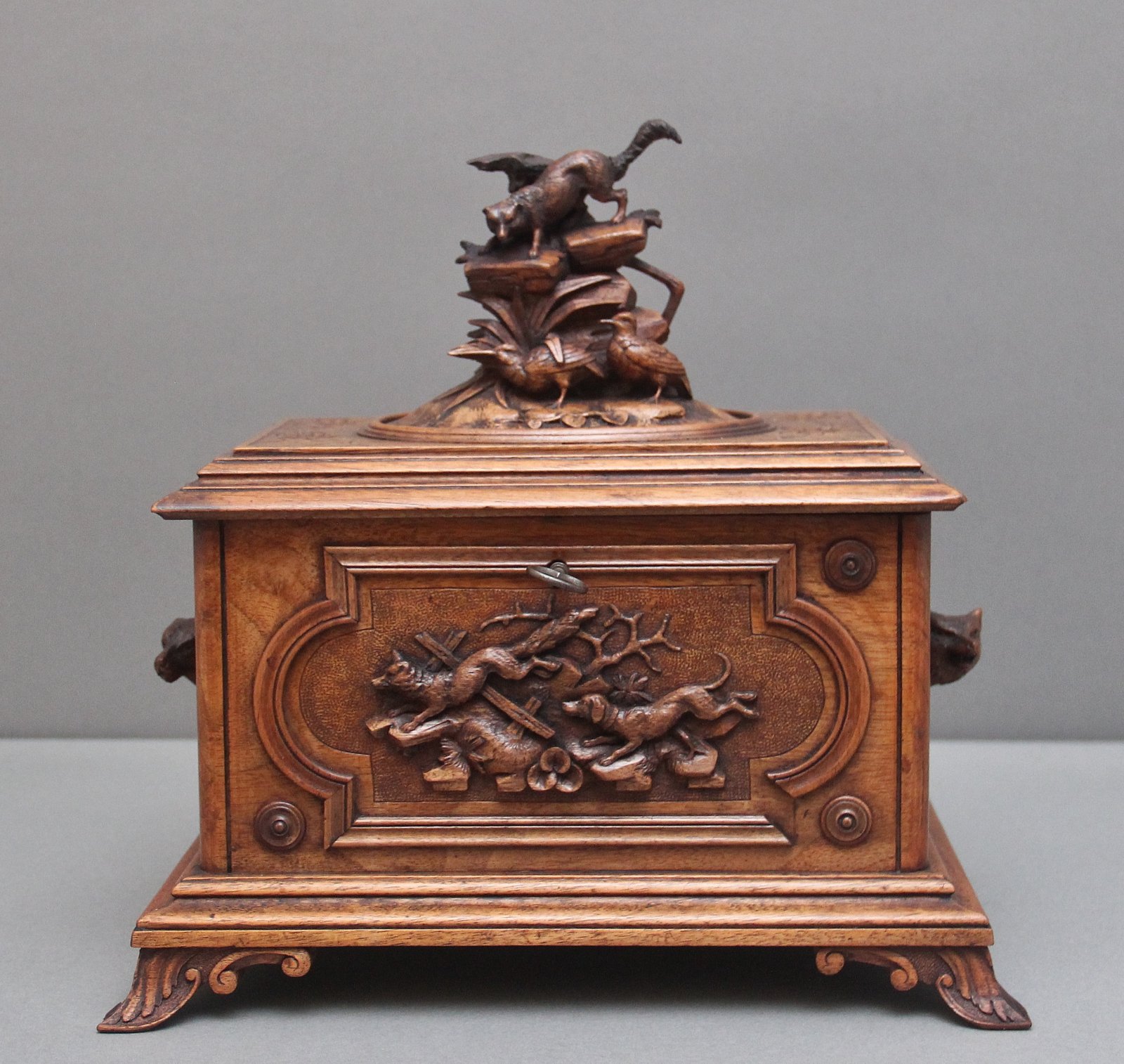A superb quality 19th Century black forest caved wood casket, having wonderful crisp carving throughout, the hinged top lifting up to reveal a large compartment space, has the original key and lock, the top itself has a multi moulded edge with floral carving and an oval plaque at the centre with an ornate carved scene of a fox on a rock formation looking down on a couple of birds, the front of the box there is a shaped panel depicting a hunting scene incorporating a fox and hound and various foliage, the back of the box has the same shaped panel but with floral carving and a rifle, with the sides of the box having a carved head of a fox one side and the other side a carved head of a hound, supported on carved scroll and floral feet. Lovely intricate carving and on great condition. Circa 1870.