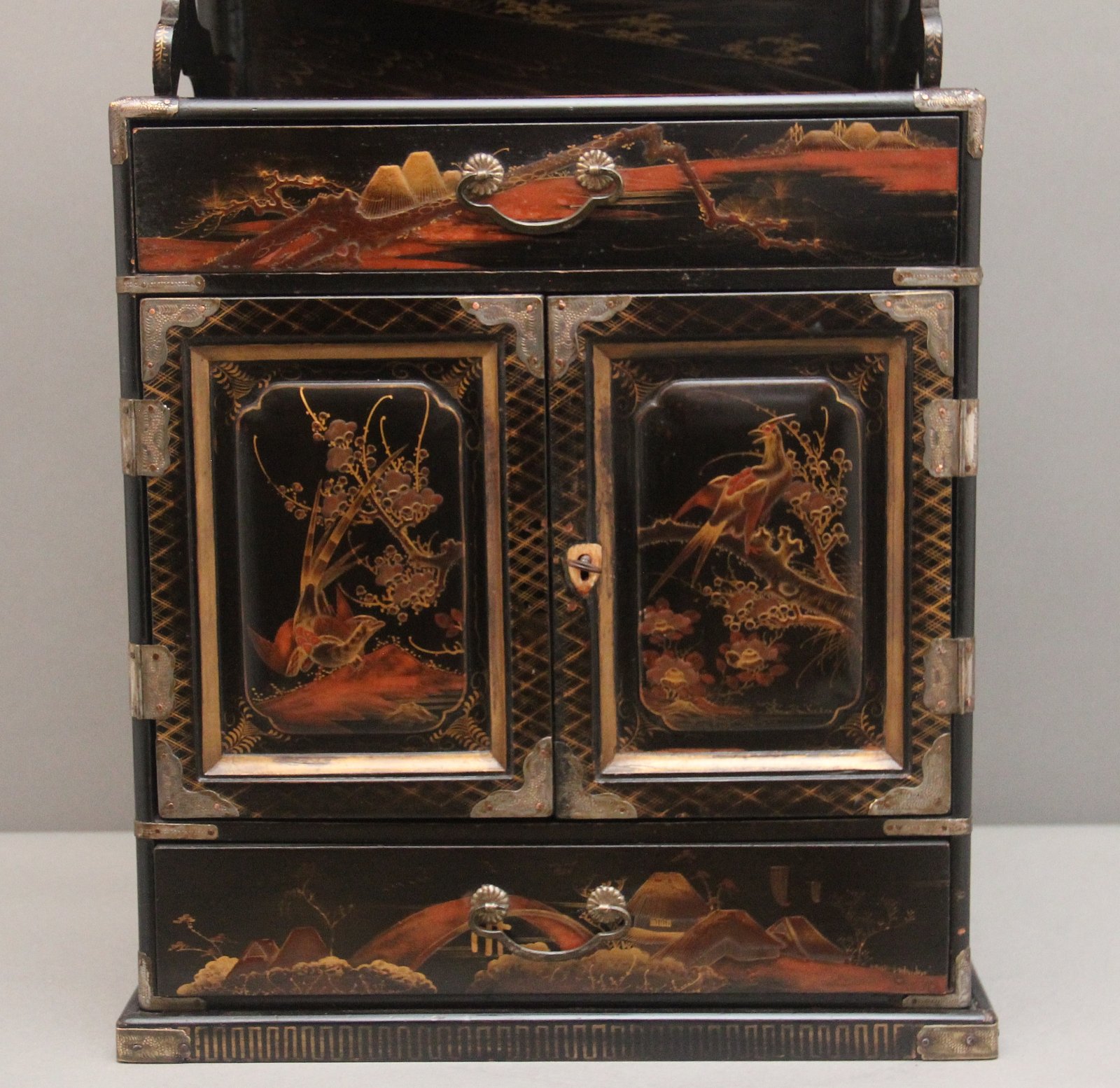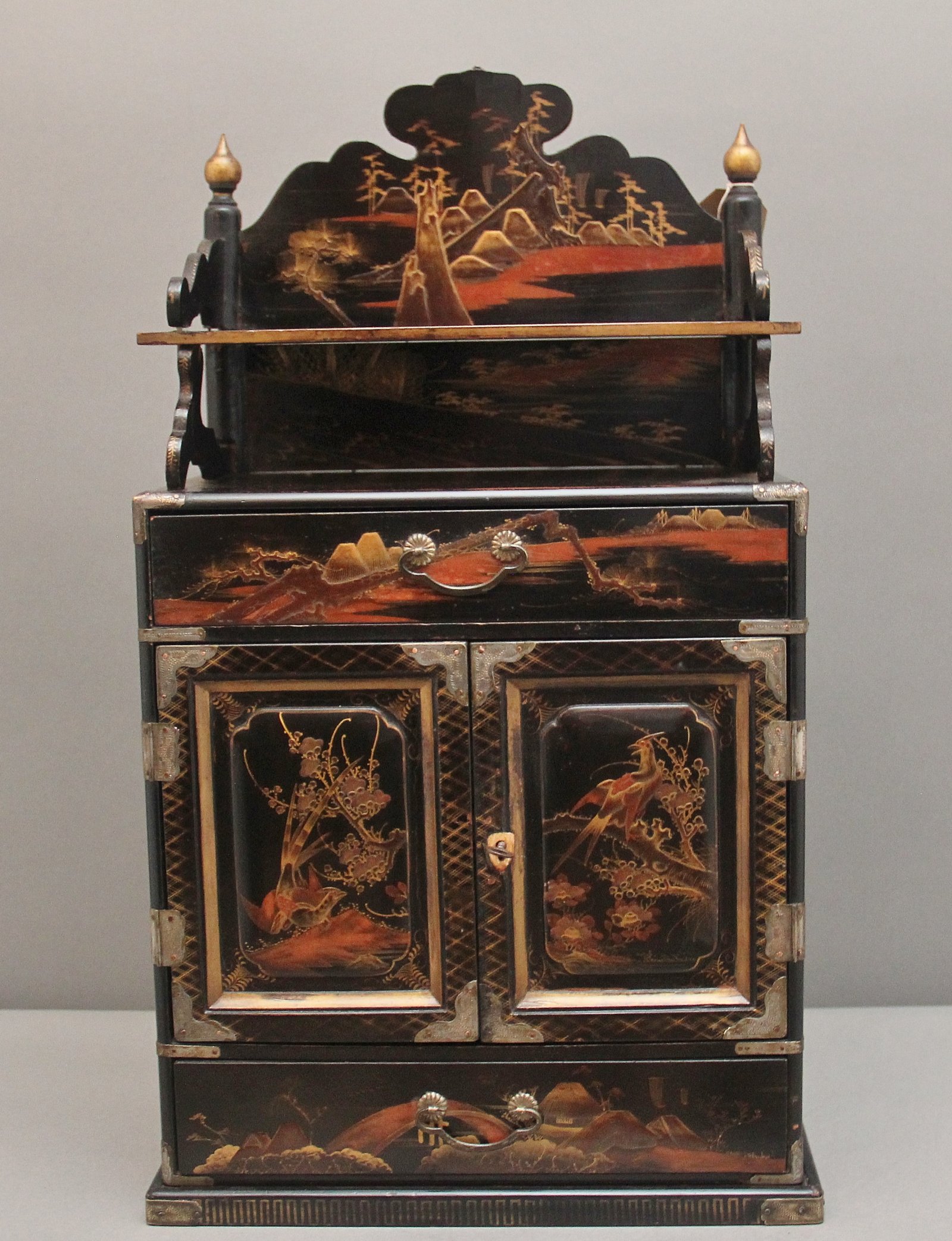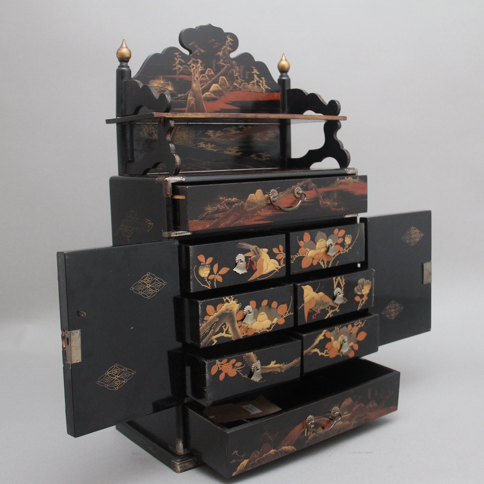 19th Century freestanding Japanese black lacquered and painted table top cabinet from the Meiji period (1868-1912) The cabinet throughout depicting Japanese countryside scenes, various foliage and birds, the top structure having a decorative shaped back and shelf with the main section comprising of two doors at the centre opening to reveal six interior drawers with the drawer fronts painted in the same style as the rest of the cabinet, with a single drawer above and below the doors, all original brassware. A truly decorative item and in great condition. Circa 1880.