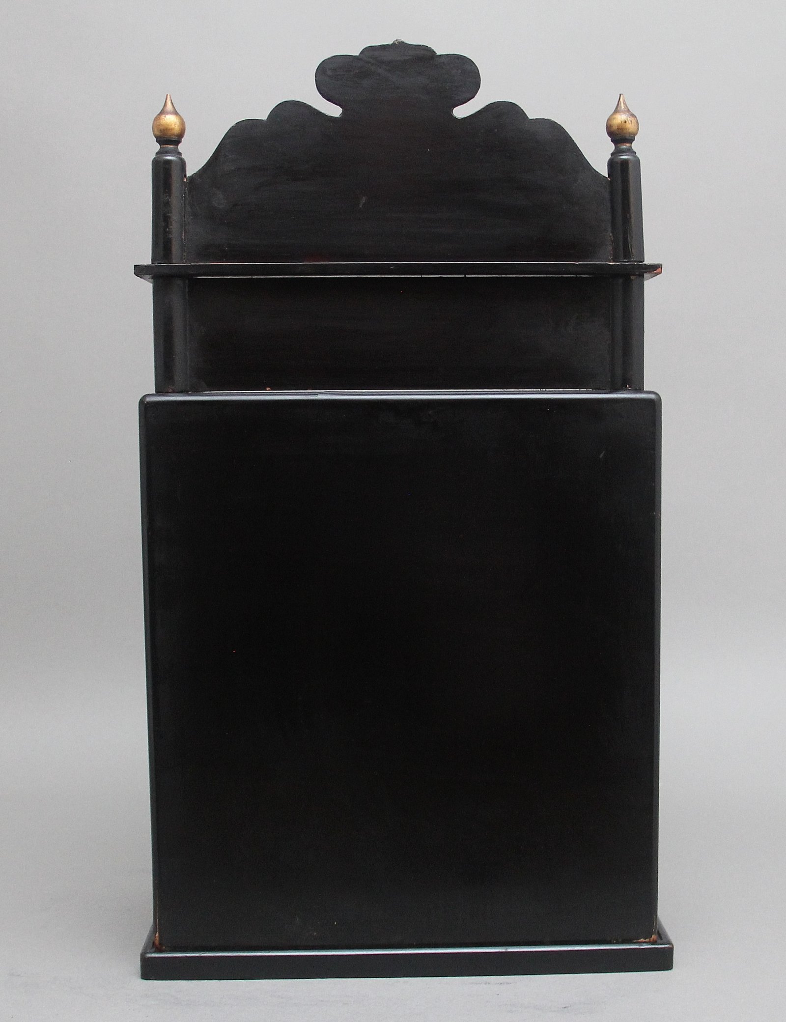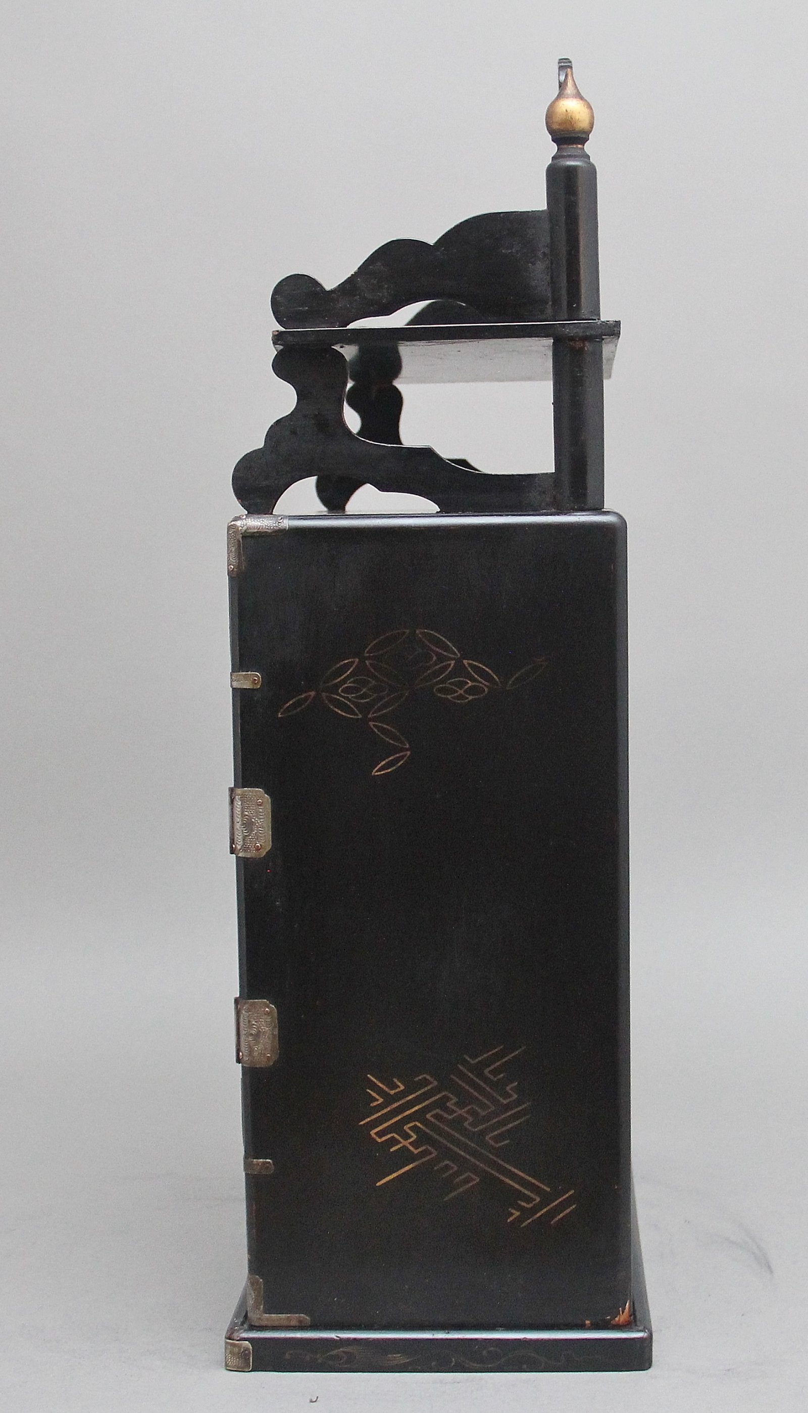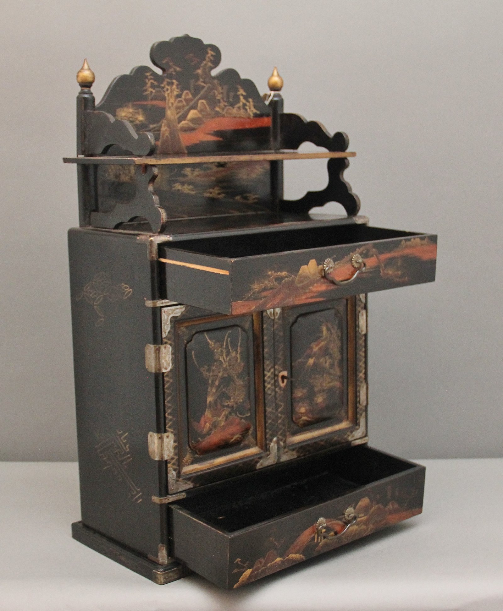 19th Century freestanding Japanese black lacquered and painted table top cabinet from the Meiji period (1868-1912) The cabinet throughout depicting Japanese countryside scenes, various foliage and birds, the top structure having a decorative shaped back and shelf with the main section comprising of two doors at the centre opening to reveal six interior drawers with the drawer fronts painted in the same style as the rest of the cabinet, with a single drawer above and below the doors, all original brassware. A truly decorative item and in great condition. Circa 1880.