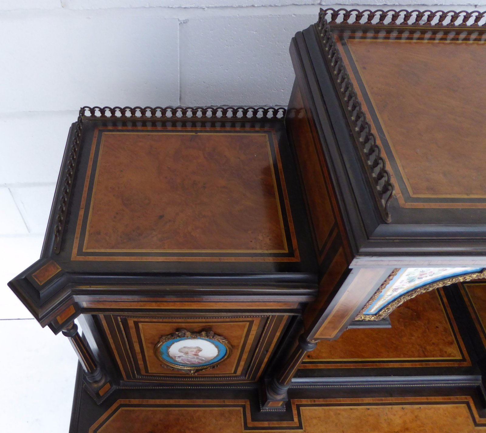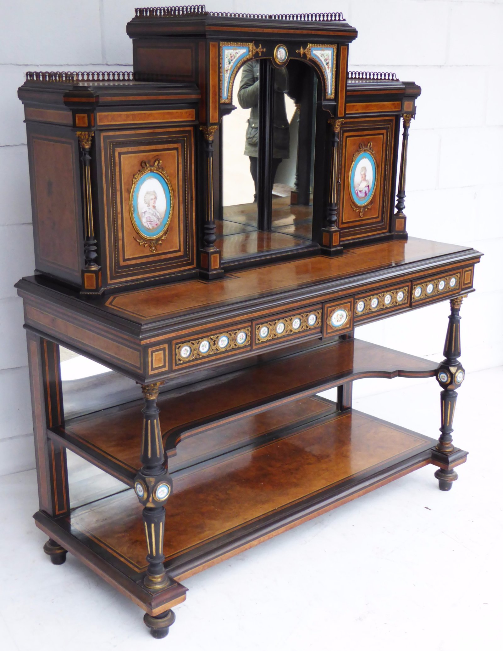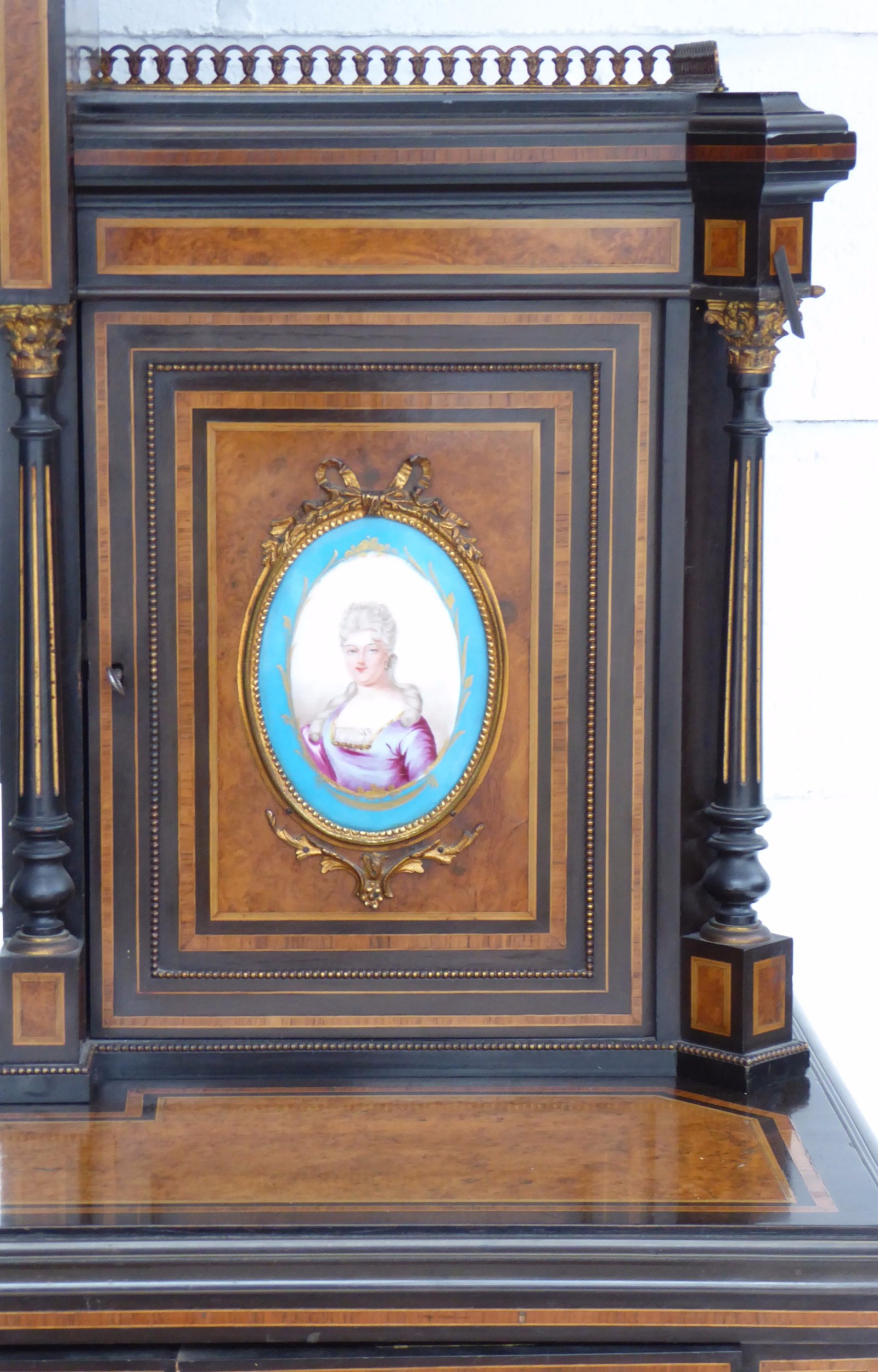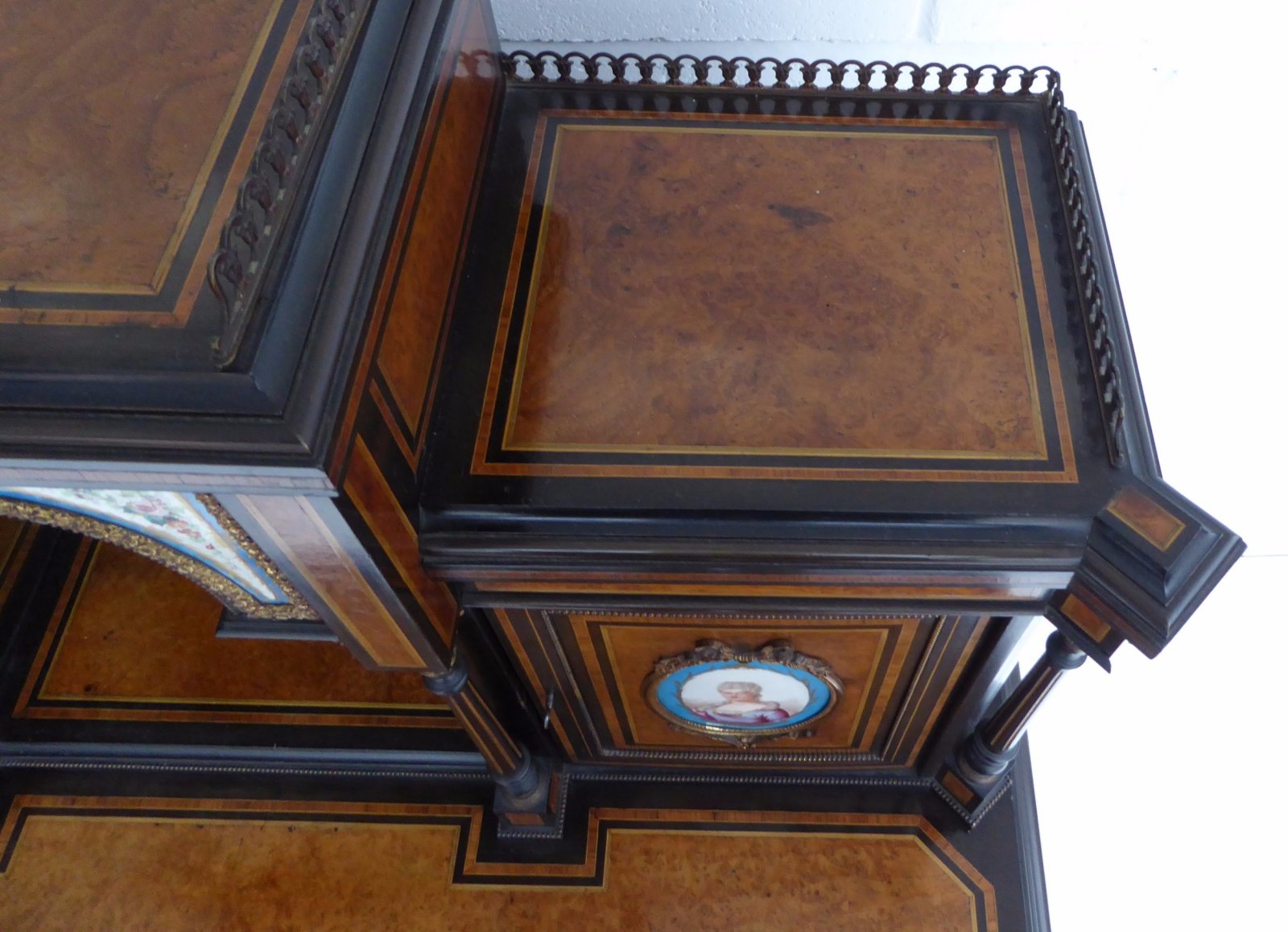 See shipping detailsFor sale is a fine quality 19th Century Ebony and Thuya Wood Bonheur Du Jour. The bonheur du jour has a brass gallery around the top, above a central mirror, flanked by sevres plaques. This piece has two cupboards, each with decorative ormulu and sevres plaques above three drawers. The centre of which opens to reveal a writing slide with a gold tooled leather surface. Below this is a single shelf, backed by a mirror above a further shelf. The bonheur du jour stands on small turned feet and is in good original condition, with minor wear commensurate with age and use.