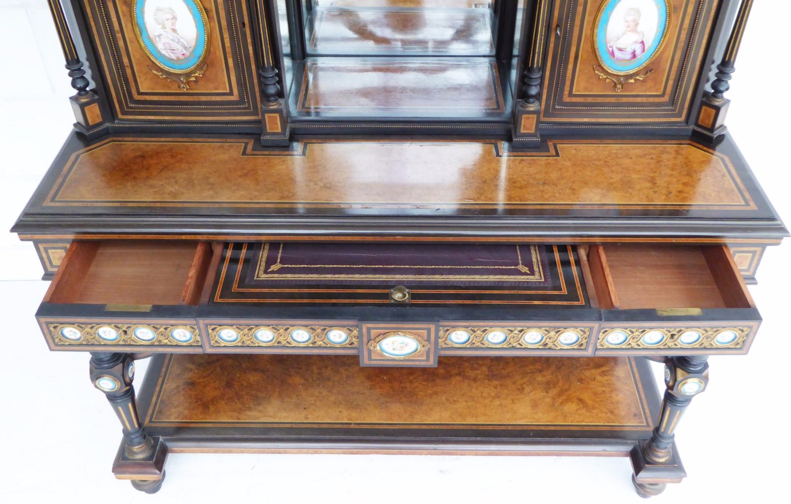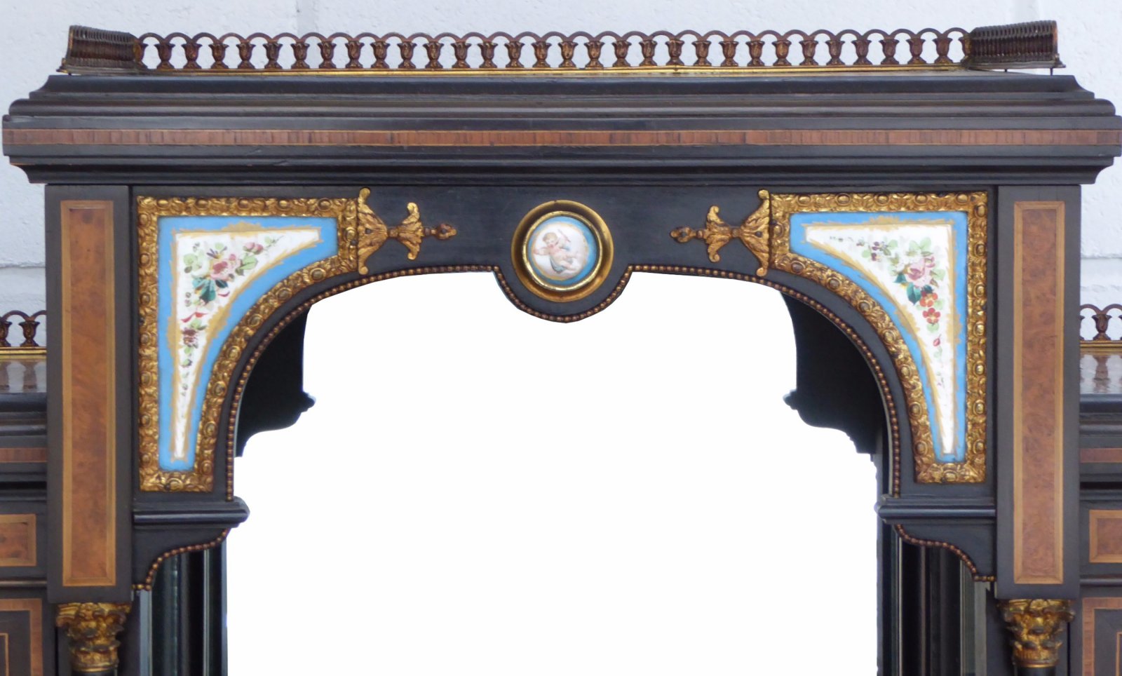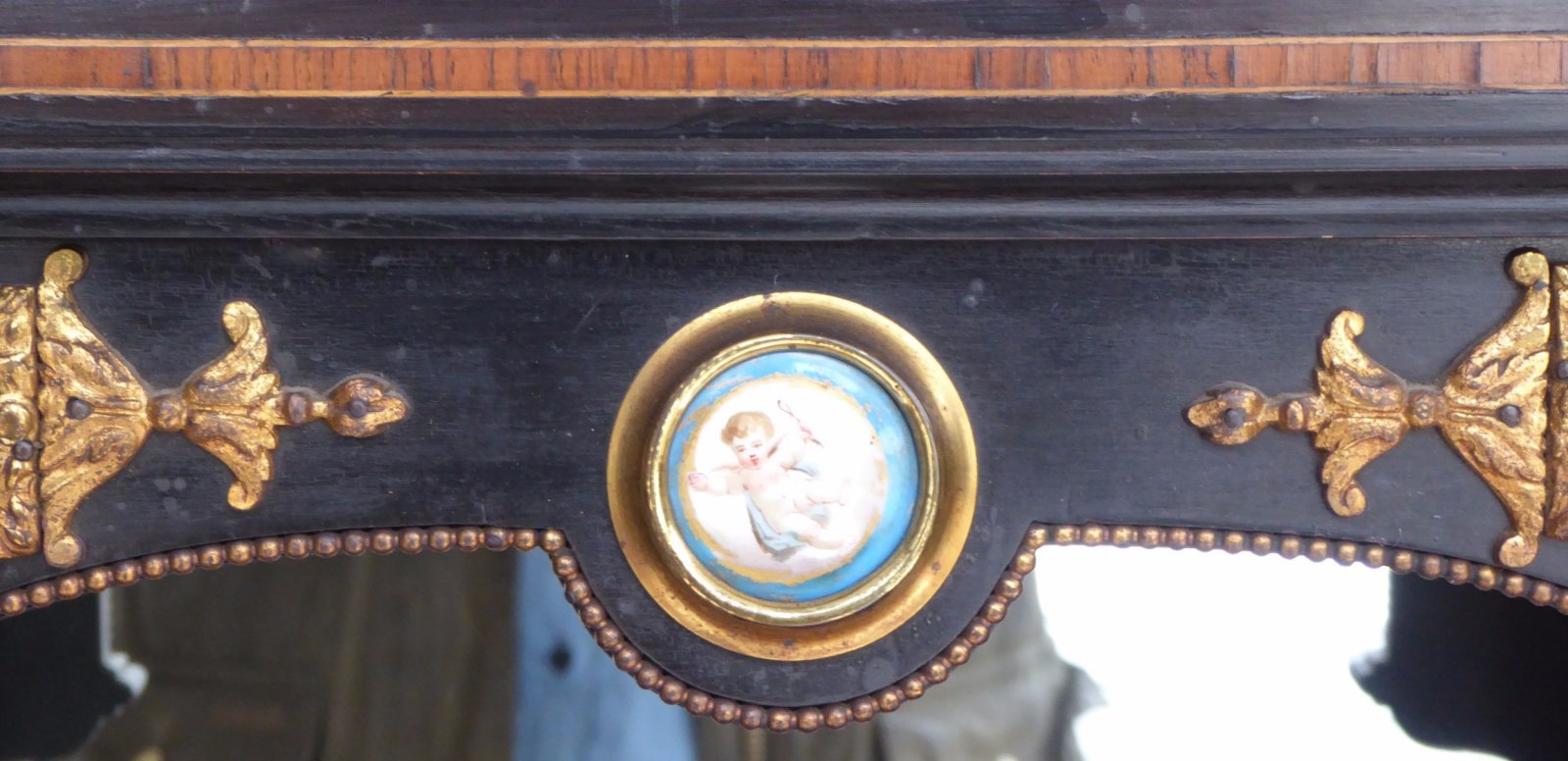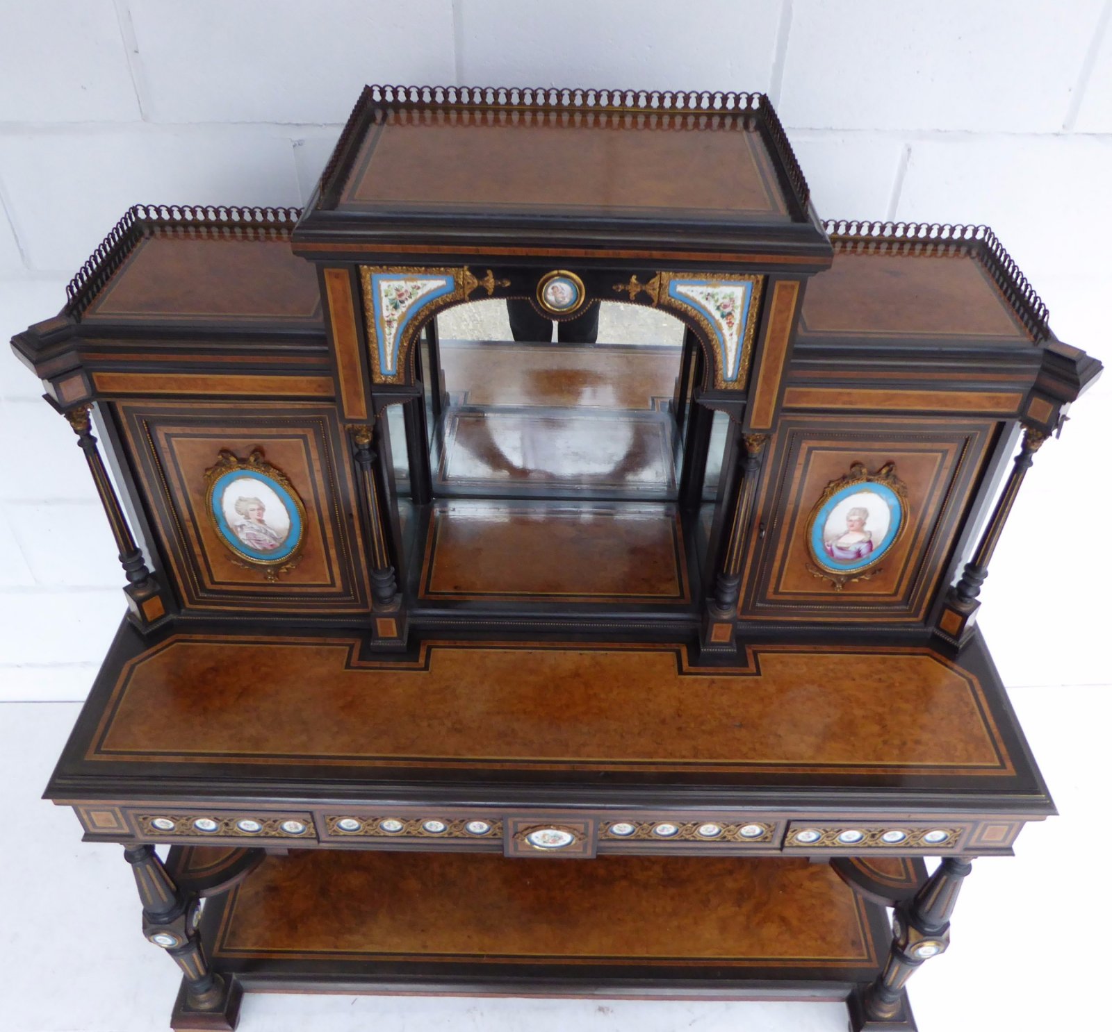 See shipping detailsFor sale is a fine quality 19th Century Ebony and Thuya Wood Bonheur Du Jour. The bonheur du jour has a brass gallery around the top, above a central mirror, flanked by sevres plaques. This piece has two cupboards, each with decorative ormulu and sevres plaques above three drawers. The centre of which opens to reveal a writing slide with a gold tooled leather surface. Below this is a single shelf, backed by a mirror above a further shelf. The bonheur du jour stands on small turned feet and is in good original condition, with minor wear commensurate with age and use.