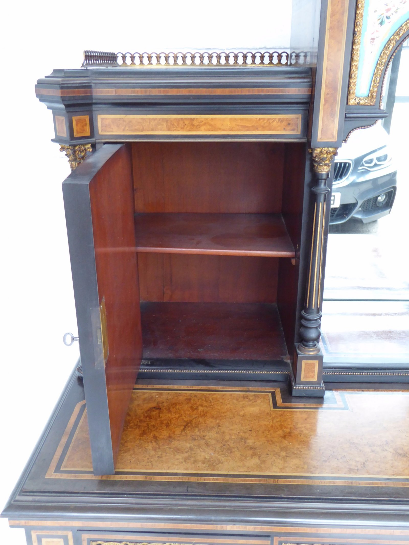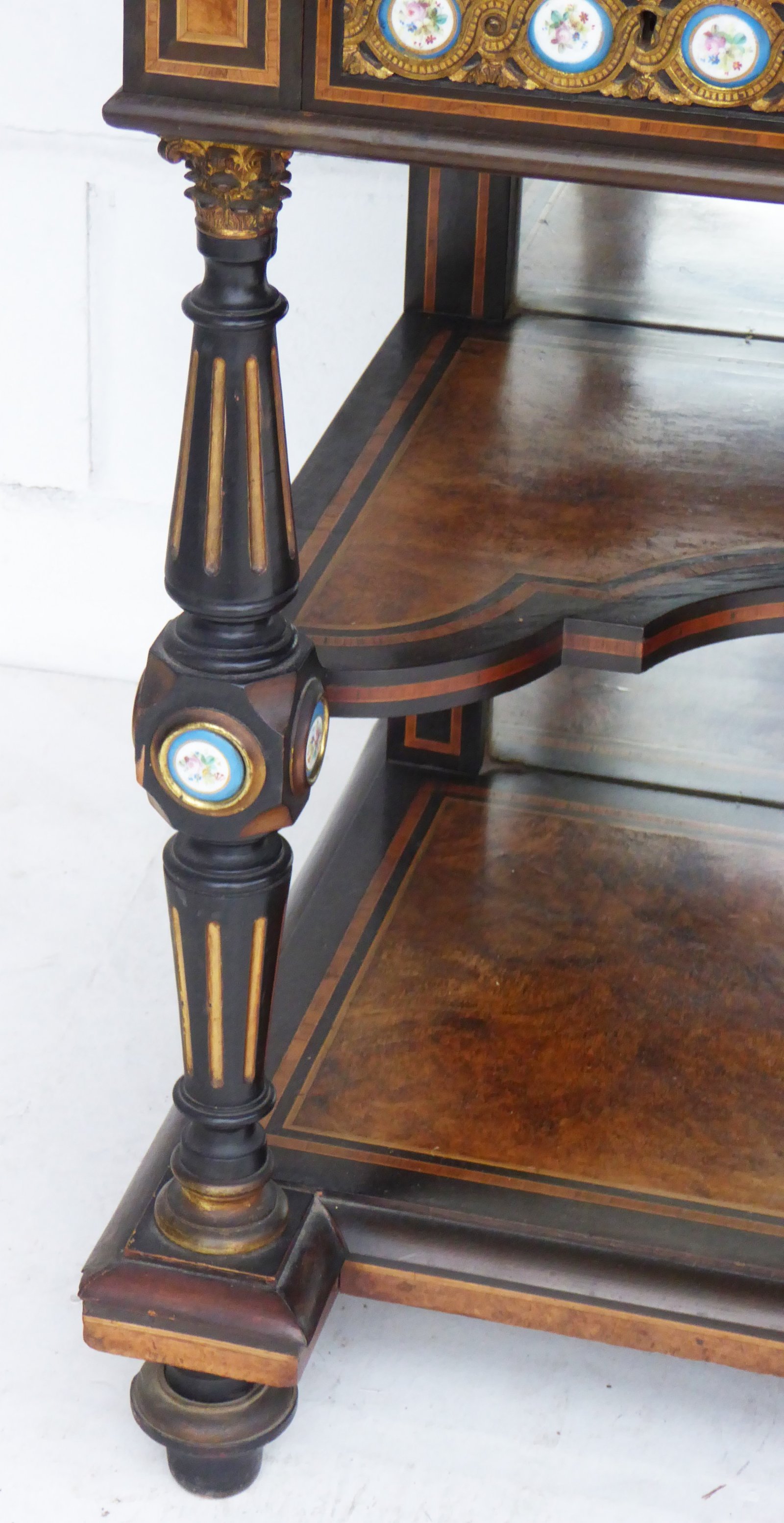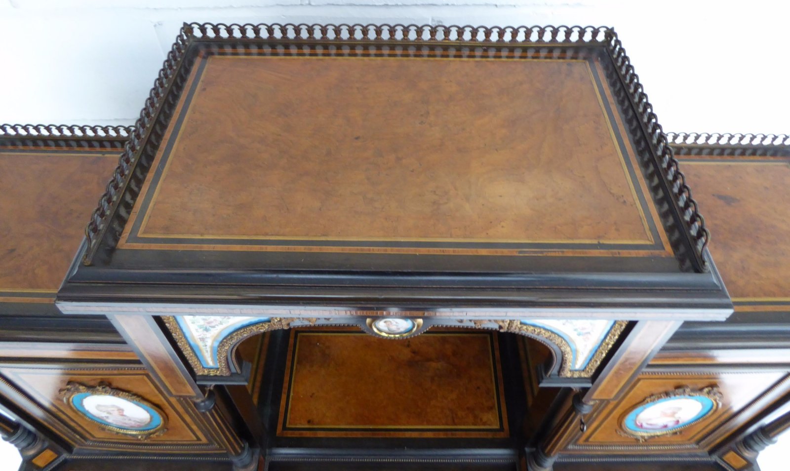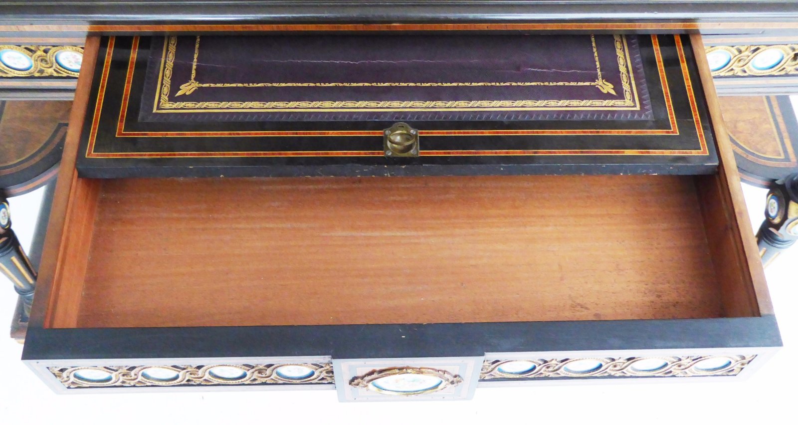 See shipping detailsFor sale is a fine quality 19th Century Ebony and Thuya Wood Bonheur Du Jour. The bonheur du jour has a brass gallery around the top, above a central mirror, flanked by sevres plaques. This piece has two cupboards, each with decorative ormulu and sevres plaques above three drawers. The centre of which opens to reveal a writing slide with a gold tooled leather surface. Below this is a single shelf, backed by a mirror above a further shelf. The bonheur du jour stands on small turned feet and is in good original condition, with minor wear commensurate with age and use.