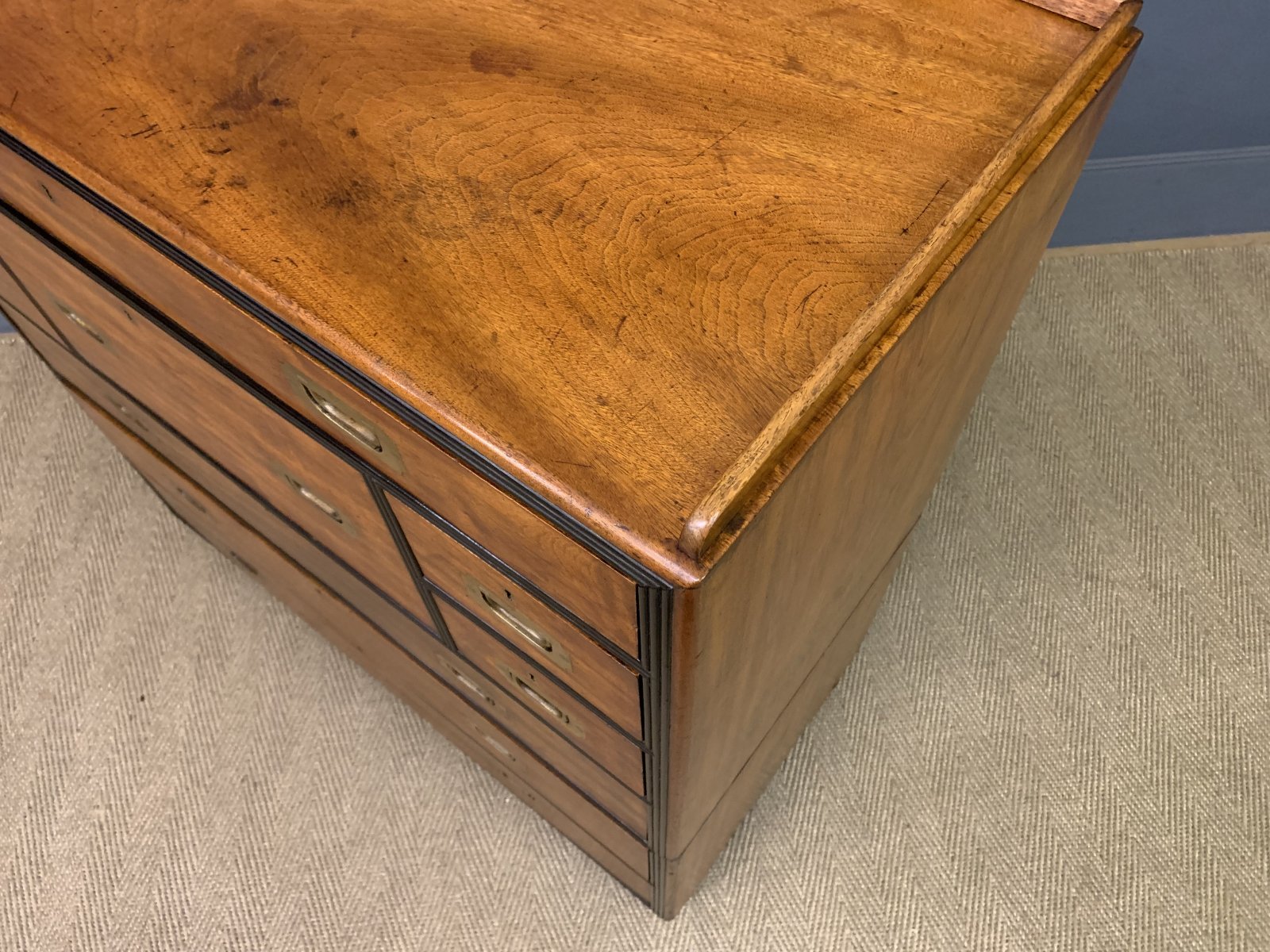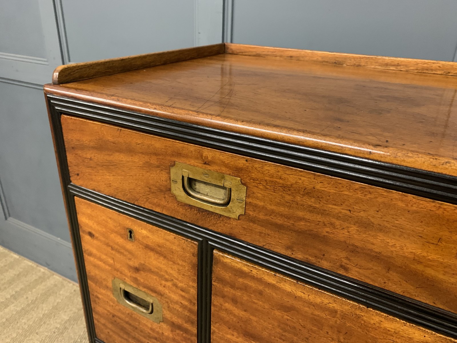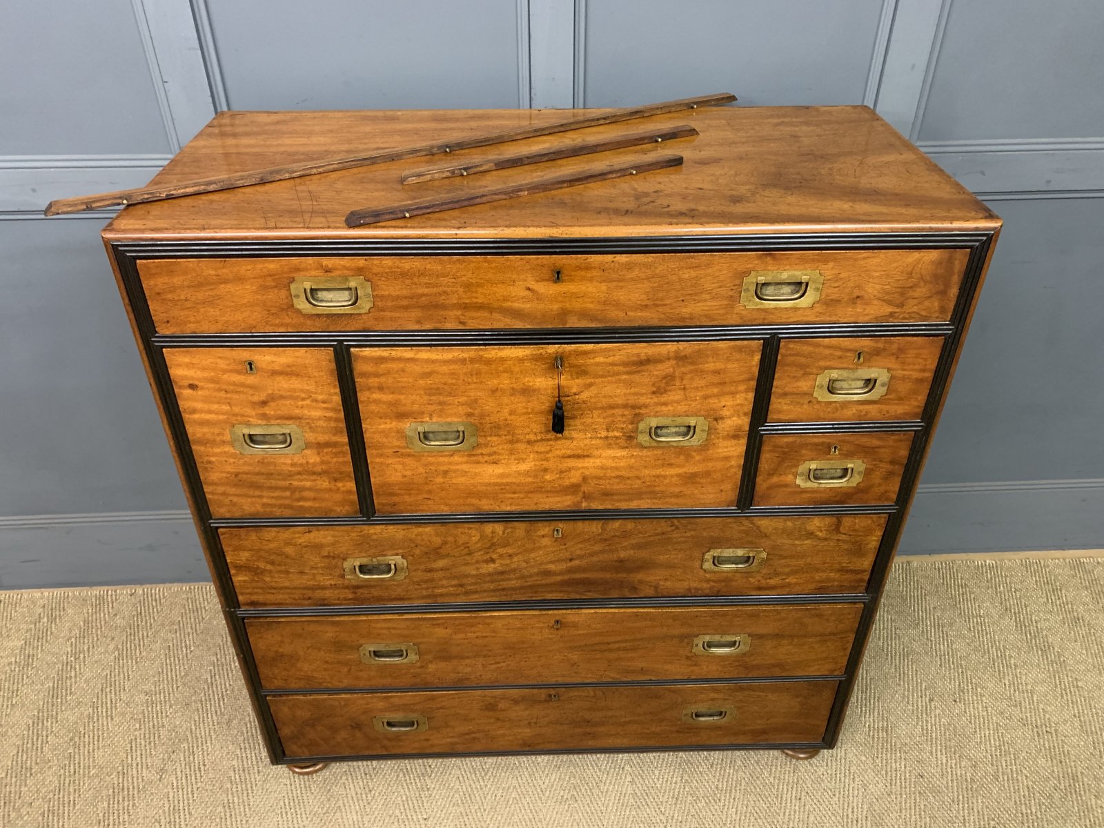 A very fine example of a mid 19th century military chest of drawers. Of colonial origin, most likely Anglo-Indian and dating to 1830-1840. Of excellent construction is solid camphorwood and finished with ebony moldings. Fitted with original solid brass recessed handles. Splits into 2 sections for ease of installation. The top section with a secretaire drawer flanked by shorter drawers and with a long drawer above. The bottom section with 3 long drawers. All drawers are lockable (key supplied). The secretaire drawer opens to reveal a fitted interior , complete with a sumptuous black leather writing surface. To the top is a gallery (detachable) and the whole chest stands on turned bun feet. This chest exudes charm and colonial elegance. Sympathetically refinished in our workshops and now offered for sale in excellent condition, ready to go straight into the home.