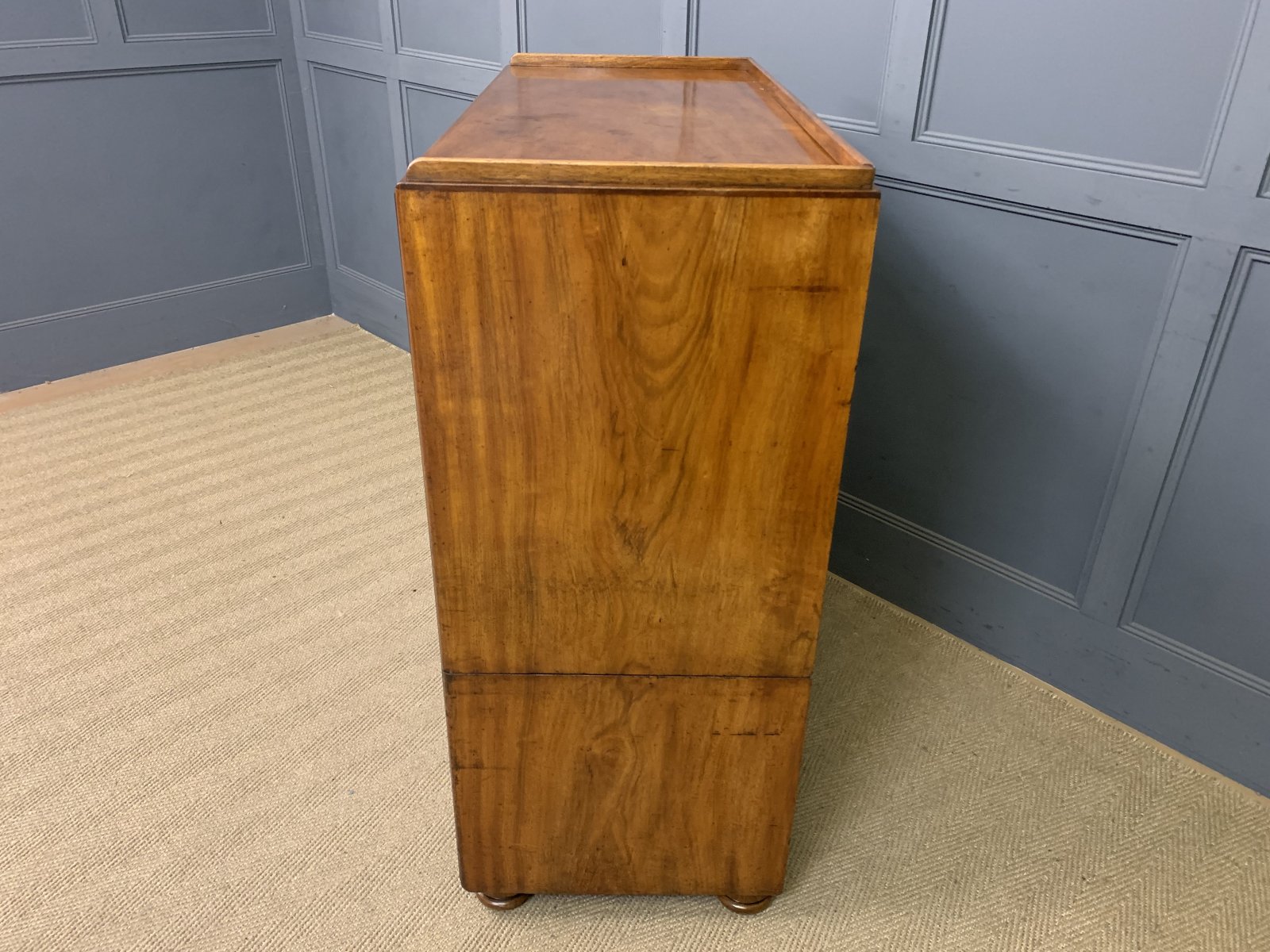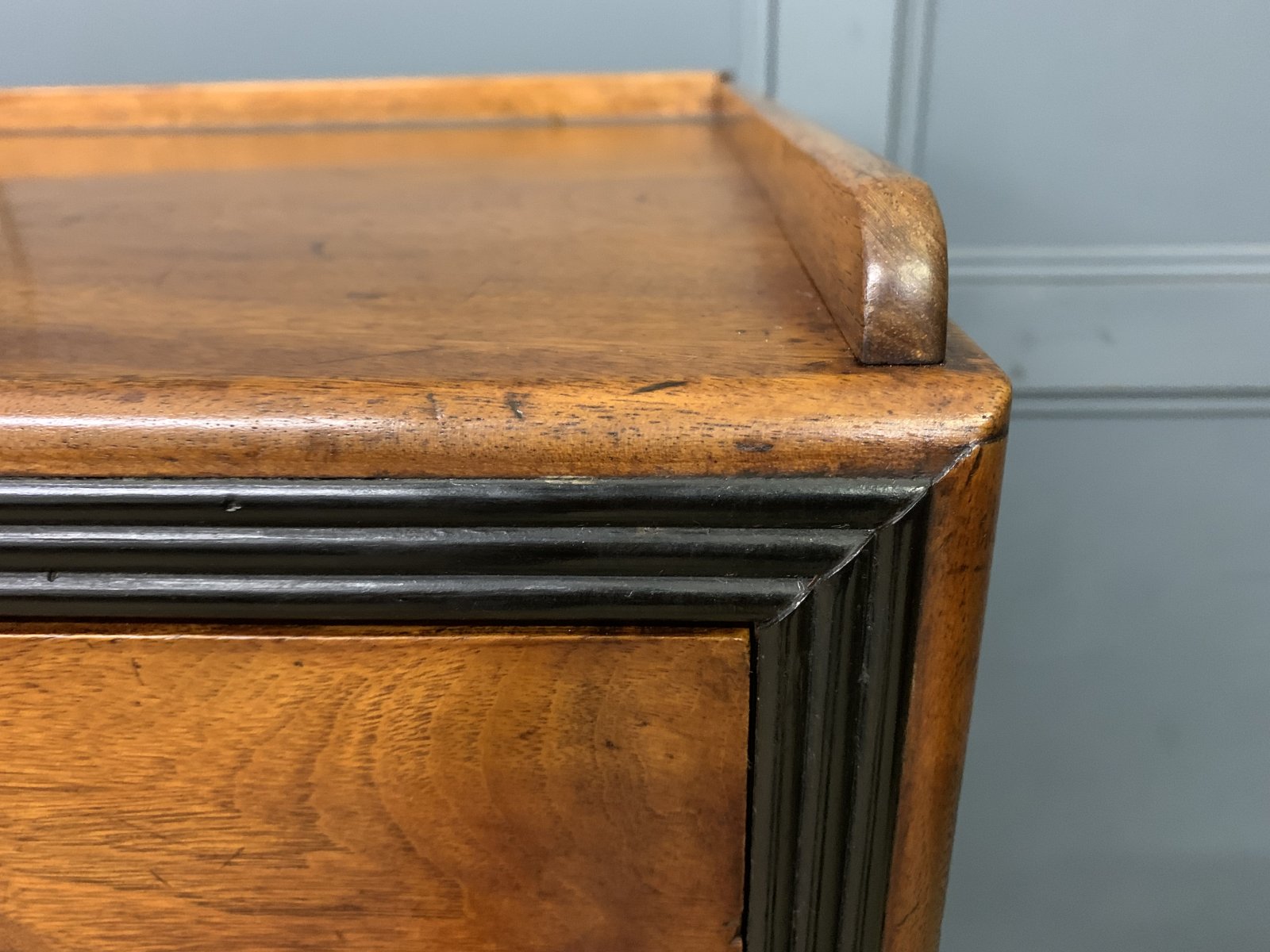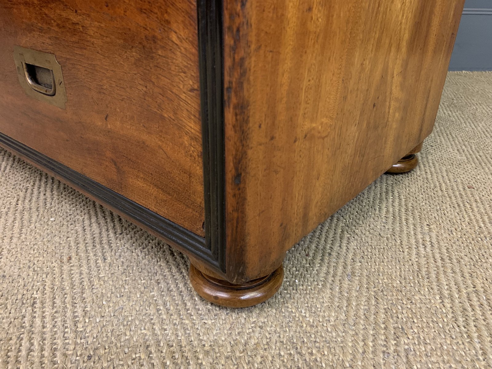 A very fine example of a mid 19th century military chest of drawers. Of colonial origin, most likely Anglo-Indian and dating to 1830-1840. Of excellent construction is solid camphorwood and finished with ebony moldings. Fitted with original solid brass recessed handles. Splits into 2 sections for ease of installation. The top section with a secretaire drawer flanked by shorter drawers and with a long drawer above. The bottom section with 3 long drawers. All drawers are lockable (key supplied). The secretaire drawer opens to reveal a fitted interior , complete with a sumptuous black leather writing surface. To the top is a gallery (detachable) and the whole chest stands on turned bun feet. This chest exudes charm and colonial elegance. Sympathetically refinished in our workshops and now offered for sale in excellent condition, ready to go straight into the home.