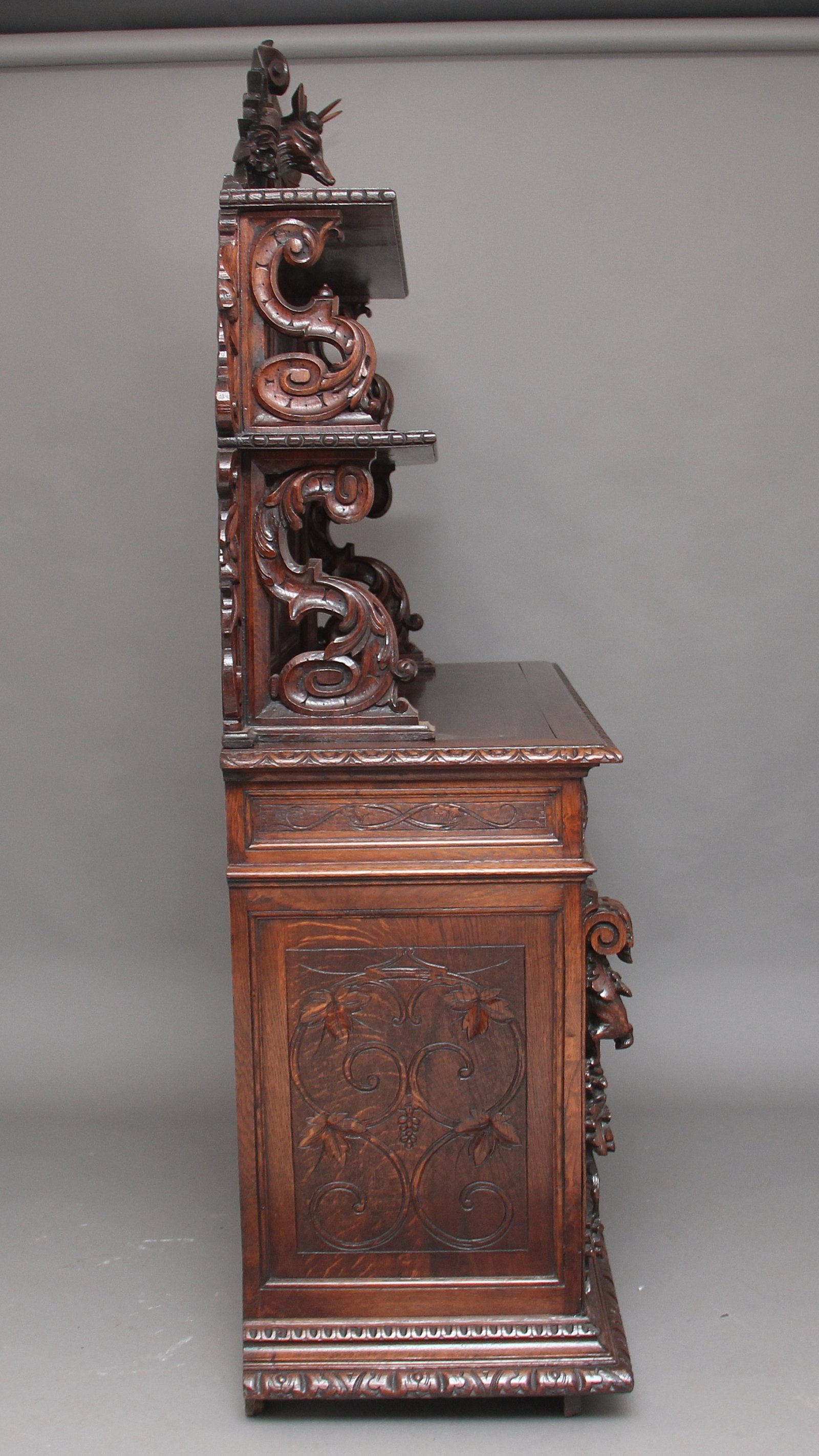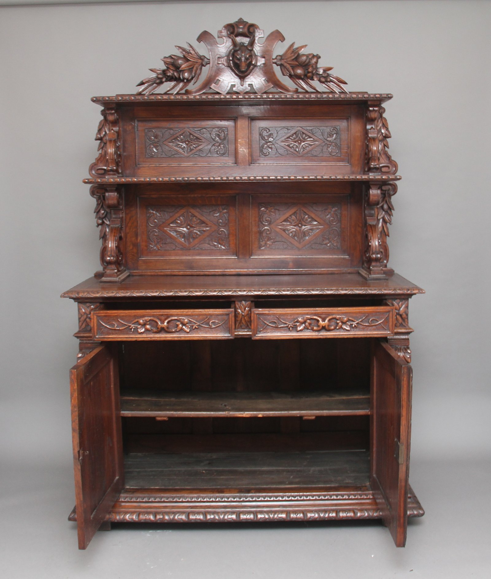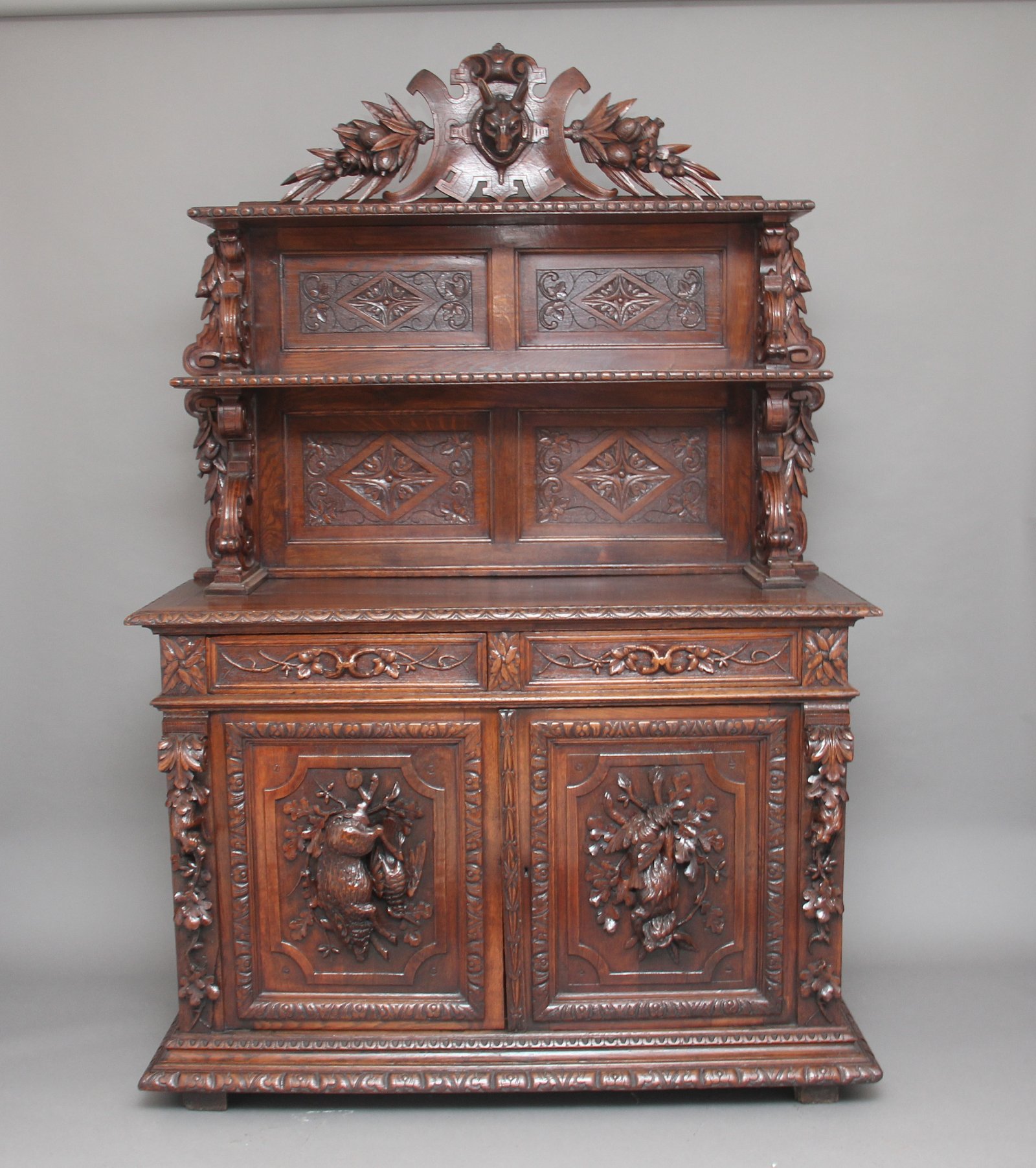 19th Century carved oak buffet, having two doors with hunting trophies on the panels, the two drawers above with carved foliage as handles, above is a super structure with two shelves and a wonderfully carved pediment at the top with a carved deer’s head, the whole piece is profusely carved all over and has a lovely colour to it. Circa 1880.