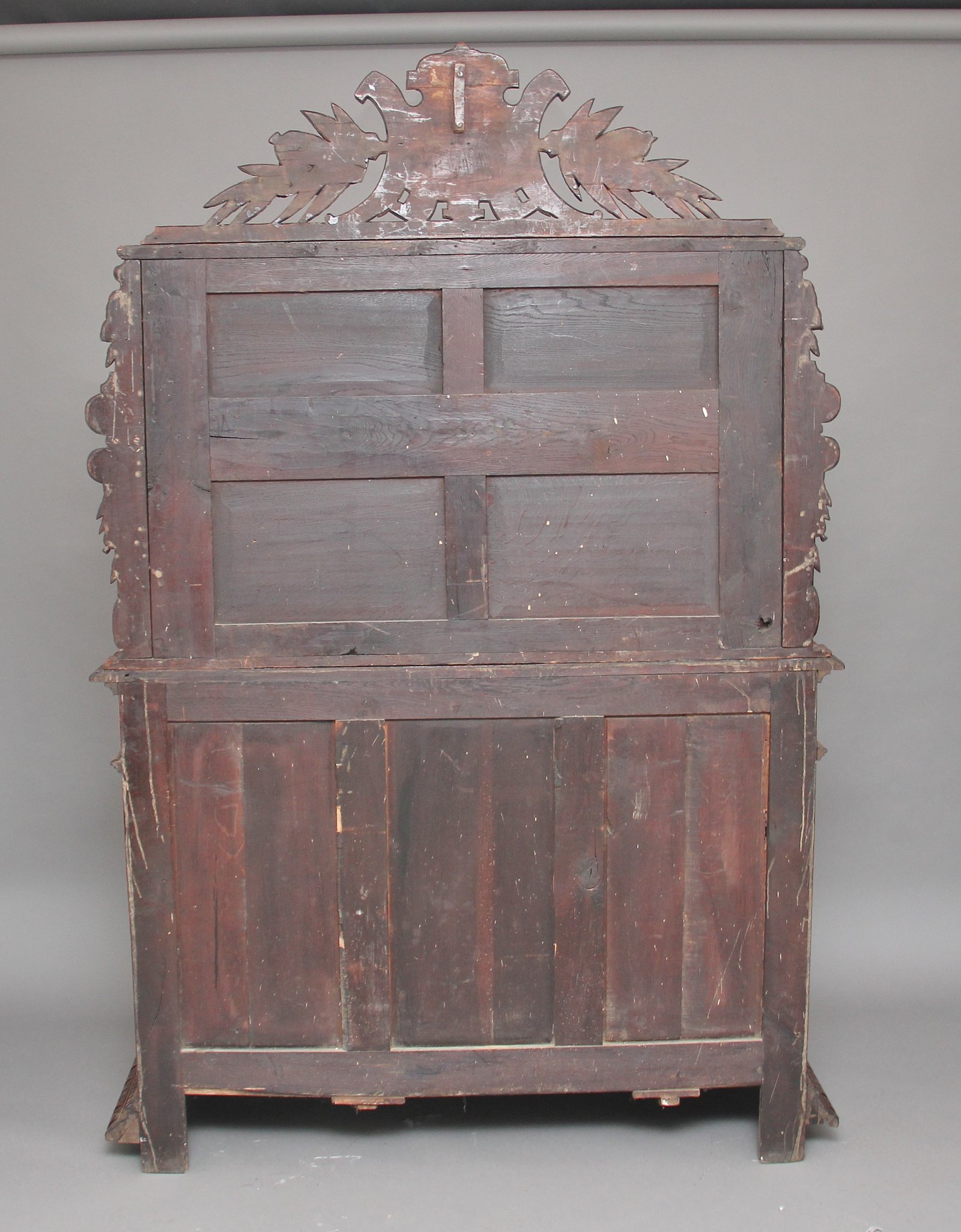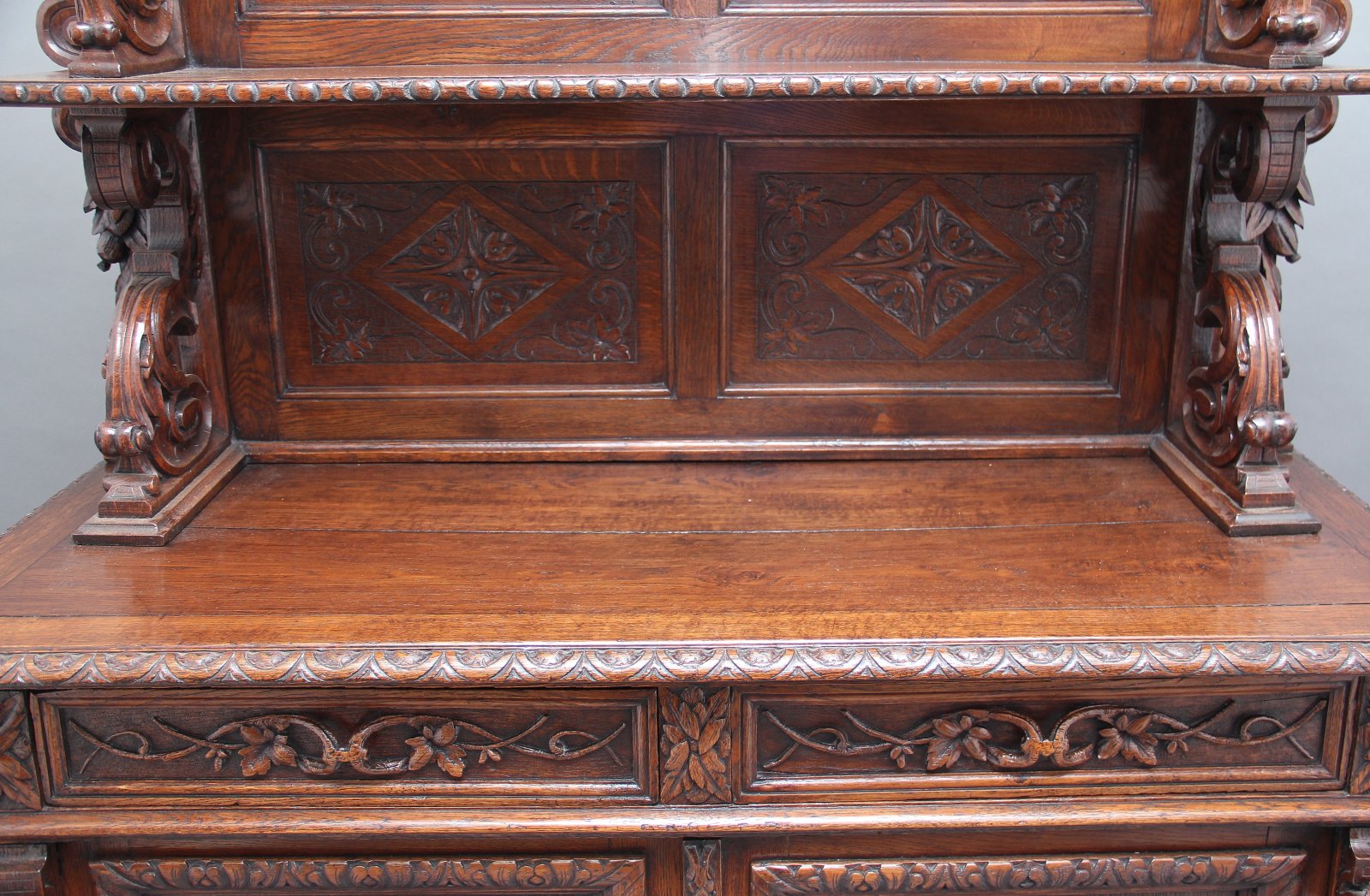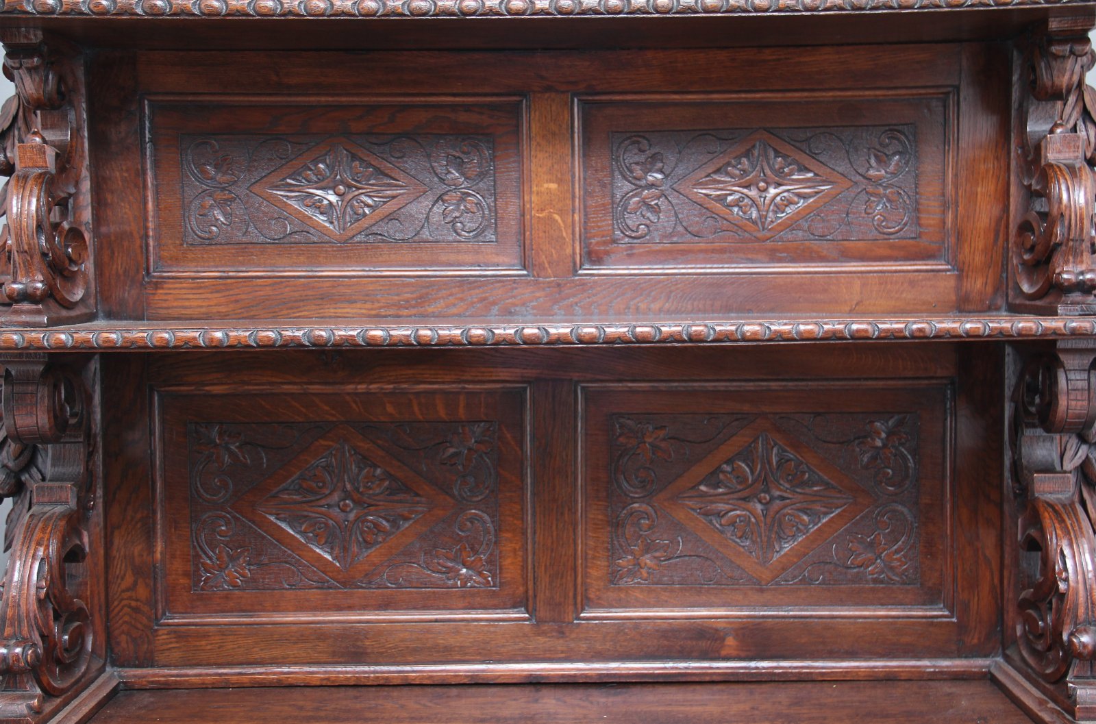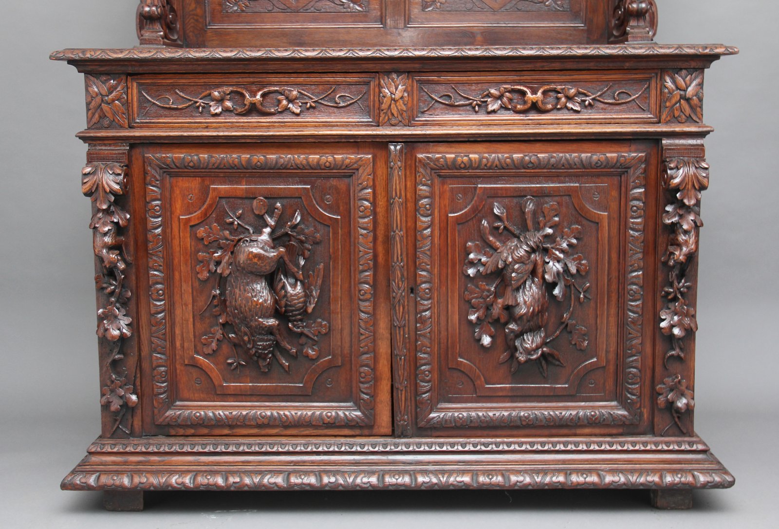 19th Century carved oak buffet, having two doors with hunting trophies on the panels, the two drawers above with carved foliage as handles, above is a super structure with two shelves and a wonderfully carved pediment at the top with a carved deer’s head, the whole piece is profusely carved all over and has a lovely colour to it. Circa 1880.