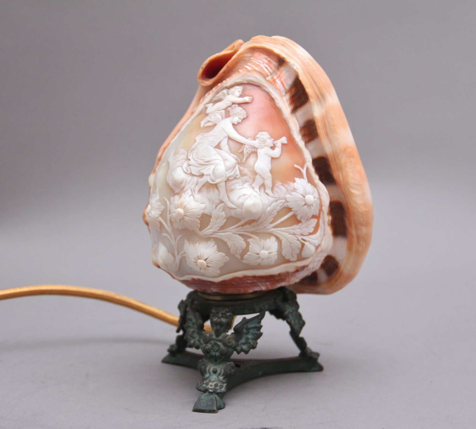 A highly decorative 19th Century Italian carved shell lamp mounted on a carved brass stand, crafted from a genuine conch shell, with the design meticulously hand-carved in relief to create a "cameo" effect, the carving depicts classical or mythological scenes which includes a classical maiden accompanied by figures of Cupid, the shell is mounted on a decorative brass stand depicting winged creatures. In good working order and in excellent condition. Circa 1880.