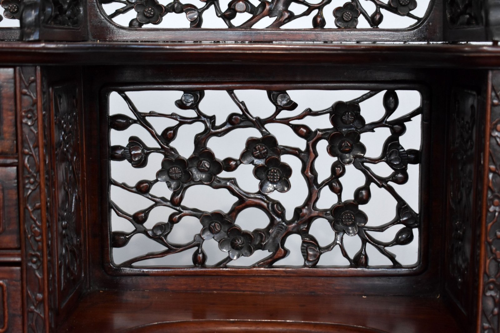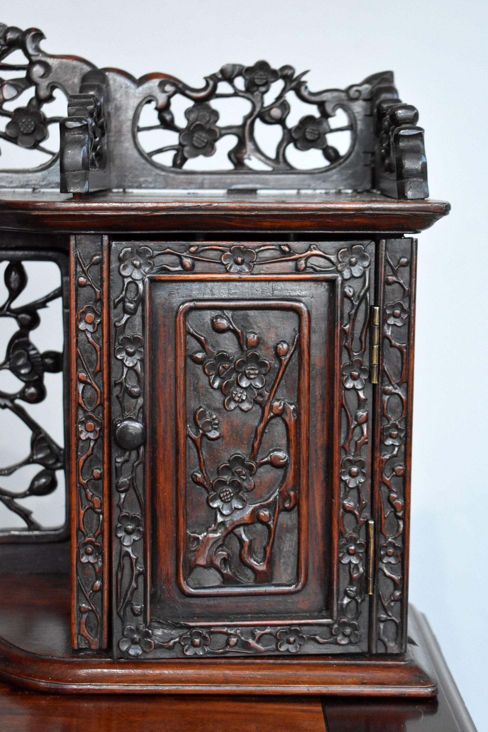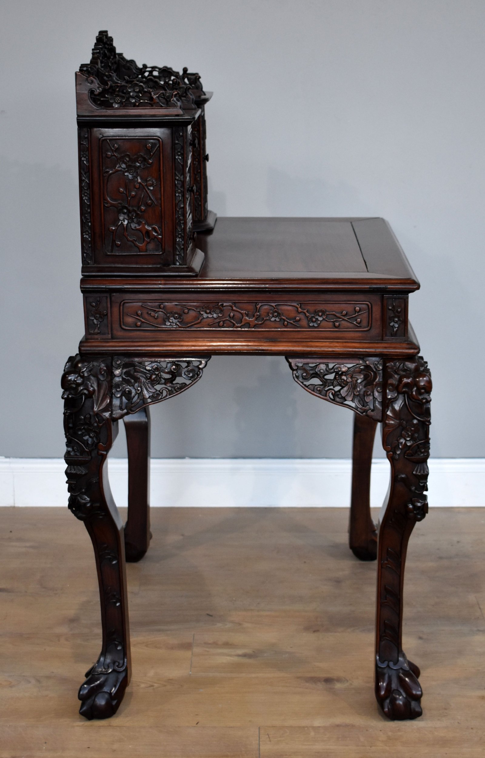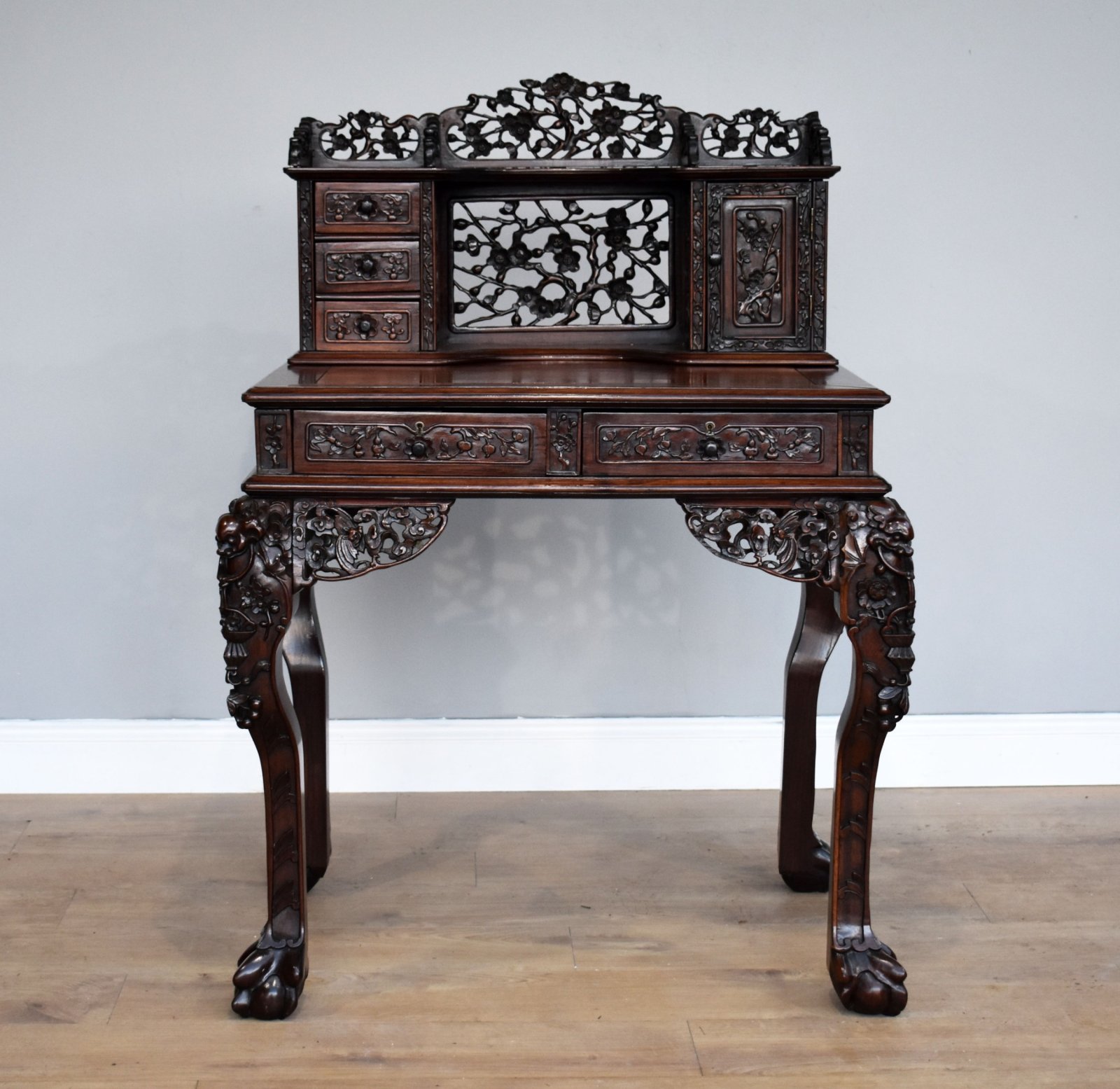 For sale is a good quality 19th Century Carved Padouk Wood Desk, having a row of small drawers, and a rectangular door enclosing stationery divisions, projecting base with drawers to frieze, pierced and carved throughout with blossoming prunus, square section cabriole legs with masks to knees, standing on lion paw feet. The desk is in very good condition for its age.