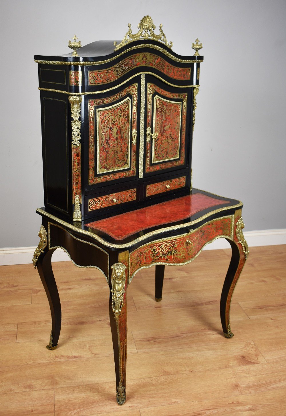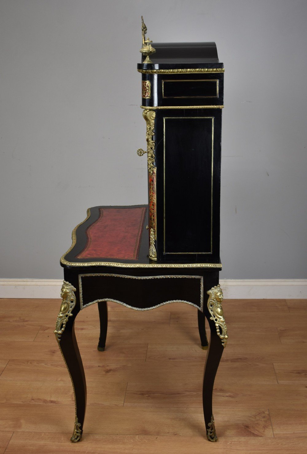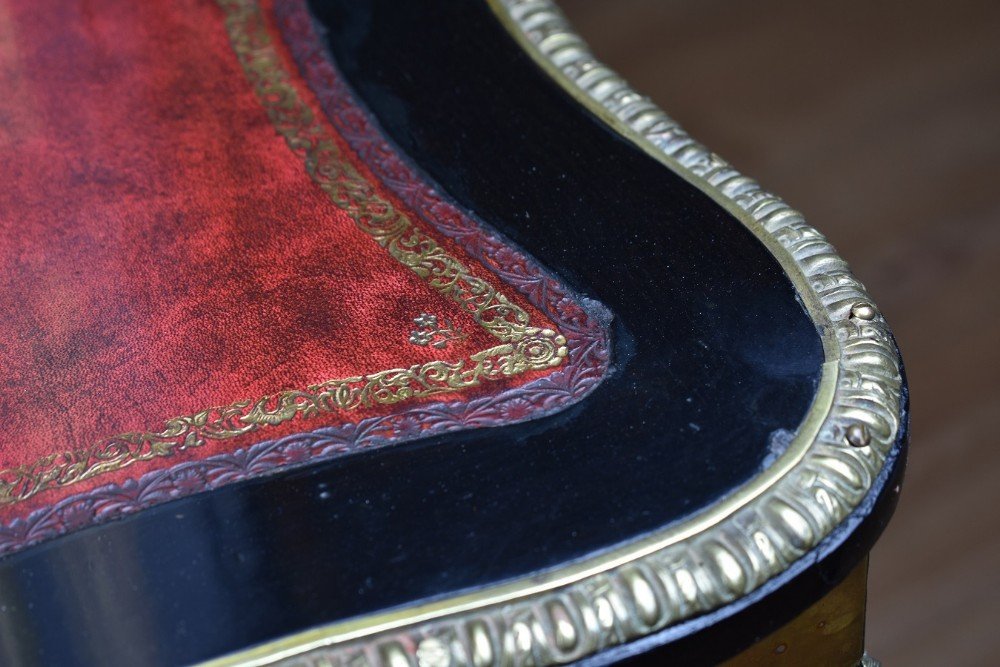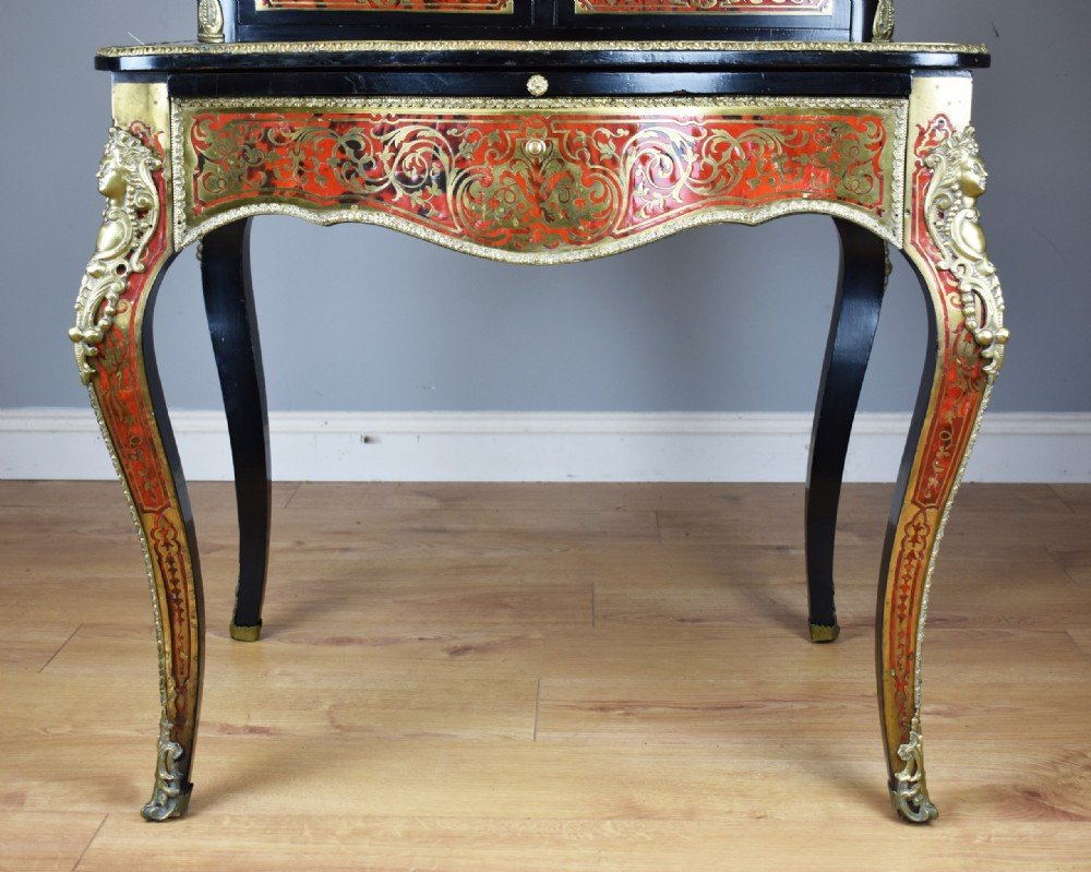 For sale is a fine quality 19th Century Ebonised Boulle Bonheur Du Jour Writing Table. The top, of arched form, has an ornate brass pediment, flanked by a brass urn shaped finial on either side. Below this the two doors, each profusely inlaid with brass, open to reveal a polished interior with a single shelf. The top fits onto the base, which is serpentine in form and has an inset leather hide, hand dyed in a mottled red and black, decorated with both gold and blind tooling. The desk has a pull out slide below, lined with a velvet insert with decorative blind tooling. Below this, a single shaped drawer, also profusely inlaid with brass to match the top, and the legs of the piece. The bonheur du jour is raised on elegantly shaped legs, with ormolu mounts and further inlay, terminating on brass caps. This piece is in excellent condition, having only minor wear commensurate with age and use. A fine piece of furniture which truly highlights the high quality standards and attention to detail that 19th century craftsmen adhered to.