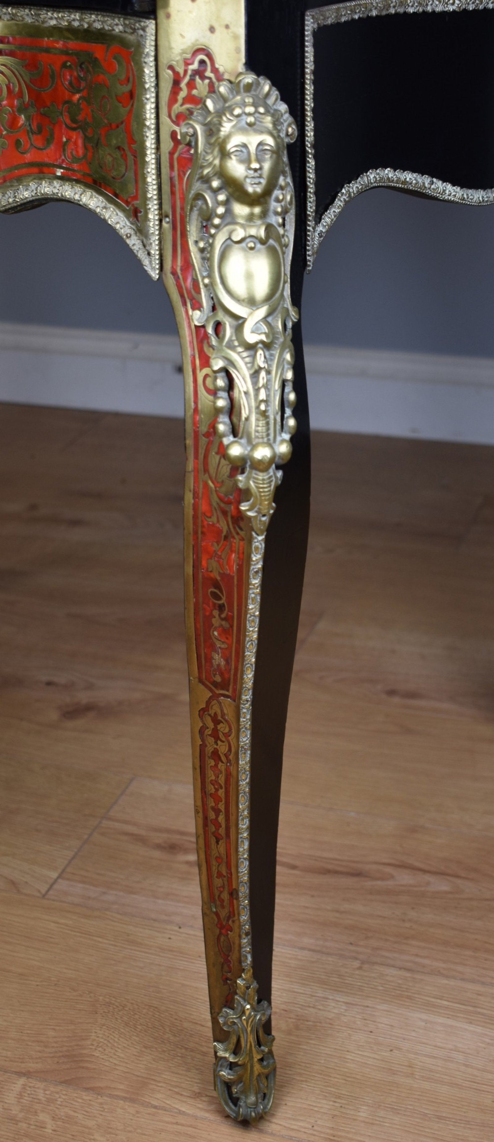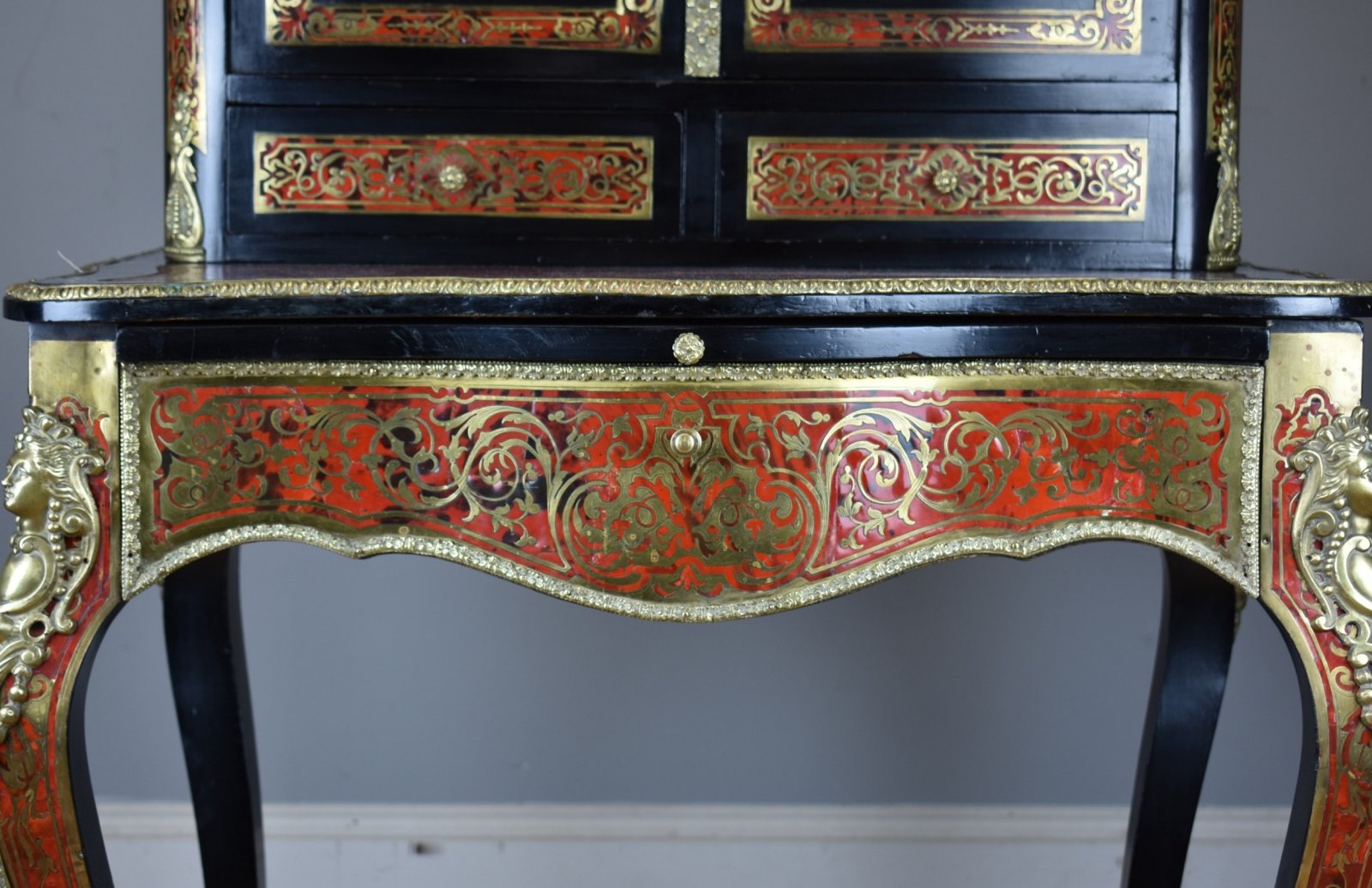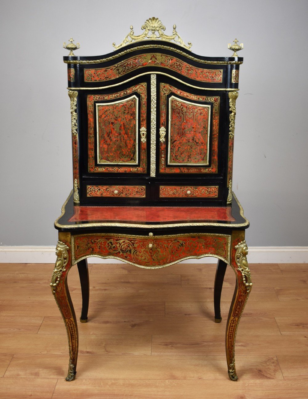 For sale is a fine quality 19th Century Ebonised Boulle Bonheur Du Jour Writing Table. The top, of arched form, has an ornate brass pediment, flanked by a brass urn shaped finial on either side. Below this the two doors, each profusely inlaid with brass, open to reveal a polished interior with a single shelf. The top fits onto the base, which is serpentine in form and has an inset leather hide, hand dyed in a mottled red and black, decorated with both gold and blind tooling. The desk has a pull out slide below, lined with a velvet insert with decorative blind tooling. Below this, a single shaped drawer, also profusely inlaid with brass to match the top, and the legs of the piece. The bonheur du jour is raised on elegantly shaped legs, with ormolu mounts and further inlay, terminating on brass caps. This piece is in excellent condition, having only minor wear commensurate with age and use. A fine piece of furniture which truly highlights the high quality standards and attention to detail that 19th century craftsmen adhered to.