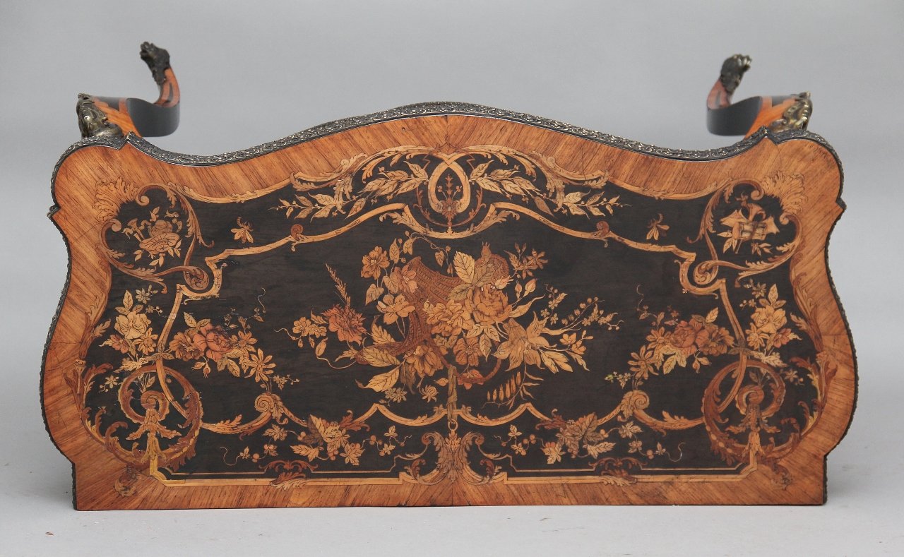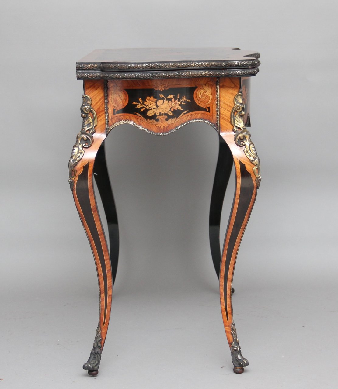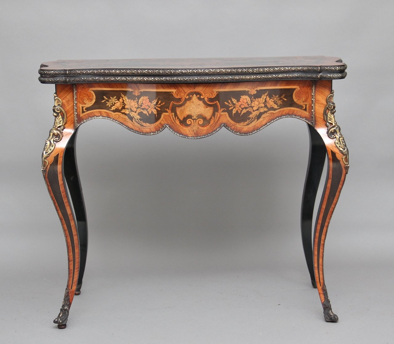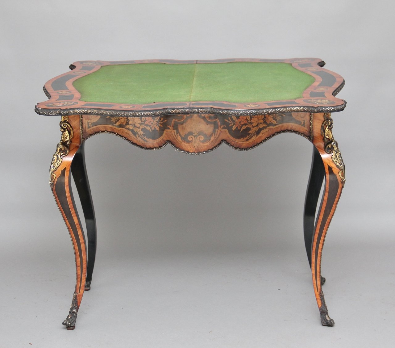 An exhibition quality 19th Century free standing French ebonised marquetry & ormolu card table crossbanded in Kingwood, the shaped top with ormolu decoration on the edge, profusely inlaid with floral marquetry on the top, the centre of the top inlaid with a basket of flowers, below is a nicely shaped frieze with ormolu decoration and floral marquetry, the top opens up to reveal a baize lined playing surface with an inlaid border, the table stands on four cabriole legs with lovely quality ormolu mounts. Circa 1870.