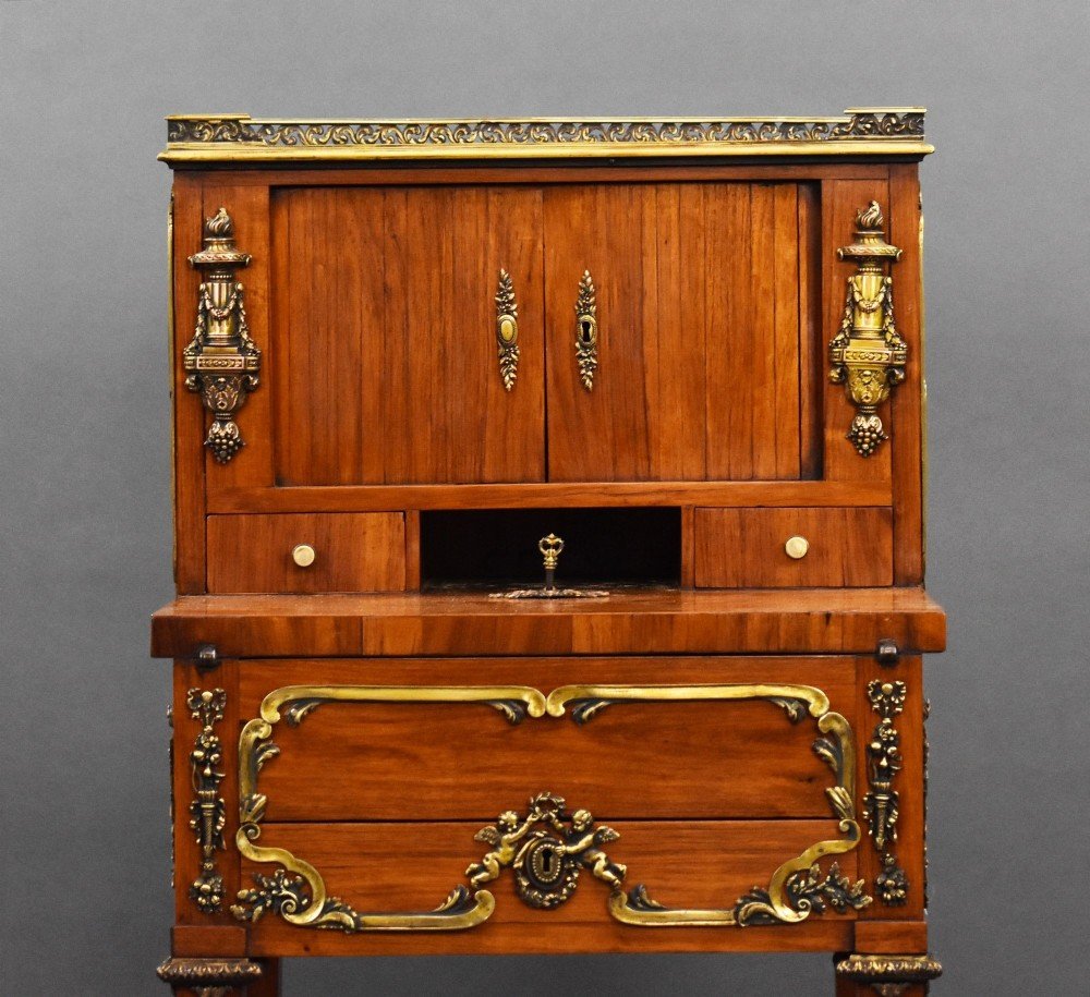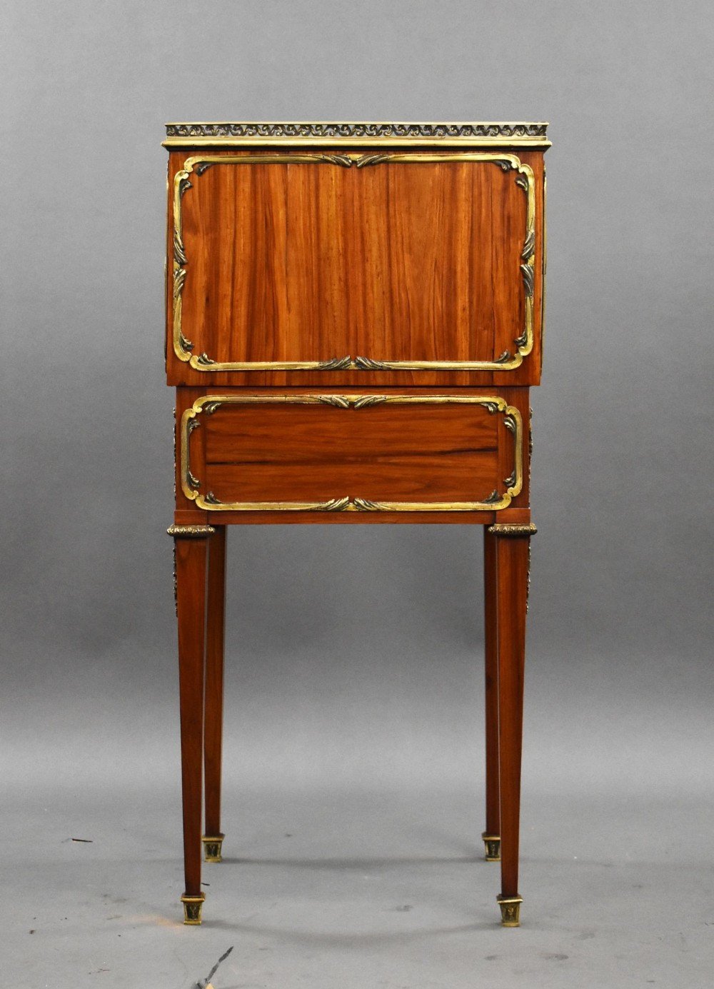 Raised on tapered legs with cast sabots and trailing floral mounts, the piece features an upper cabinet flanked by classical urn appliqués, a shaped brass gallery, and gilt embellishments throughout. Below, a frieze drawer with central escutcheon opens to reveal a fitted writing surface with an internal velvet-lined compartment. The craftsmanship and gilded detailing are of high quality, showcasing both French artistry and neoclassical influence.