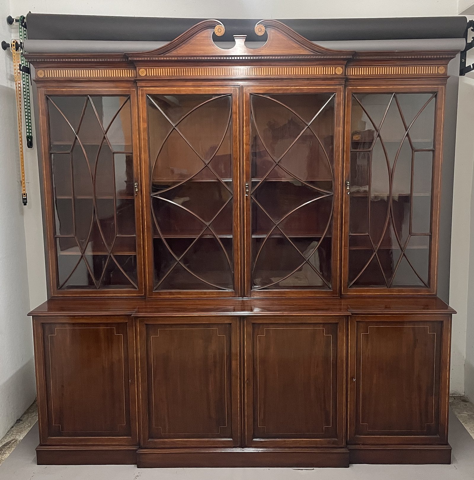 A fabulous quality 19th Century inlaid mahogany breakfront bookcase, having a moulded edge cornice with dentil moulding and a swan neck pediment at the centre with decorative circular fan inlays, the frieze below having further decorative inlay, having four astrigal glazed doors below opening to reveal three adjustable shelves at the sides and two adjustable shelves at the centre, the bottom section having four inlaid panelled doors opening to reveal two adjustable shelves in each section, supported on a plinth base. The bookcase is in excellent condition and having a nice warm rich mahogany colour. Circa 1880.