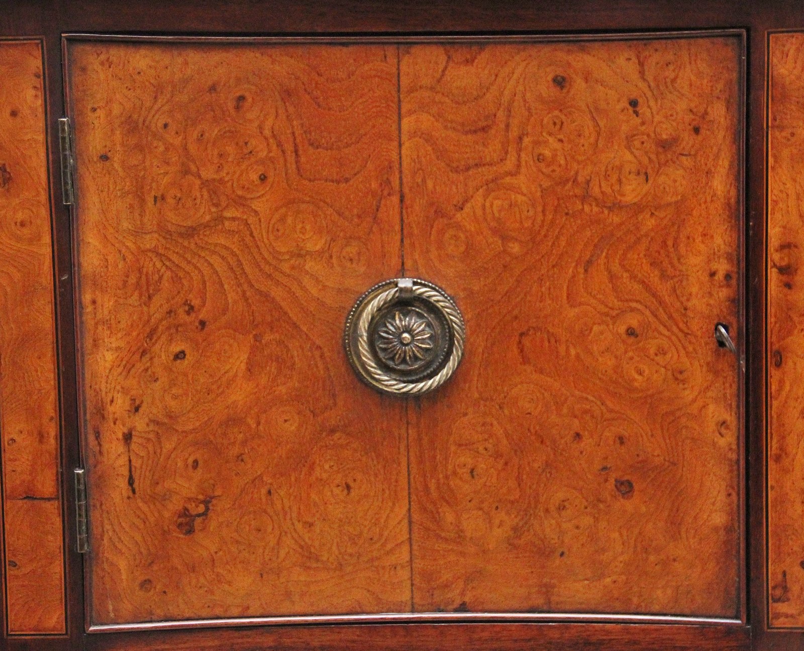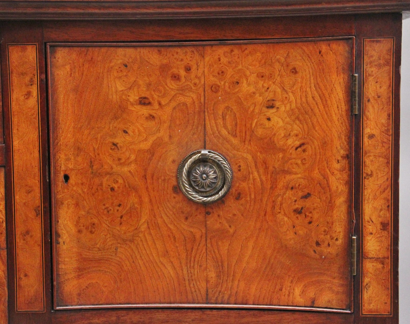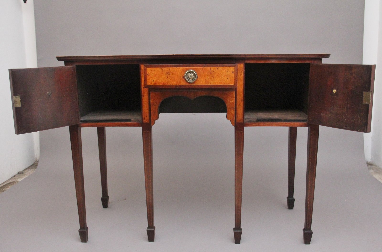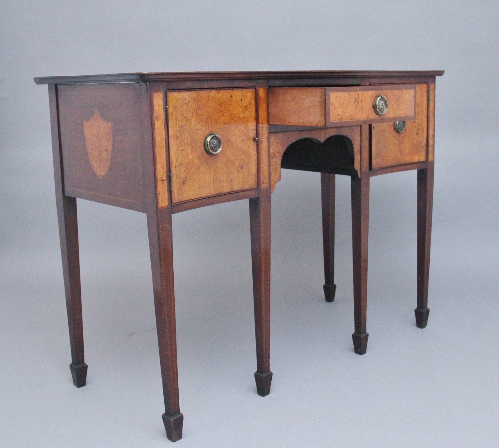 19th Century mahogany and burr elm sideboard by "The Woodworkers Ltd, Kilkenny" Having a fabulous shaped and figured top with burr elm crossbanding, a central mahogany lined drawer flanked either side by cupboards, burr elm door / drawer fronts and having brass engraved ring handles, decorative shaped apron below the central drawer, the sides of the sideboard having burr elm shield panels and having a border of fine inlay, supported on inlaid square tapering legs terminating on spade feet. Circa 1890.