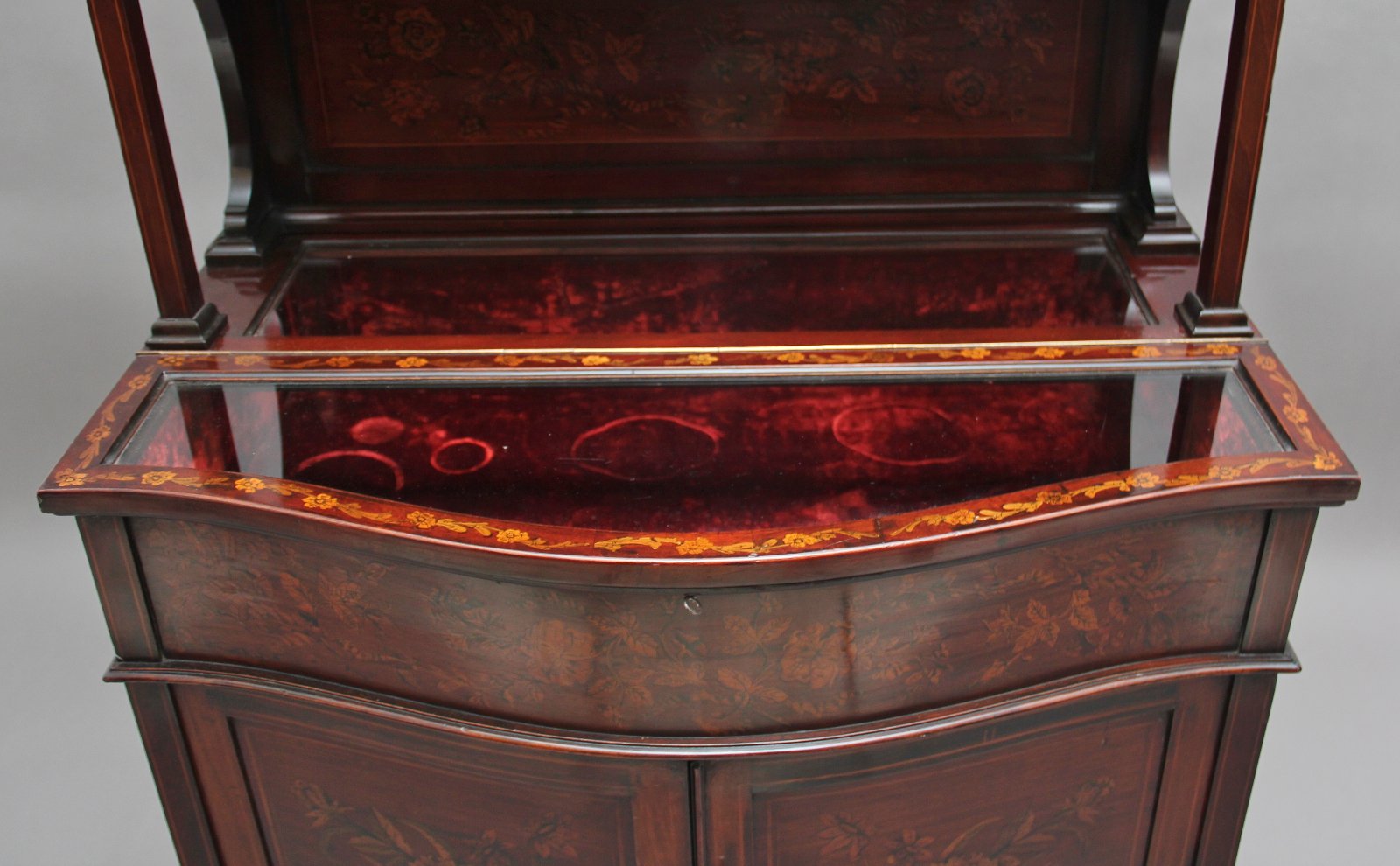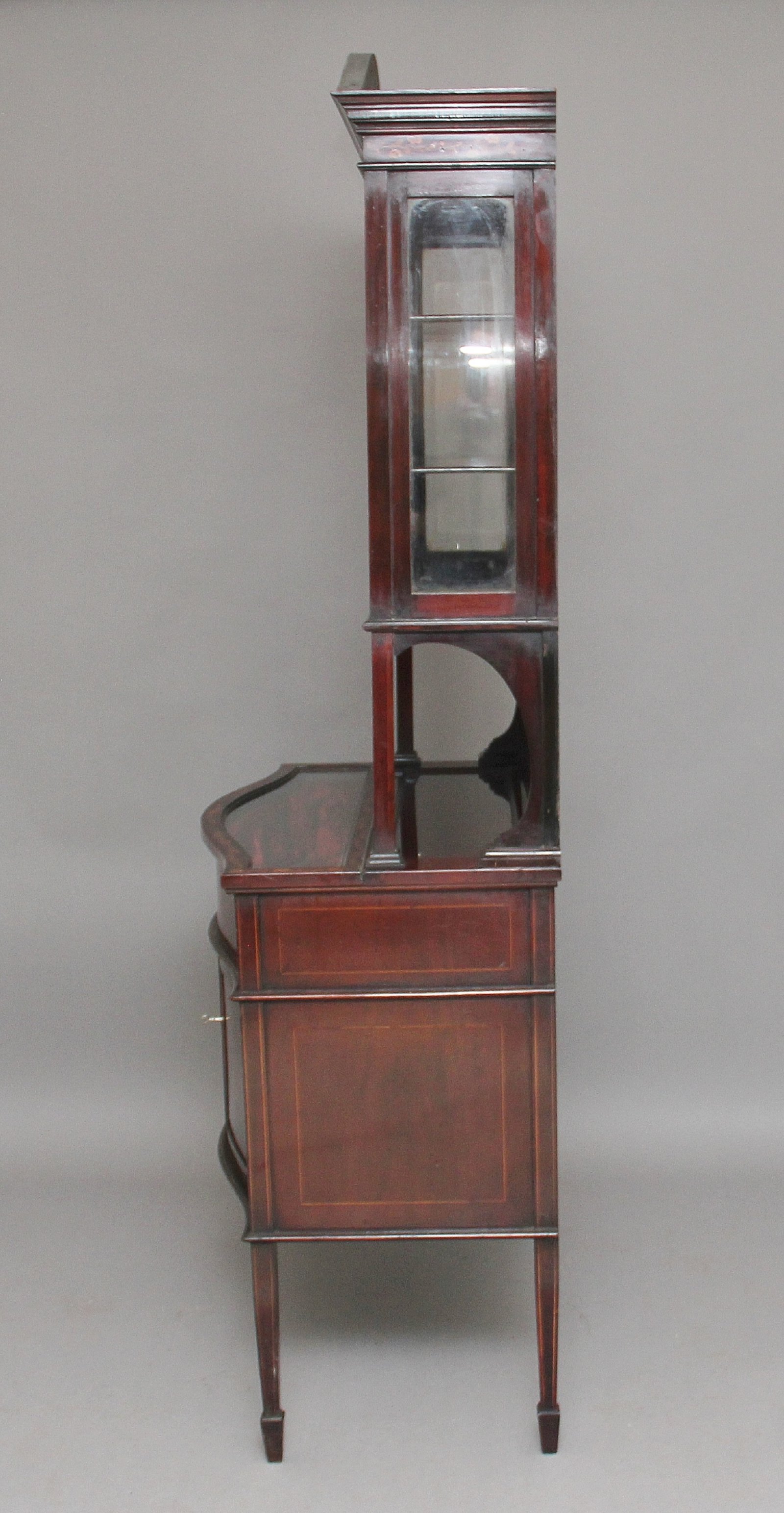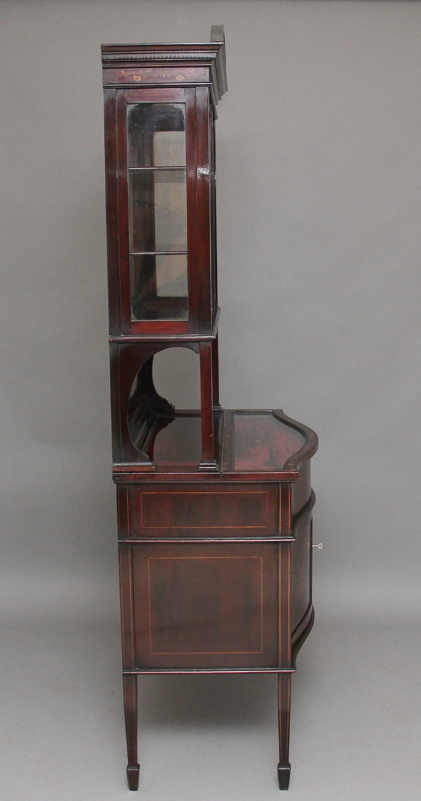 A Sheraton revival mahogany and marquetry inlaid display cabinet, the top section having a shaped cornice above twin glazed doors opening to reveal two fitted shelves and a mirror back, the bottom section of serpentine form having a hinged left up lid to reveal a velvet lined interior, this is above a two door cupboard, supported on square tapering legs ending on spade feet. The whole piece is profusely inlaid all over and in excellent condition. Circa 1880.