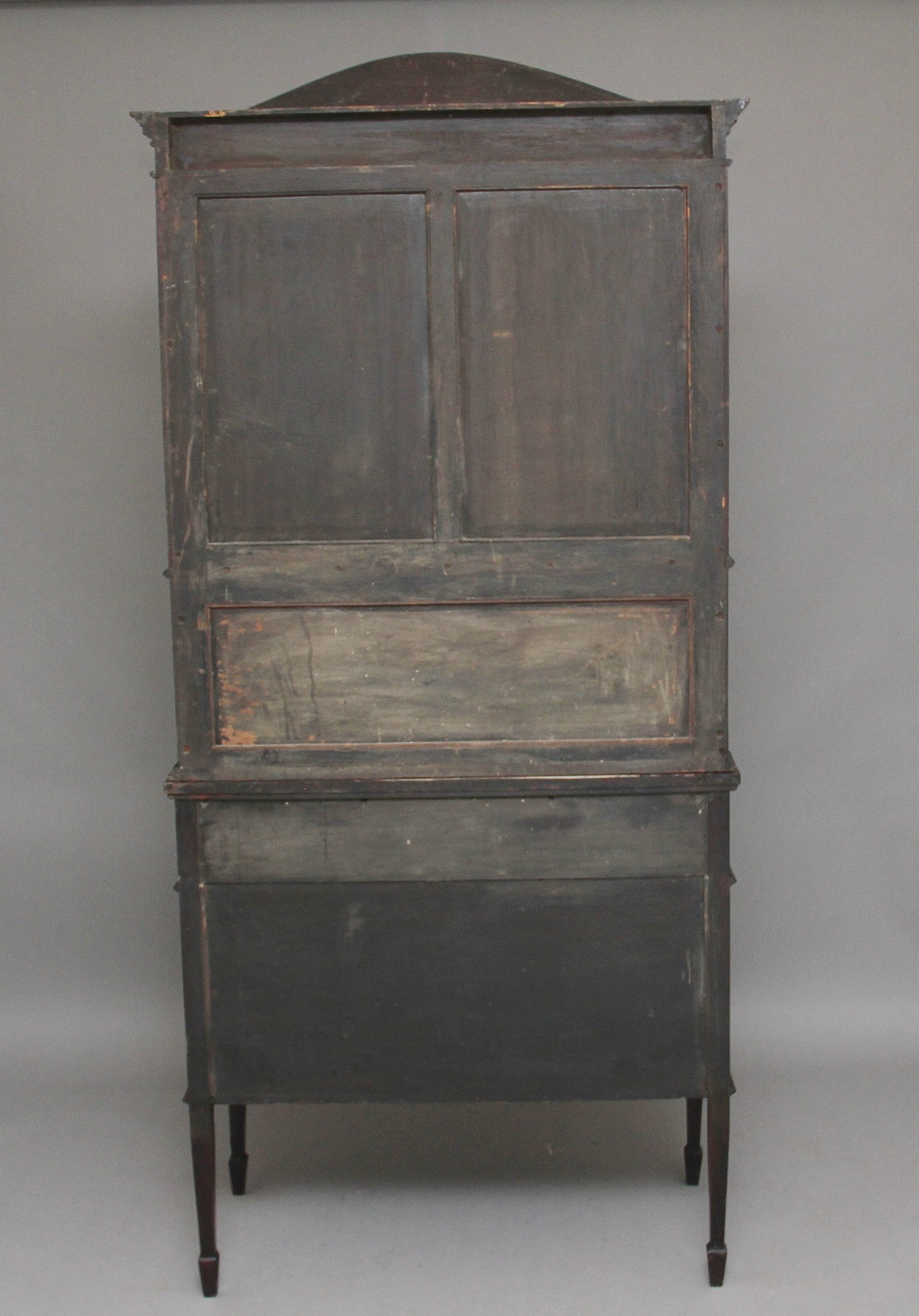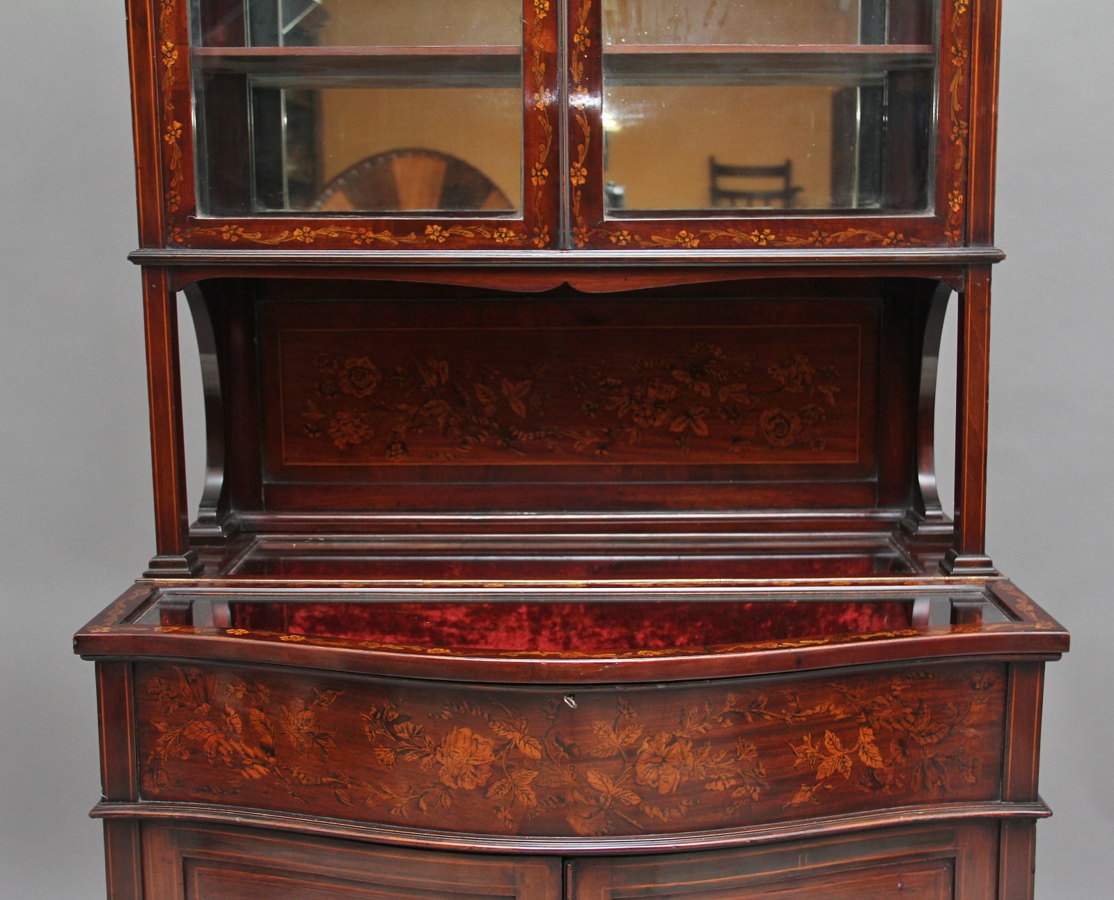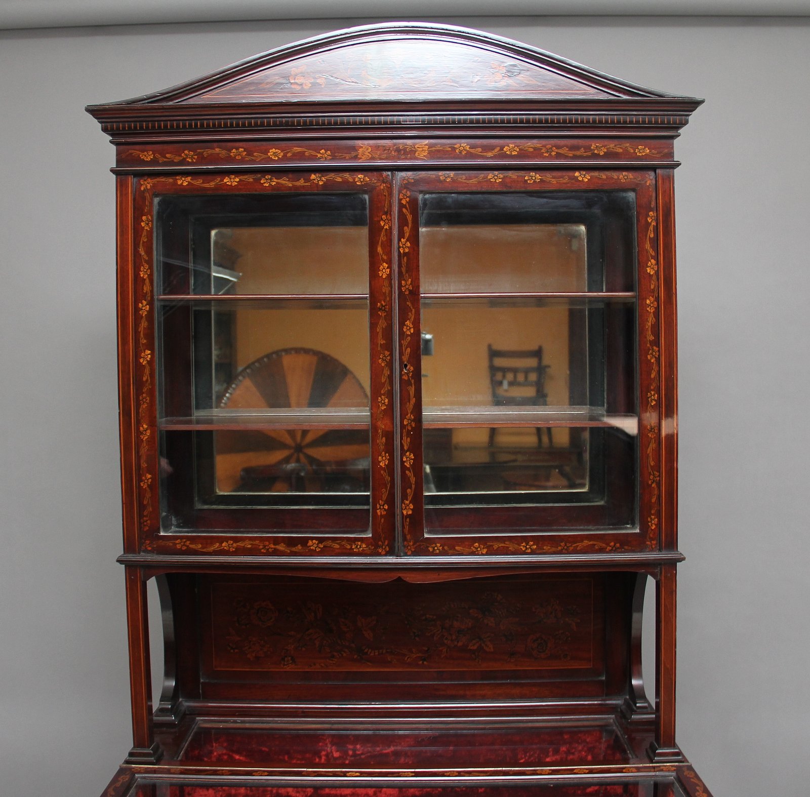 A Sheraton revival mahogany and marquetry inlaid display cabinet, the top section having a shaped cornice above twin glazed doors opening to reveal two fitted shelves and a mirror back, the bottom section of serpentine form having a hinged left up lid to reveal a velvet lined interior, this is above a two door cupboard, supported on square tapering legs ending on spade feet. The whole piece is profusely inlaid all over and in excellent condition. Circa 1880.